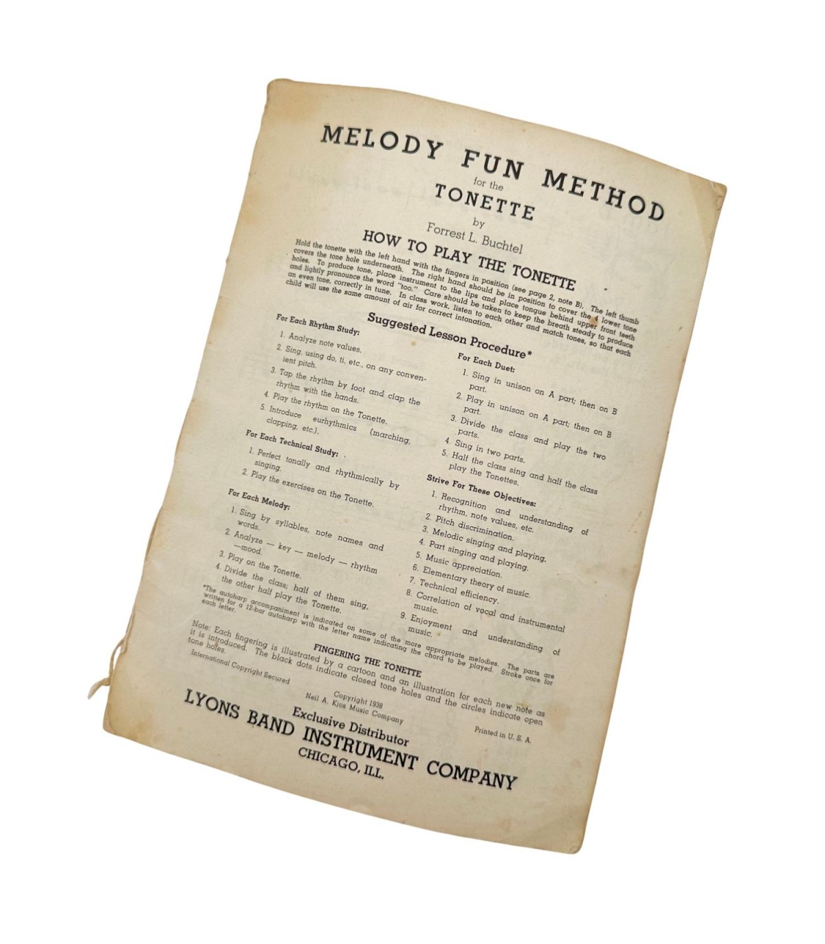 Petite livret d'apprentisage pour Tonette (flûte) utilisé par les civiles mais également distribuées aux soldats américains pendant la seconde guerre mondiale.