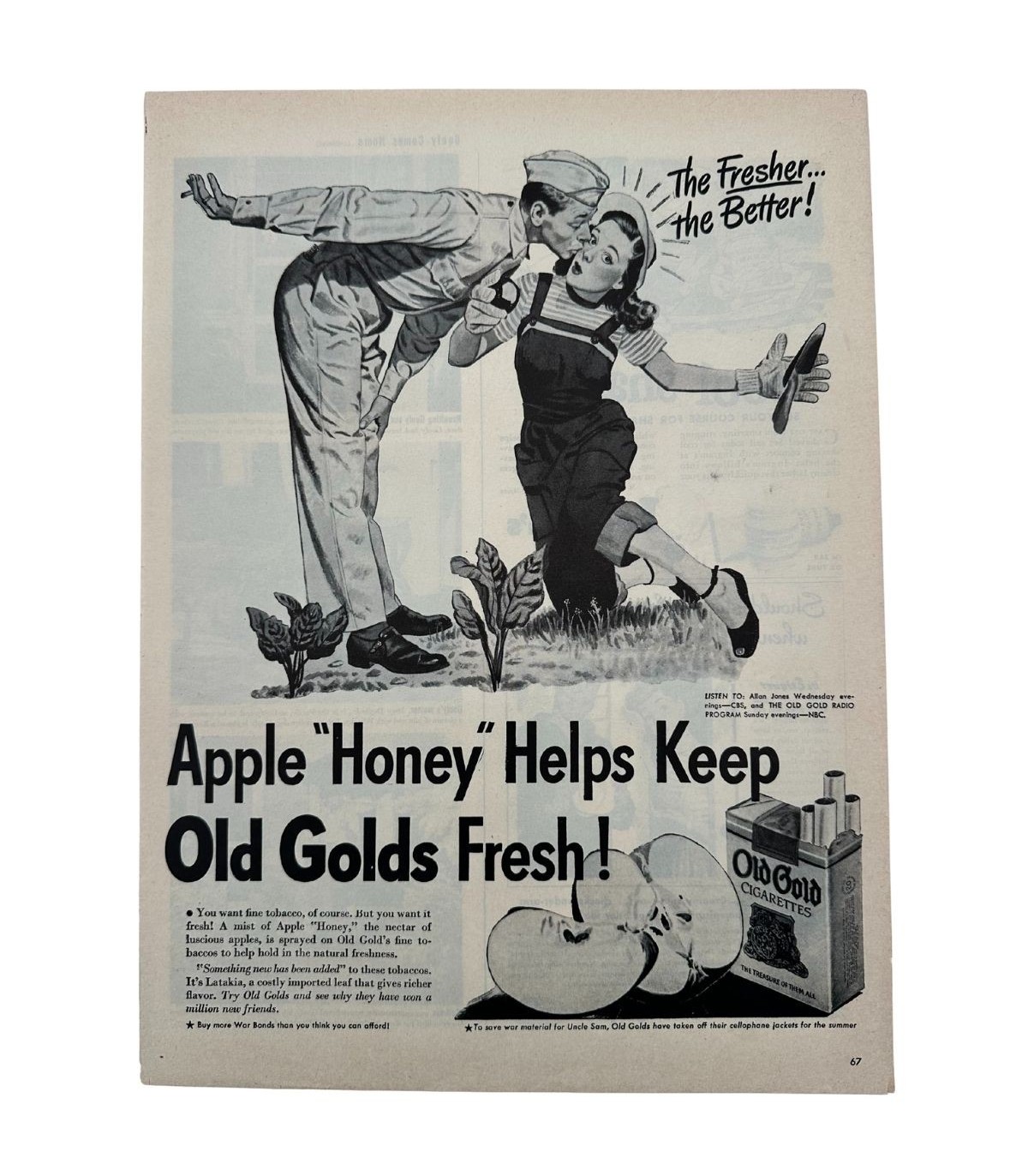 La marque OLD GOLD, propriété de P. Lorillard Company, était l'une des marques de cigarettes les plus populaires et les plus activement commercialisées pendant la Seconde Guerre Mondiale. Les publicités de cette période sont particulièrement intéressantes car elles utilisaient souvent un ton patriotique, mettant en scène des soldats, des infirmières ou des ouvriers d'usine pour lier la marque à l'héroïsme et à la vie quotidienne des Américains engagés dans le conflit. Elles véhiculaient un message de réconfort et de normalité dans un monde en crise.