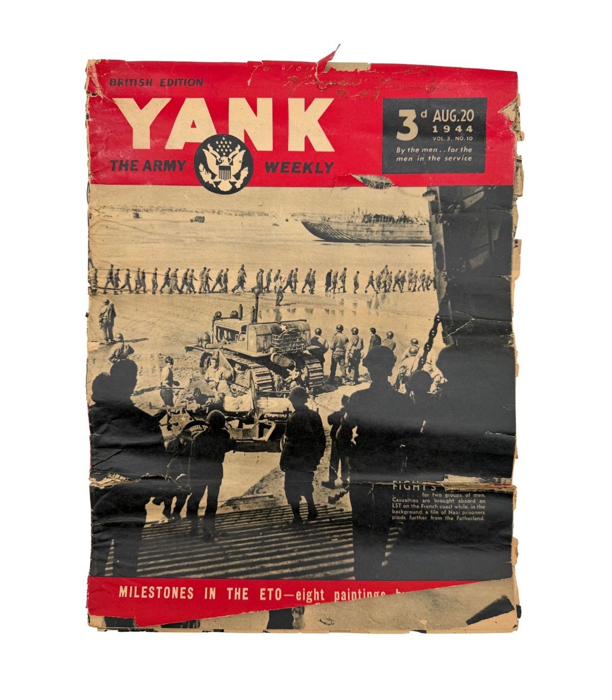 Numéro original de YANK, édition britannique (Vol. 3, No. 10), publié le 20 août 1944. Magazine emblématique écrit “par les hommes… pour les hommes au service”.