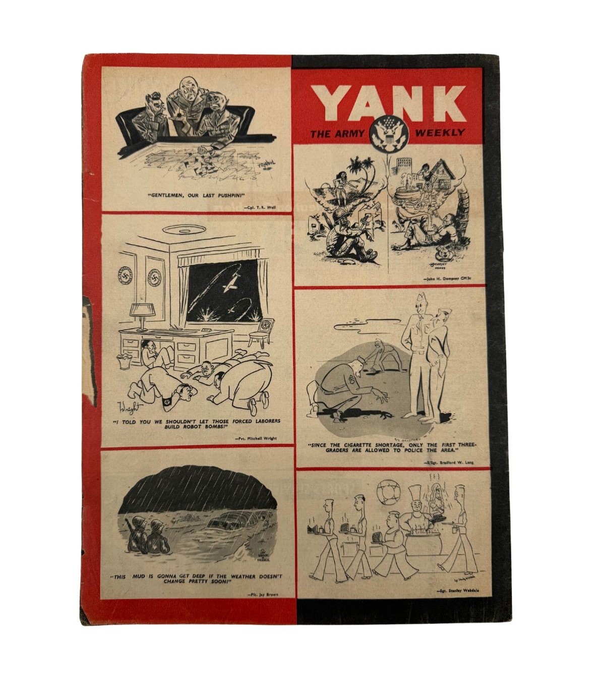 Au dos, vous retrouverez les célèbres caricatures et bandes dessinées qui faisaient le sel de YANK. Ces dessins, réalisés par des soldats pour des soldats, dépeignent avec ironie la boue du front, les pénuries de cigarettes et l'absurdité de la vie militaire. C'est ce mélange unique de gravité et de dérision qui fait de YANK une pièce de collection si prisée.