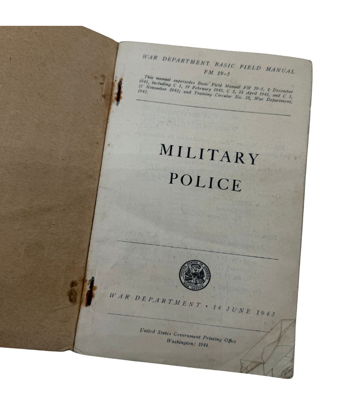 Manuel de campagne officiel FM 19-5 “Military Police”, publié par le War Department et mis à jour en juin 1944, en pleine bataille de Normandie. Document stratégique définissant les missions des MP : gestion des prisonniers, régulation du trafic militaire, maintien de la discipline sur le théâtre européen.