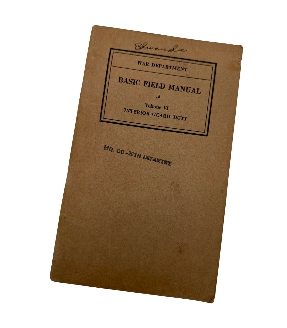 Marquage Régimentaire : Le manuel porte le tampon à l'encre noire "HQ. CO.-26TH INFANTRY" (Compagnie Quartier Général du 26ème Régiment d'Infanterie).