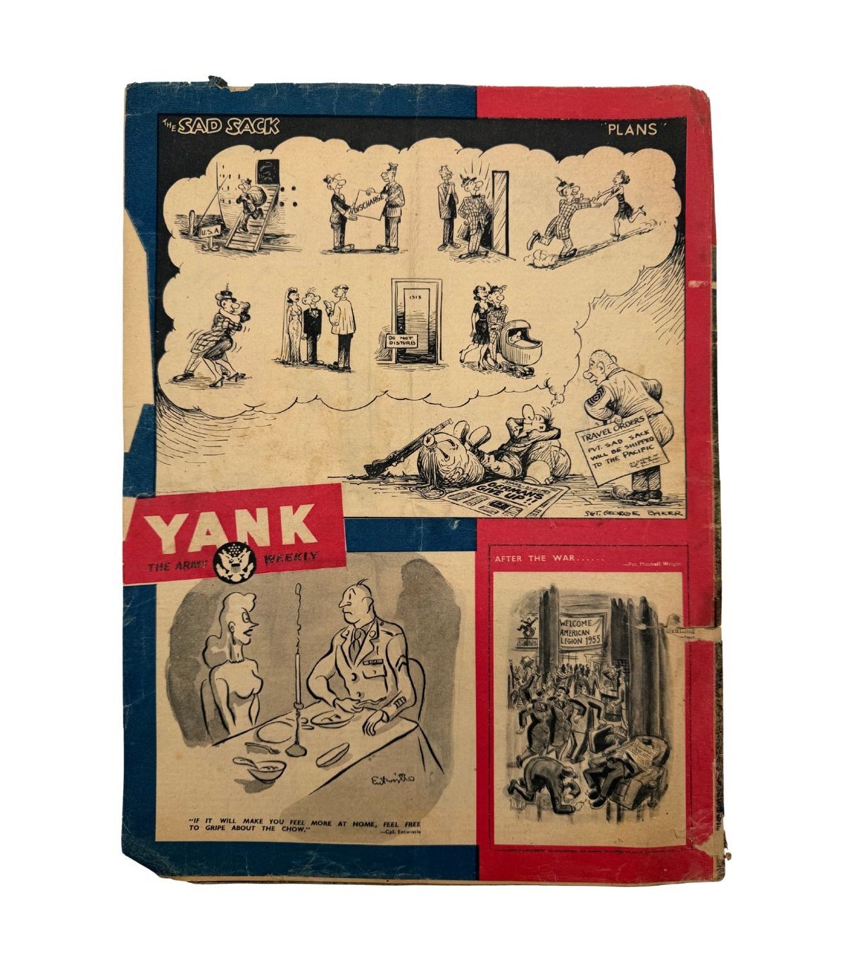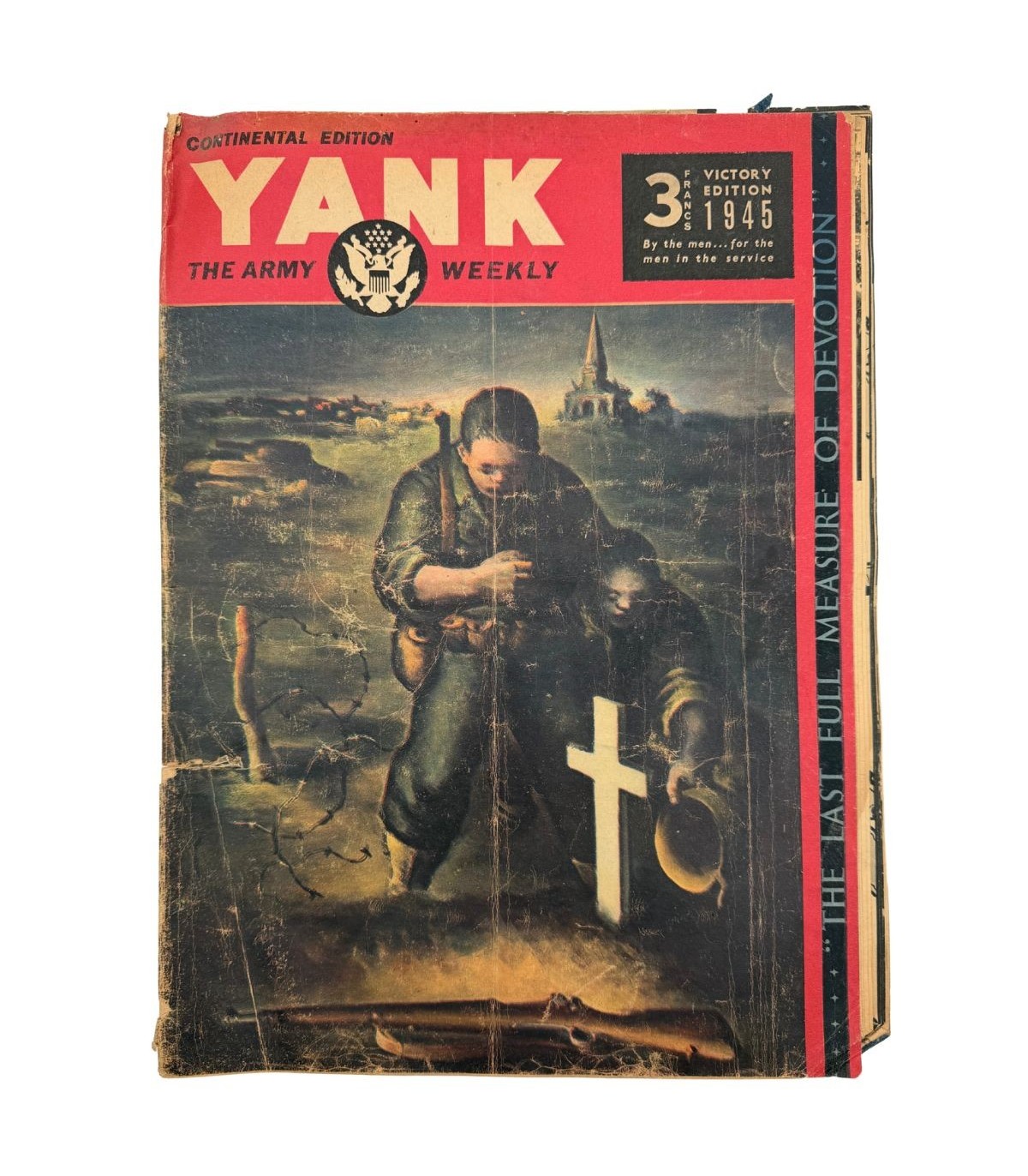Cet exemplaire de YANK, The Army Weekly est une "Victory Edition" parue en 1945. Publiée après la capitulation de l'Allemagne, cette édition continentale (vendue 3 Francs) se distingue par sa tonalité solennelle, rendant hommage à ceux qui ne sont pas rentrés.