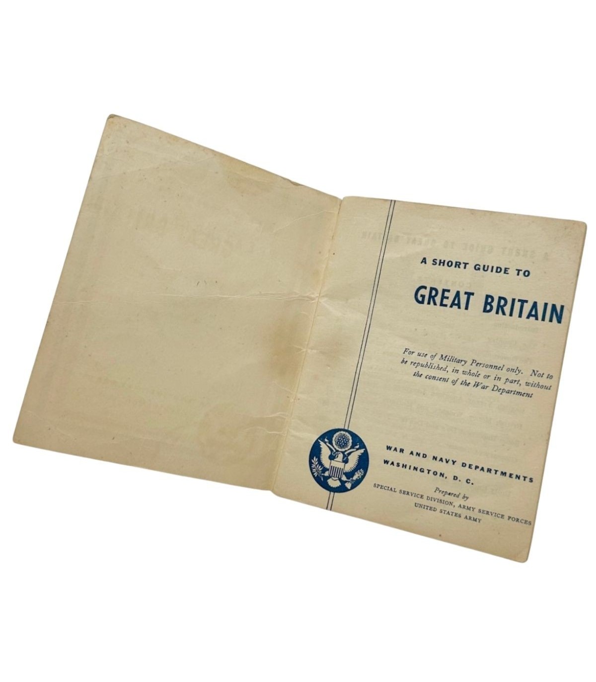 Livret “A Short Guide to Great Britain” pour soldats américains basés en Grande Bretagne. Ce petite livret d'origine deuxième guerre en papier était distribué aux soldats américains pour les aider et comprendre les coutumes locales.