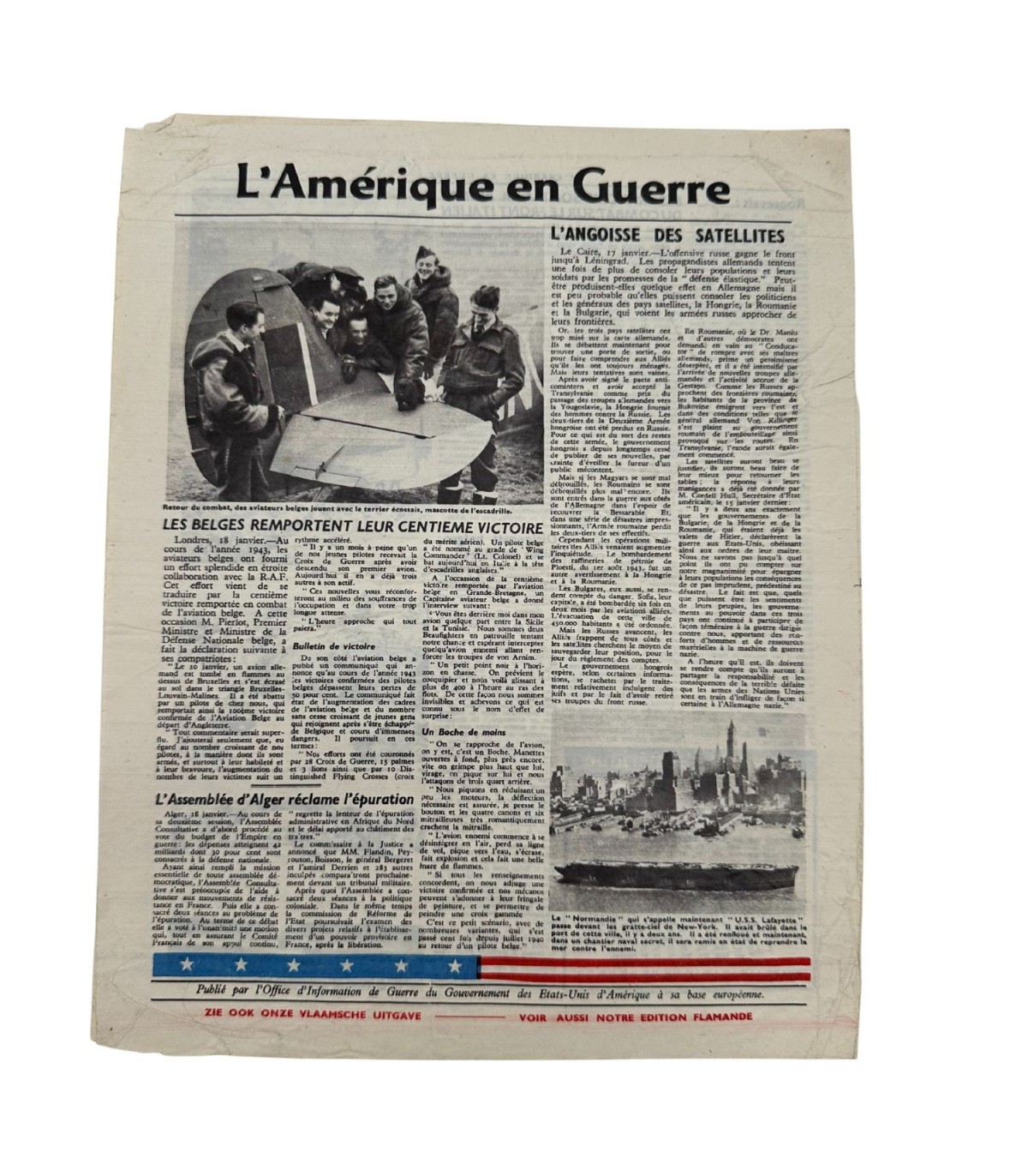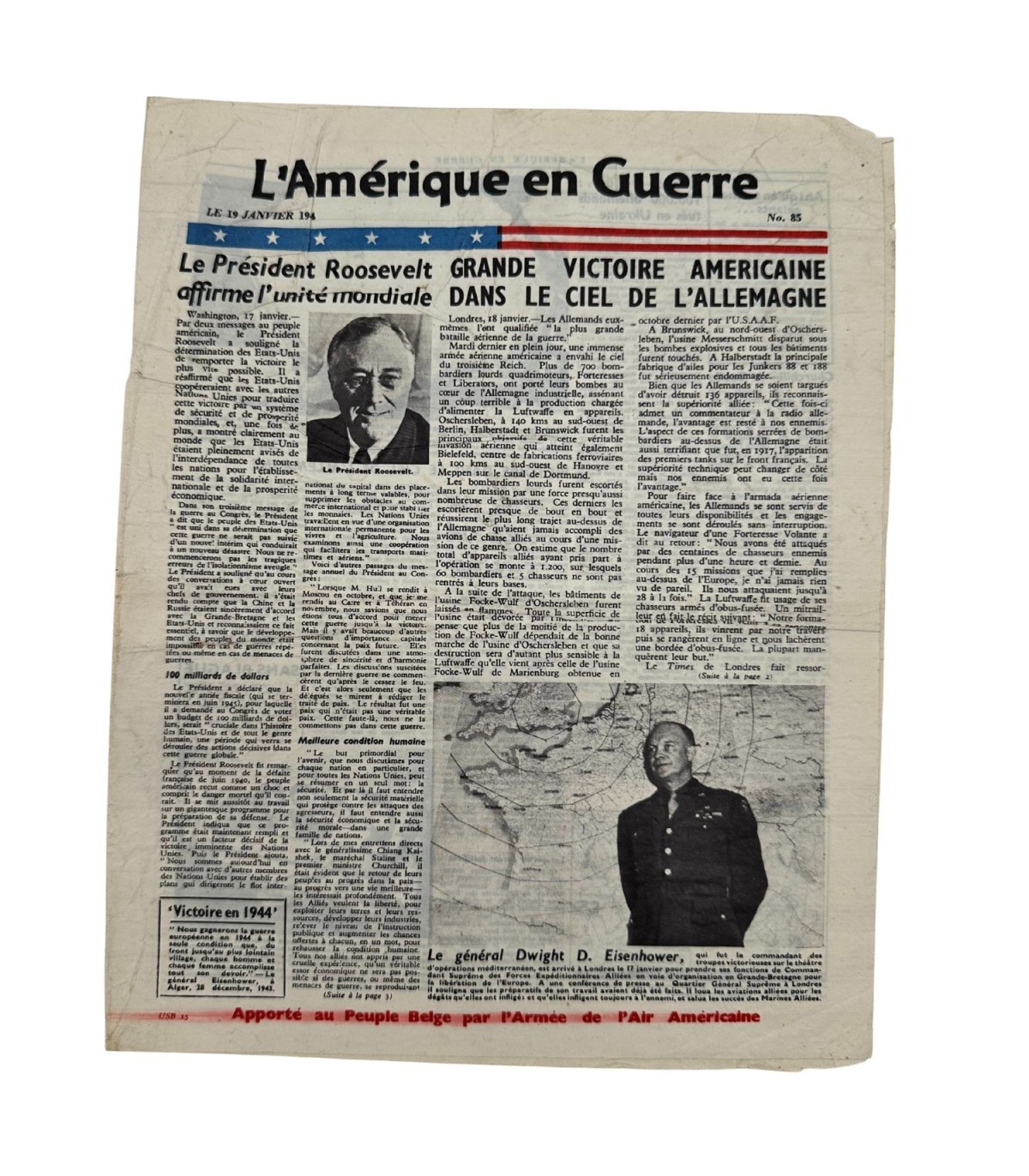 Découvrez un document historique authentique : le numéro 85 du journal de propagande alliée "L’Amérique en Guerre", daté du 19 janvier 1944, distribué par l’Armée de l’Air Américaine au peuple belge pendant l’occupation.