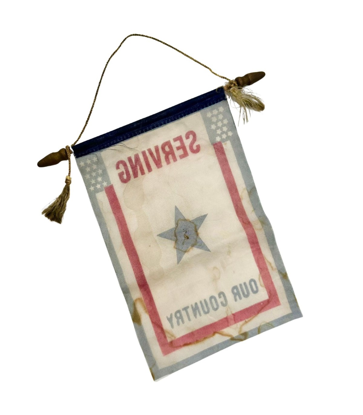 Ce drapeau particulier présente un fond blanc bordé de rouge, avec une étoile bleue centrale, symbole d’un fils engagé dans les forces armées américaines. Il était fièrement accroché dans les fenêtres des foyers dont un ou plusieurs fils servaient sous les drapeaux.