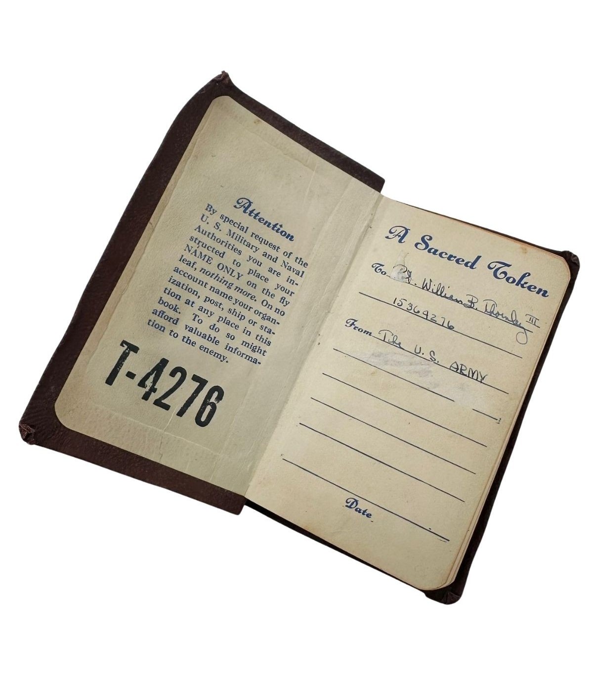 Le New Testament and Psalms est l'un des objets personnels les plus intimes et les plus fréquents du paquetage du soldat américain. Distribués massivement par les aumôniers militaires ou offerts par les familles avant le départ pour le front, ces petits livres de poche étaient conçus pour tenir parfaitement dans la poche de poitrine de la veste de service ou de combat. Pour de nombreux GI's, la lecture des psaumes était une source de force morale et de réconfort spirituel durant les longues attentes dans les trous d'homme ou avant les assauts décisifs en Europe ou dans le Pacifique.