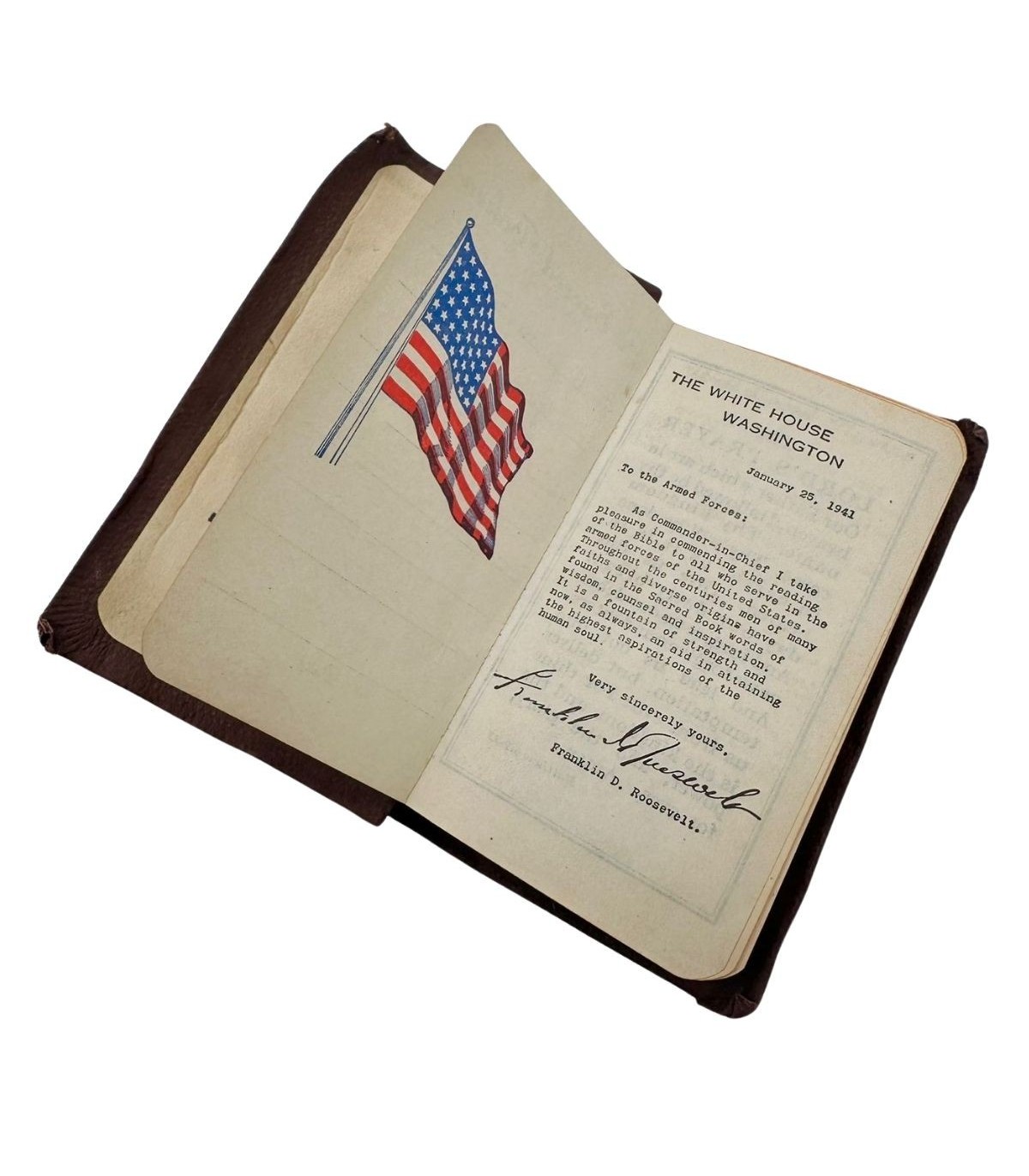 Cette édition originale se caractérise par son format réduit, optimisé pour l'encombrement minimal du fantassin. La couverture, souvent de couleur sombre (brune ou noire), porte parfois le titre doré ou embossé. Les pages, bien que fines, ont été conçues pour résister aux manipulations quotidiennes en campagne. On retrouve fréquemment sur les premières pages une préface ou un message d'encouragement de la part du Président Franklin D. Roosevelt, rappelant l'importance de la foi et des valeurs pour lesquelles les forces alliées se battaient.