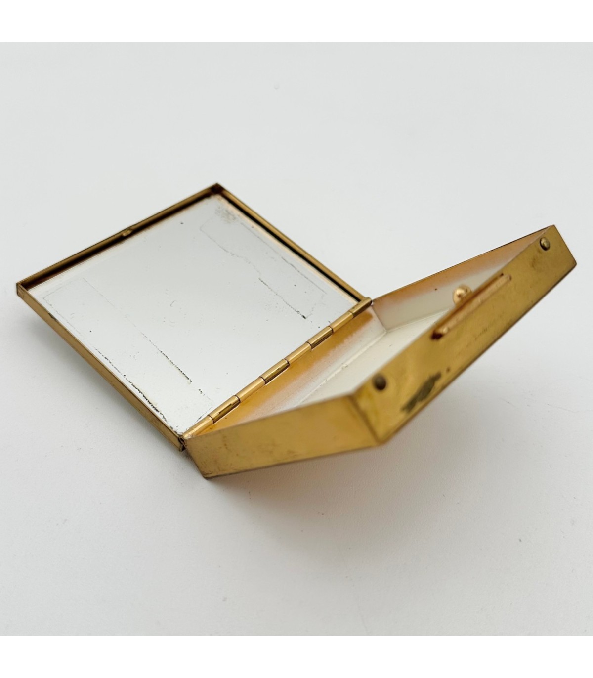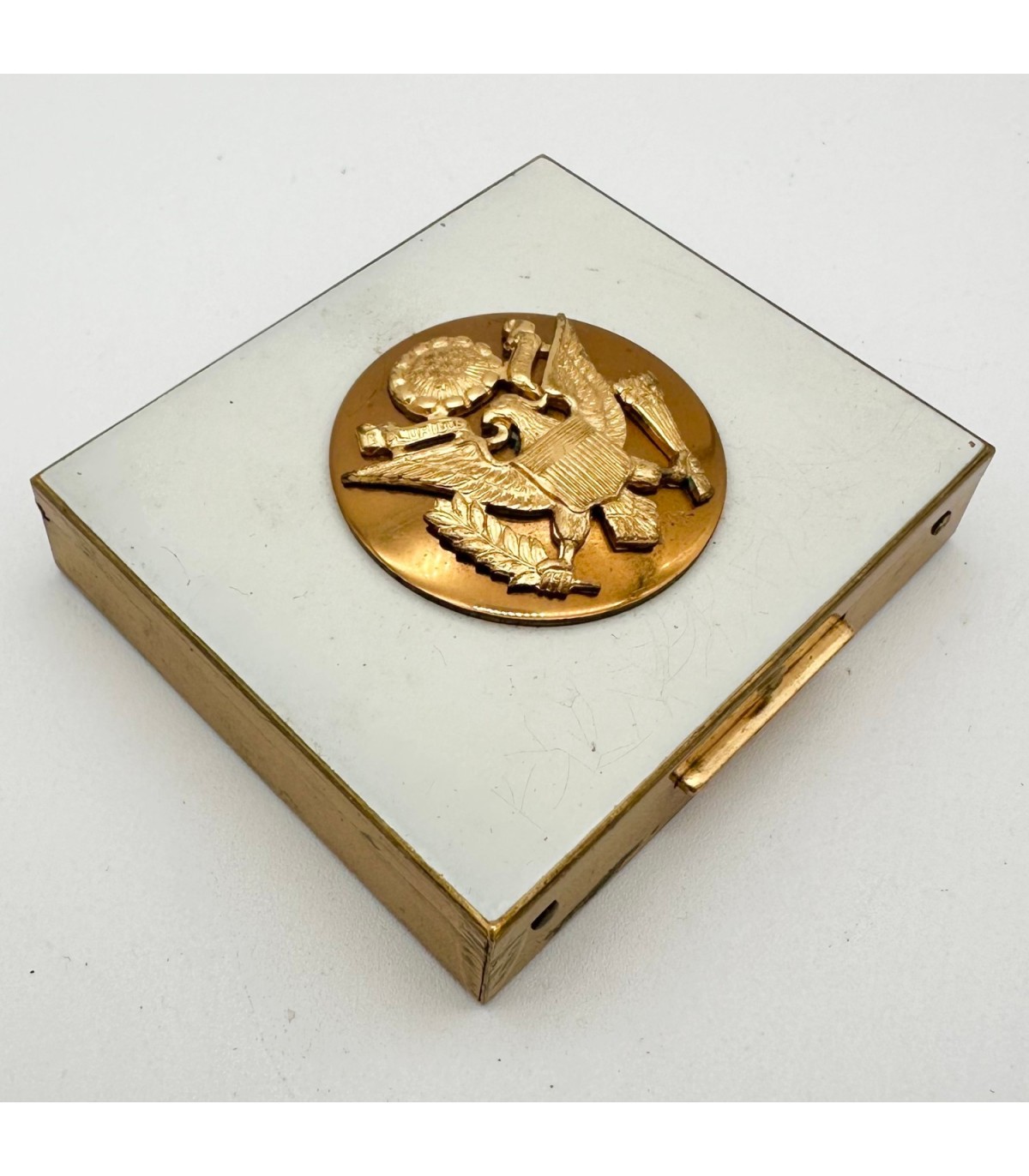 Poudrier a l'effigie de l'US Army sur fond blanc émaillé. Le boitier est en métal doré avec une fermeture par le biais d'un petit bouton fonctionnel. Exemplaire en excellent état exempté de poudre.