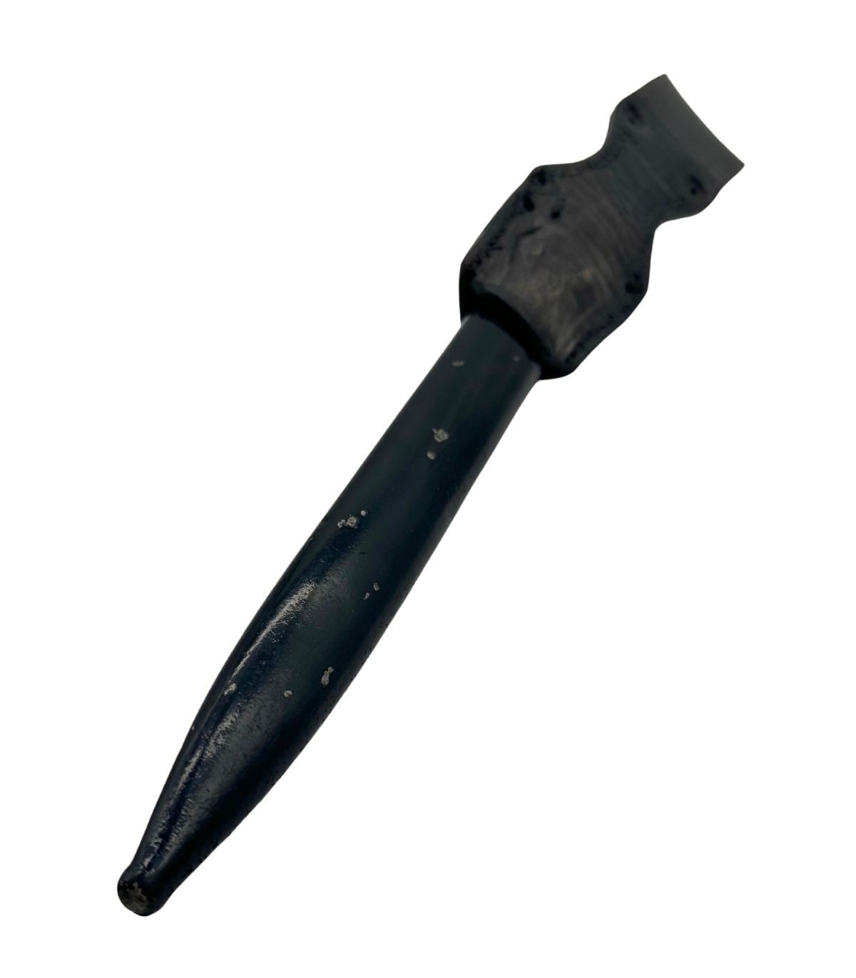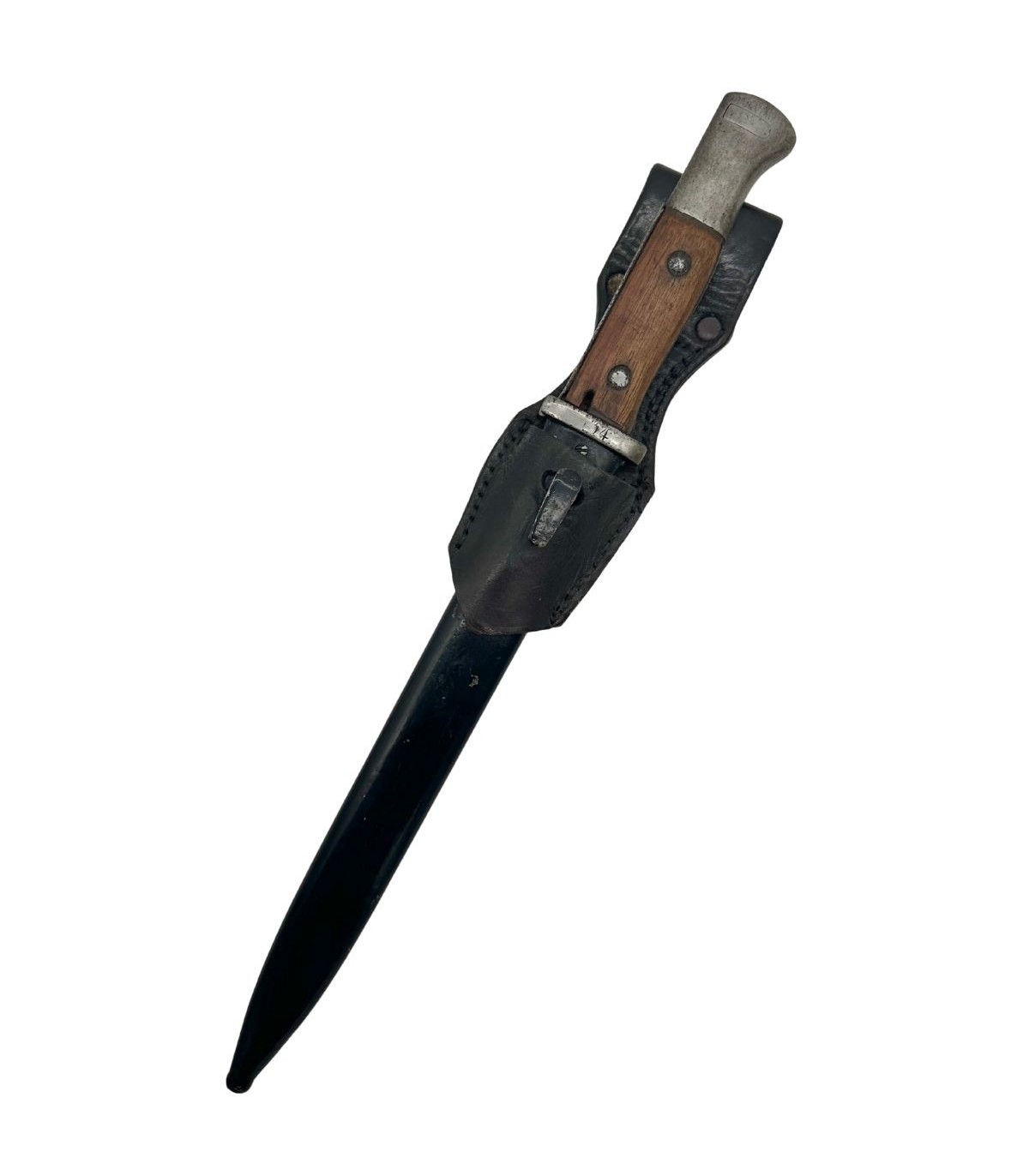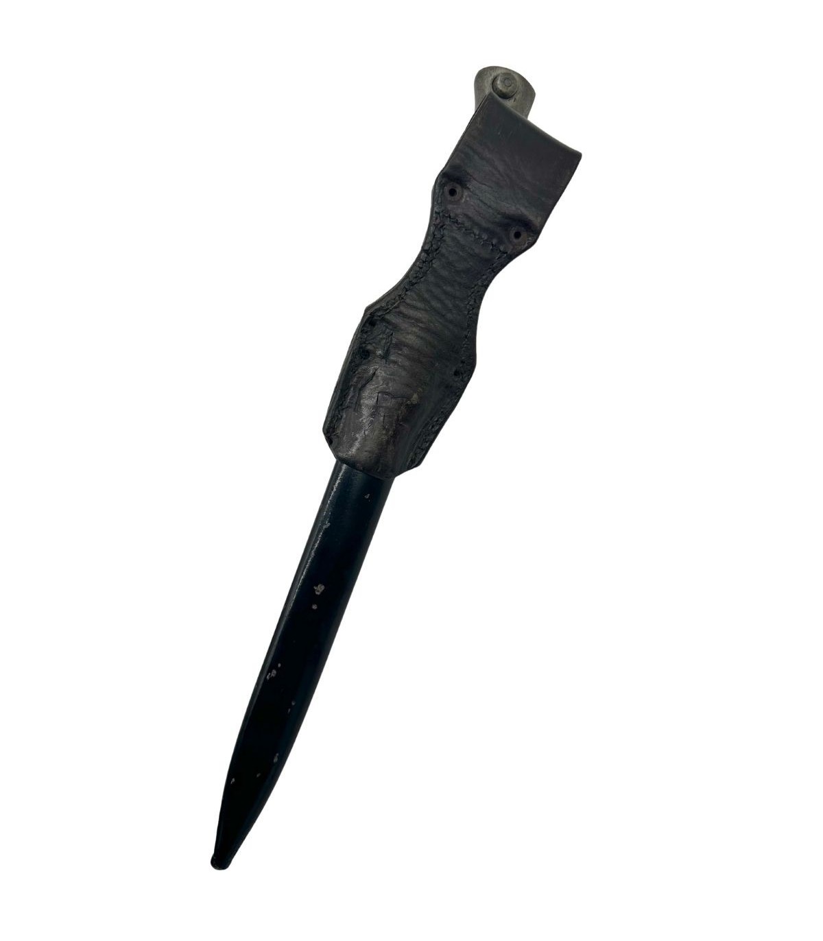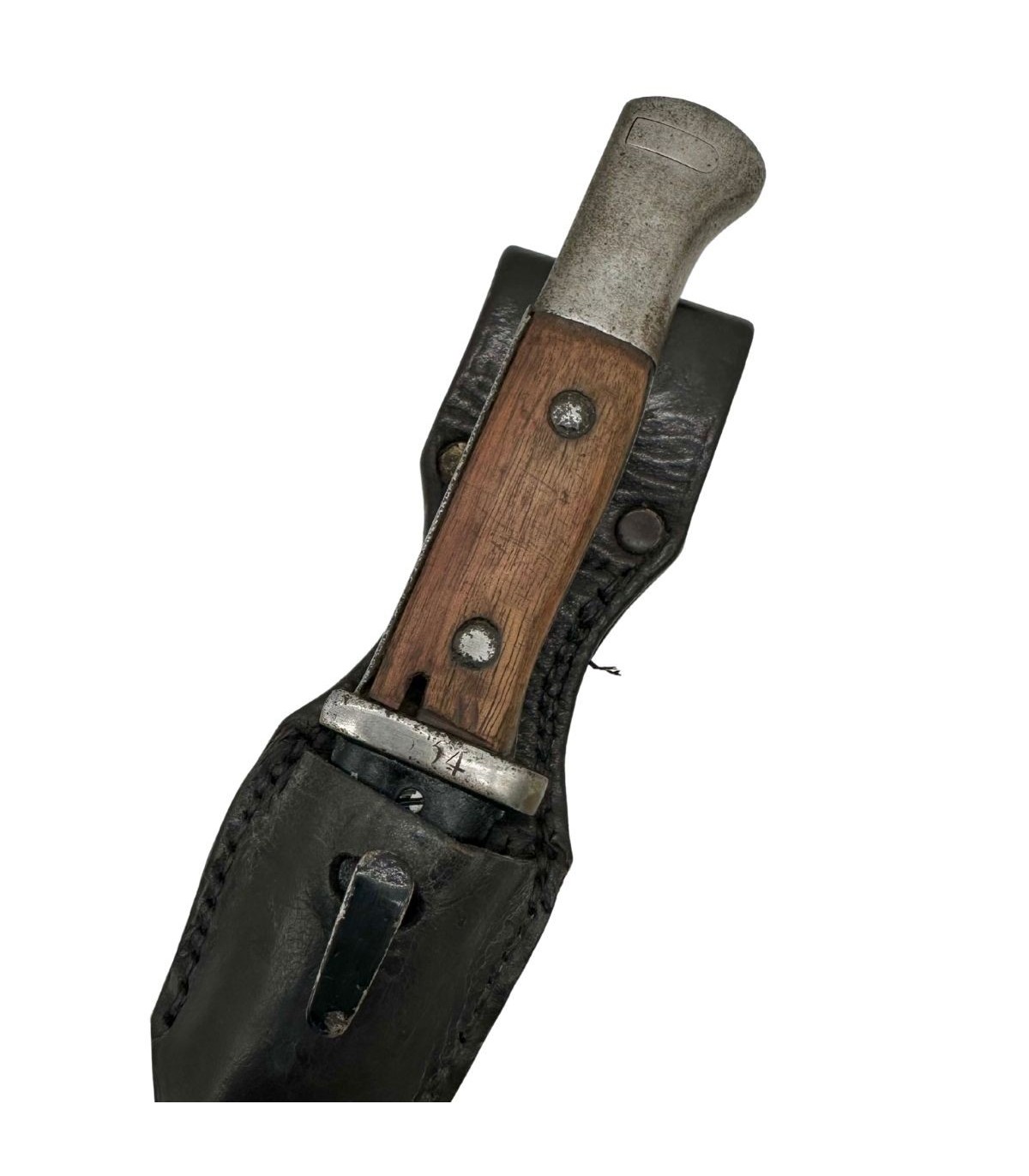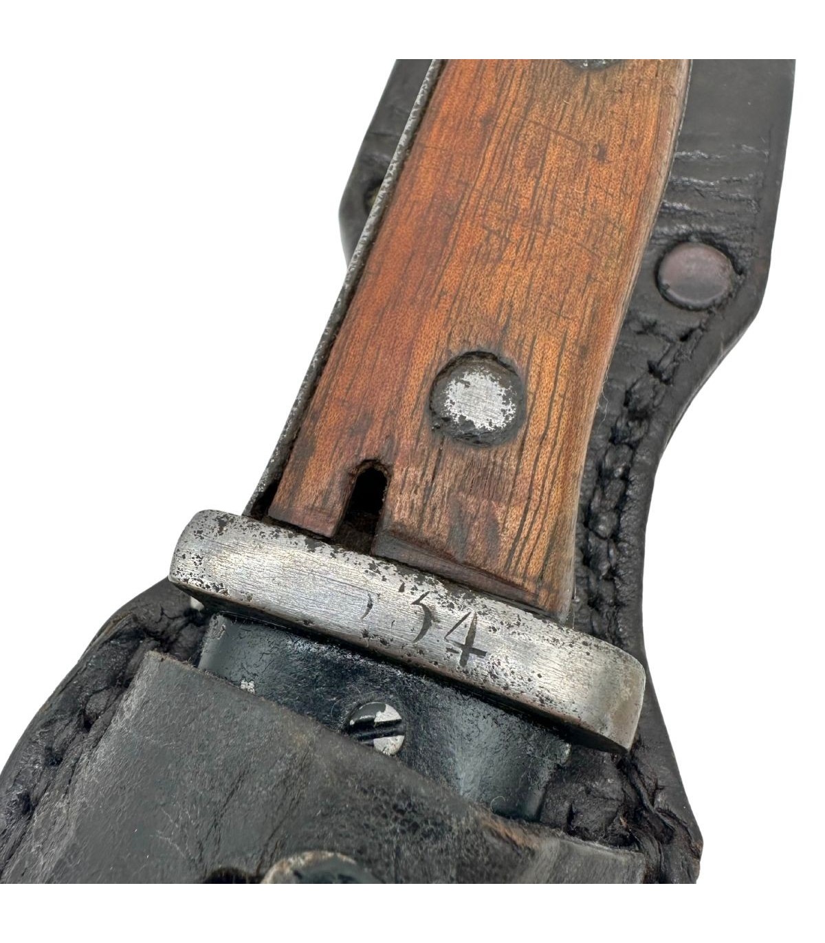 Cette baïonnette ne vient pas seule. Elle est accompagnée de son fourreau de type 84/98 en très bon état général, possédant encore sa vis d’origine et son poinçon à l'extrémité. Le porte-fourreau en cuir marron lisse, bien que portant les marques de son âge, reste souple. Si un rivet est absent et que deux petites coutures latérales ont été restaurées pour stabiliser l'ensemble, le marquage fabricant au dos reste un gage d'authenticité, même s'il est aujourd'hui difficile à déchiffrer. C’est un ensemble cohérent et prestigieux pour toute vitrine de collection.