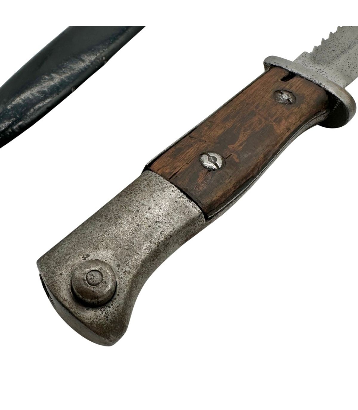 Baïonnette modèle 84/98 S à dos dentelé, fabrication Böntgen & Sabin – Solingen, destinée aux unités de pionniers et du génie. Variante emblématique et très recherchée pour son esthétique et sa rareté.