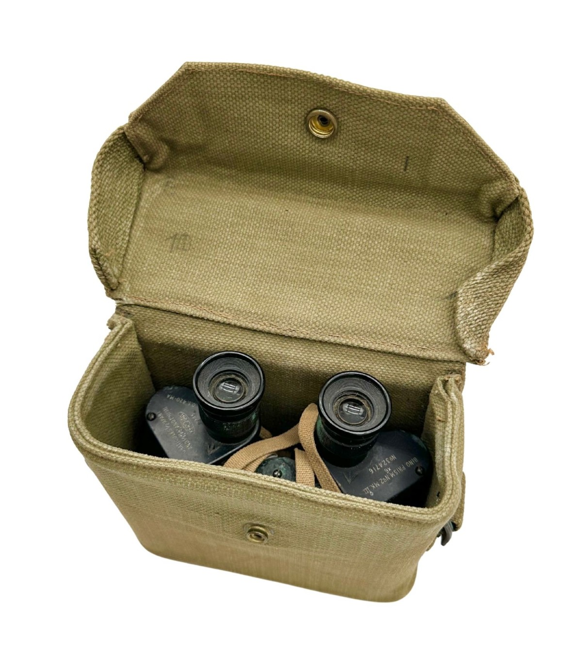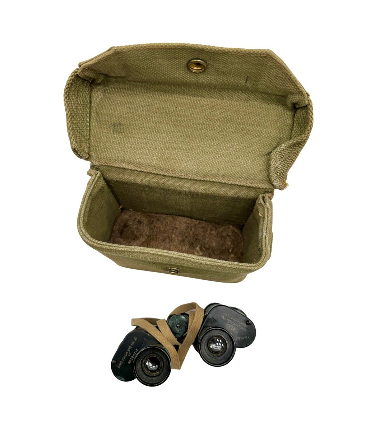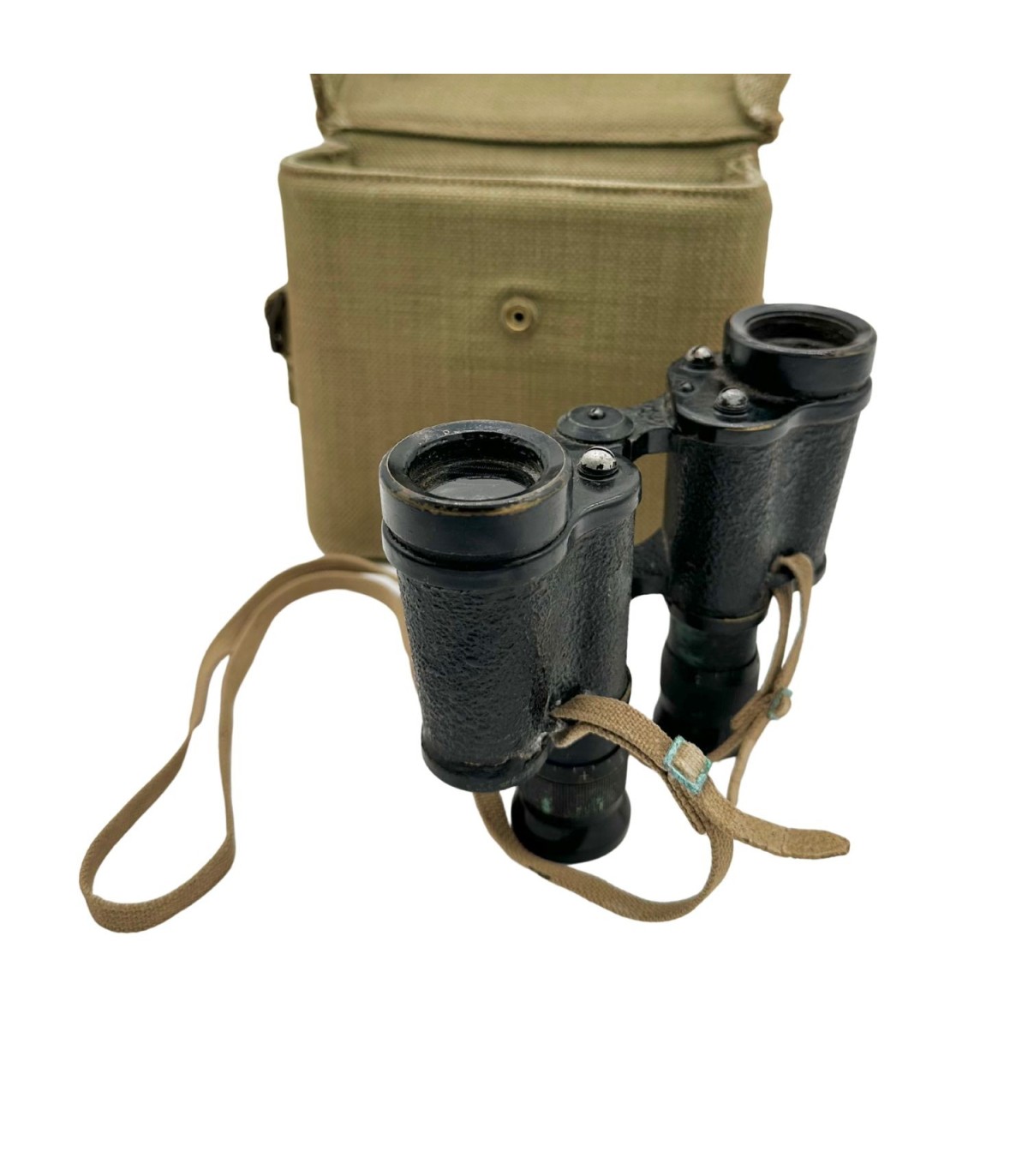 L’étui en toile Webbing GB (Pattern 1937), inclus ici, était conçu pour protéger les jumelles tout en permettant un transport pratique sur le harnais du soldat. Cet ensemble complet et cohérent est aujourd’hui très recherché par les collectionneurs de matériel britannique authentique