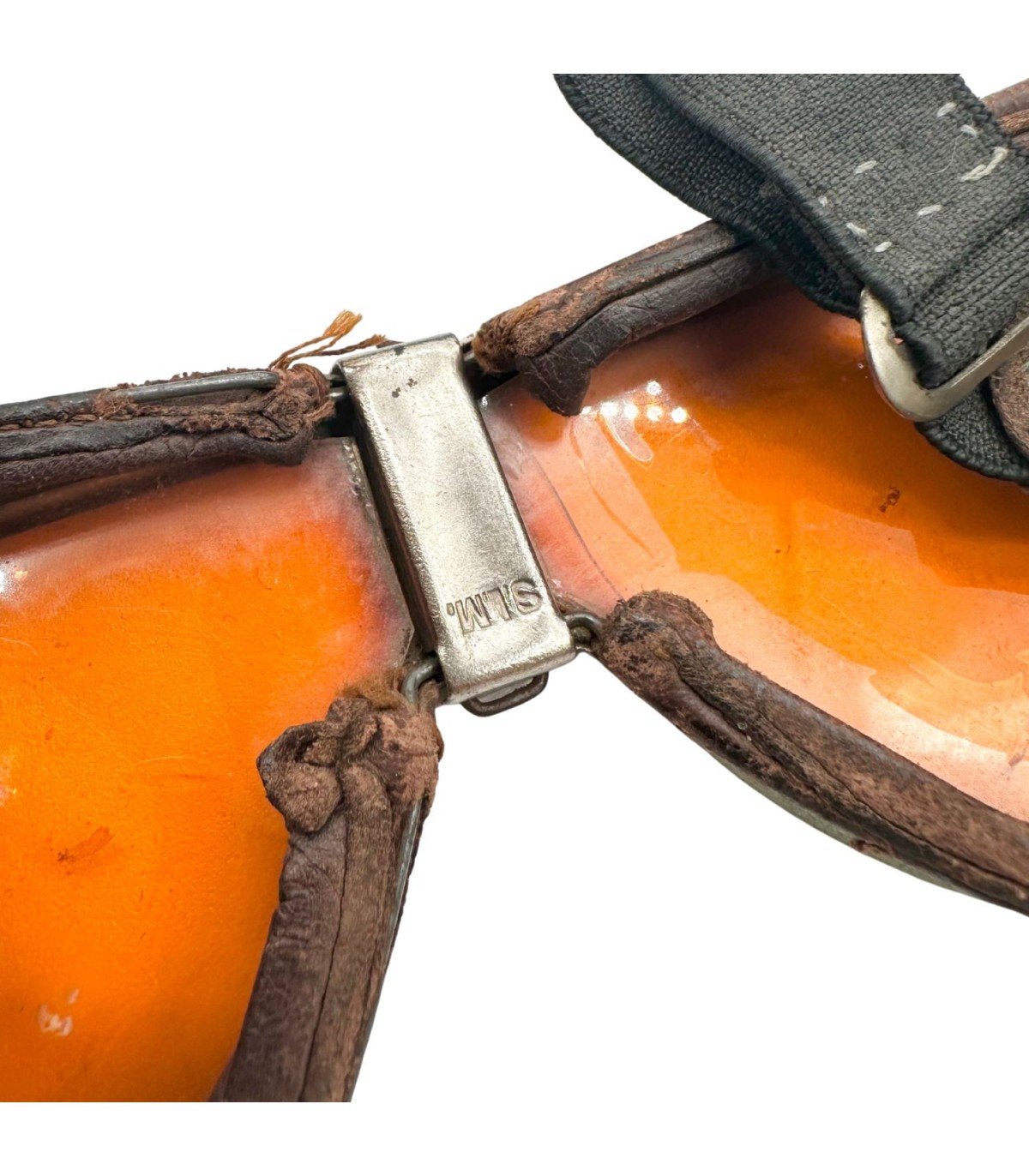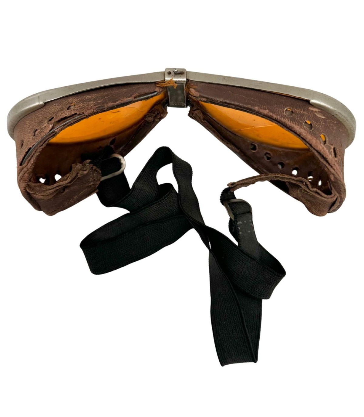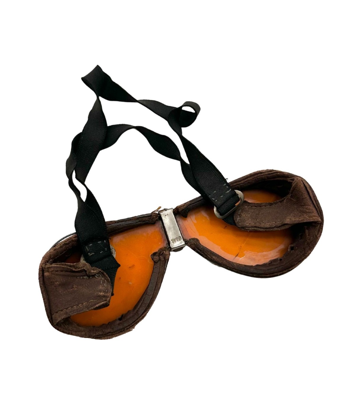 Ces lunettes, conçues pour les Dispatch Riders – les motards chargés de transmettre des ordres et messages entre les unités sur le front – étaient un élément essentiel de leur équipement. Fabriquées pour résister aux intempéries, à la poussière et à la vitesse, elles offrent un design robuste et fonctionnel, typique de la production militaire britannique entre 1939 et 1945.