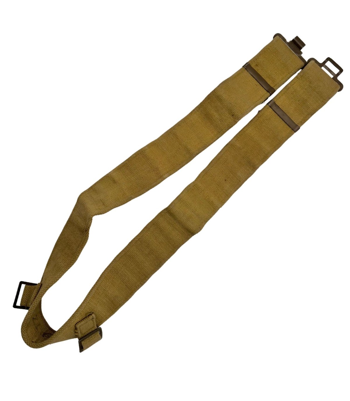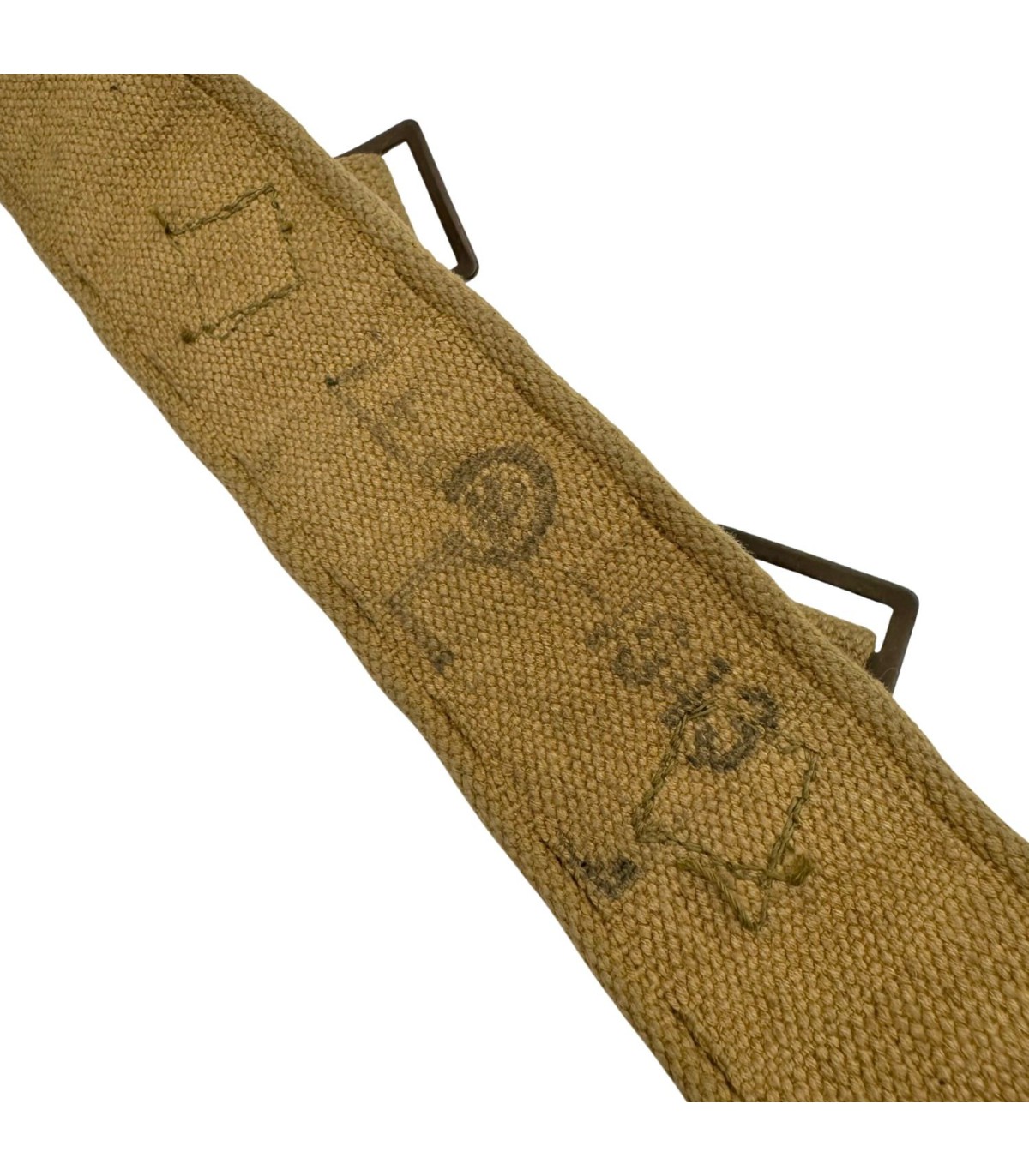 Cet exemplaire, conçu par un fabricant canadien agréé (FAB), est réalisé en webbing kaki, un tissage de coton solide et typique de l’équipement allié durant la guerre. Doté d’une boucle métallique réglementaire et d’œillets renforcés, il conserve toutes les caractéristiques techniques des ceinturons portés par l’infanterie canadienne.