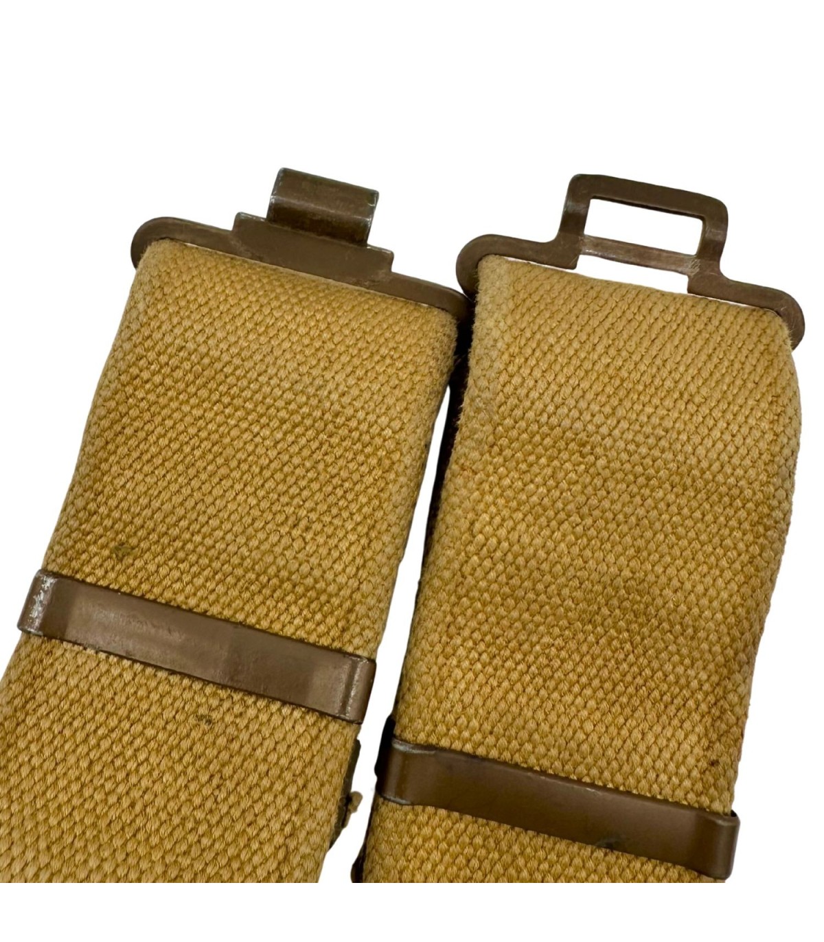 Les ceinturons en webbing de 1943 faisaient partie du système d’équipement standard Mark II utilisé par l’armée canadienne. Ils servaient non seulement à maintenir l’uniforme, mais aussi à accrocher des pochettes, étuis, porte-chargeurs et autres éléments indispensables au soldat de première ligne.