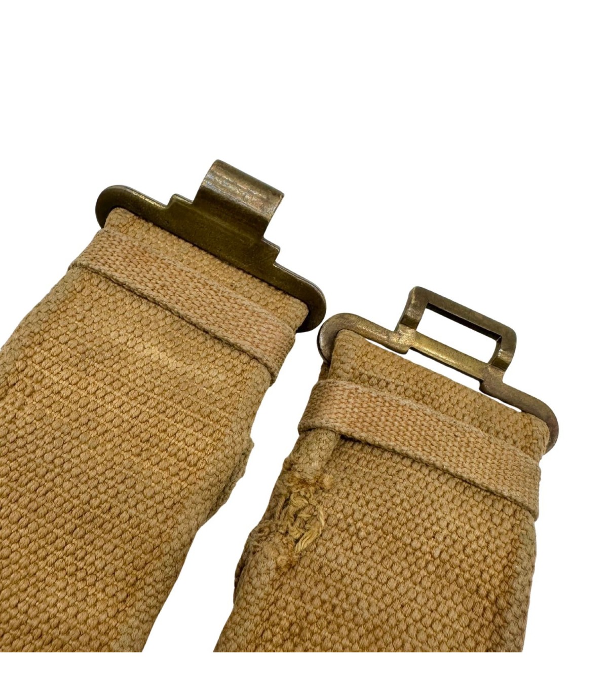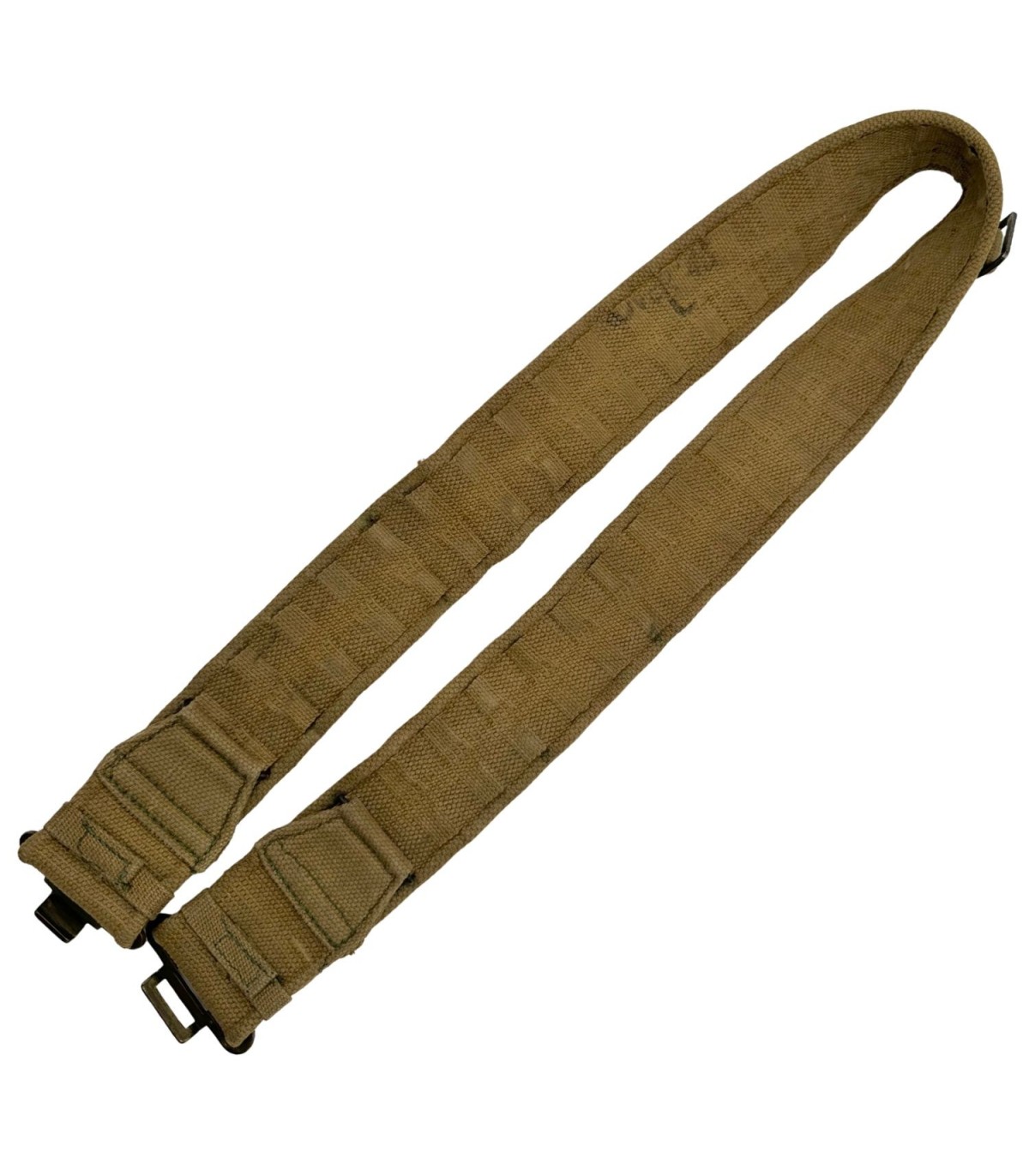 Nous vous proposons une pièce fondamentale du webbing britannique et du Commonwealth de la Seconde Guerre Mondiale : le Ceinturon Pattern 37 (P-37). C'est l'élément central sur lequel étaient fixés tous les accessoires essentiels du soldat, y compris les porte-chargeurs, la gourde, la baïonnette et le small pack.