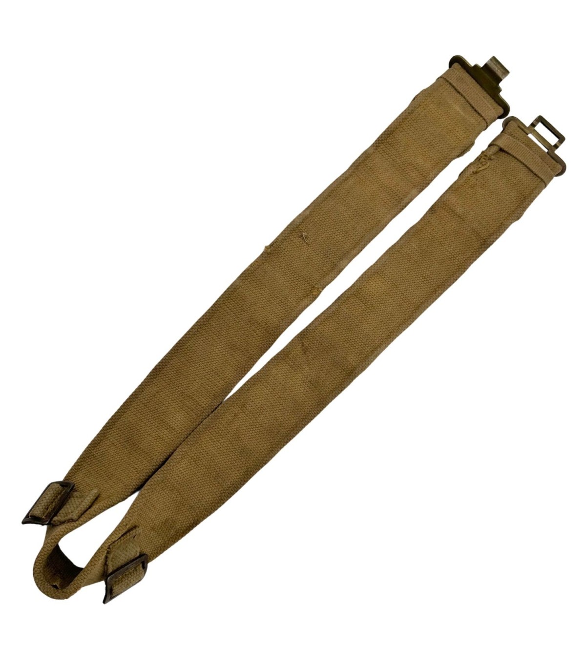 De plus, il est de taille LARGE (Large), une taille qui est souvent plus difficile à trouver que les tailles moyennes, et qui est idéale pour les reconstitutions ou les mannequins de grande stature. Le ceinturon P-37 se reconnaît à ses deux boucles à la britannique et à ses œillets et boucles en laiton ou en métal noirci, destinés à la fixation des bretelles (Brace Attachments) et de l'équipement.