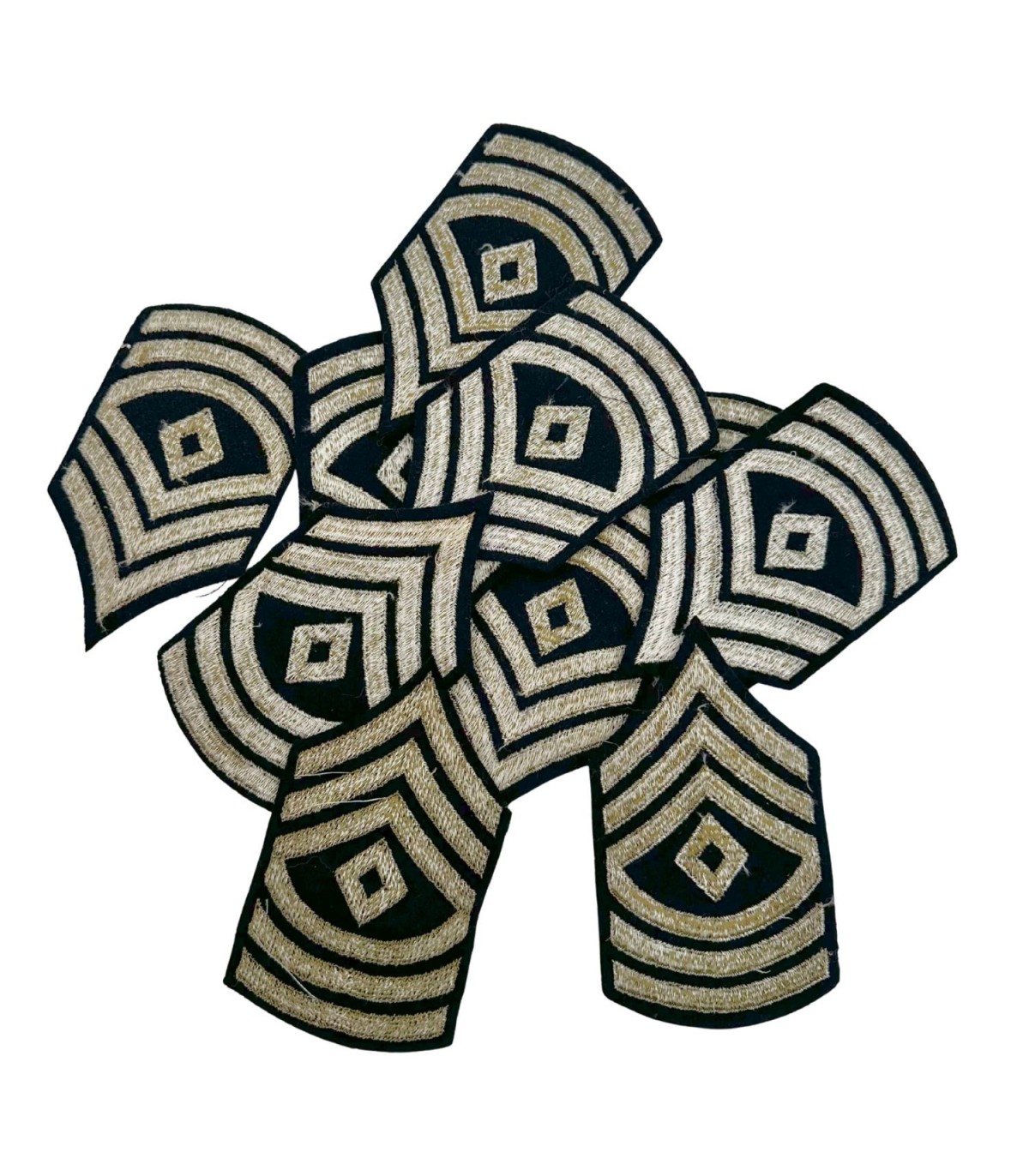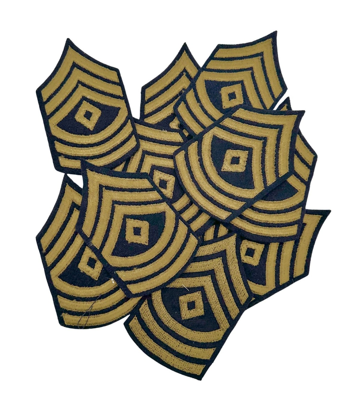 Cet insigne de grade de Premier Sergent de l’US Army – Seconde Guerre mondiale, confectionné en tissu, est une pièce d’authenticité et d’histoire militaire. Fabriqué durant la période du conflit (1939-1945), il était cousu directement sur l’uniforme des sous-officiers américains.
