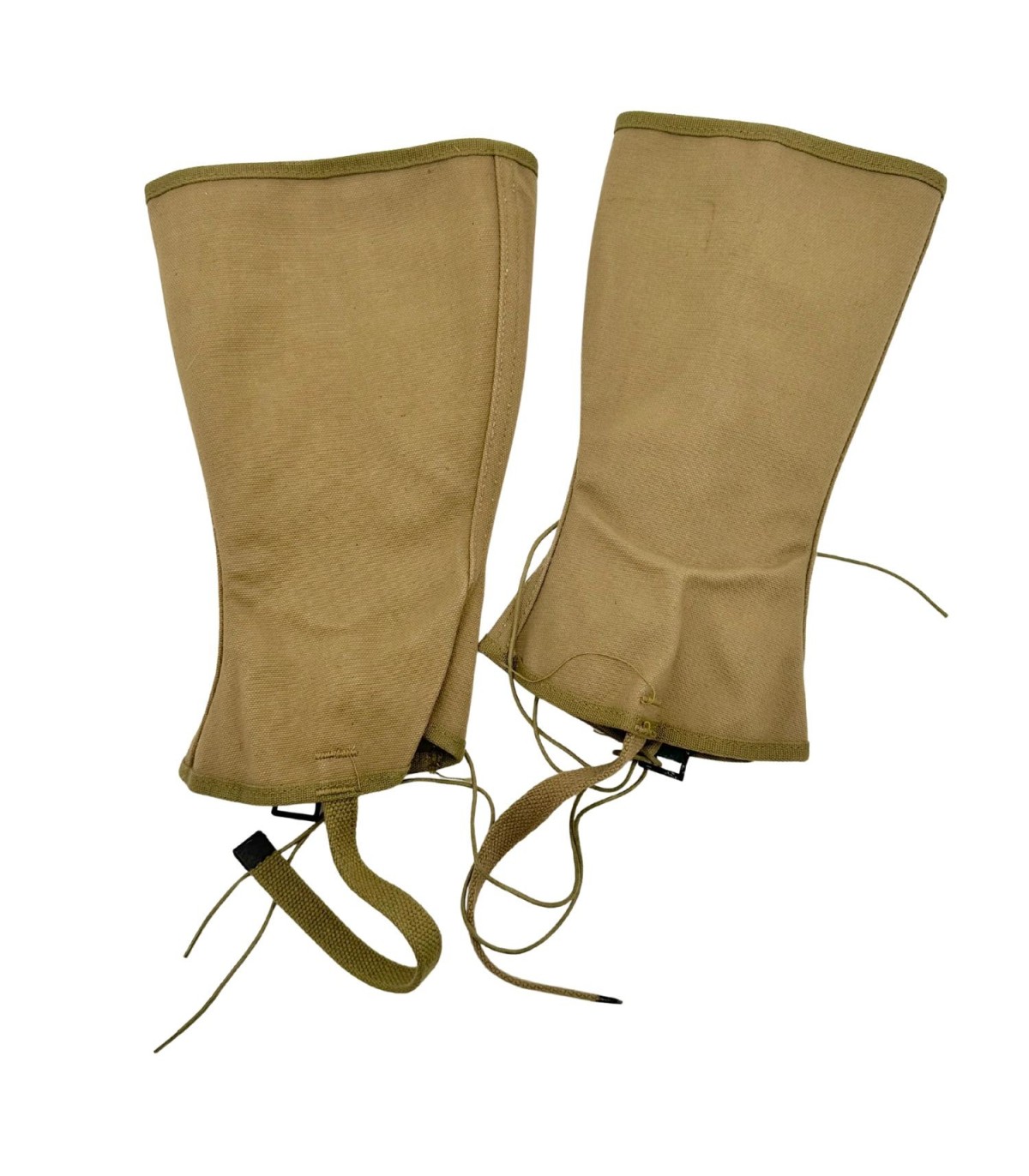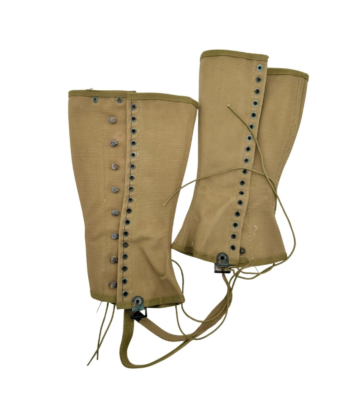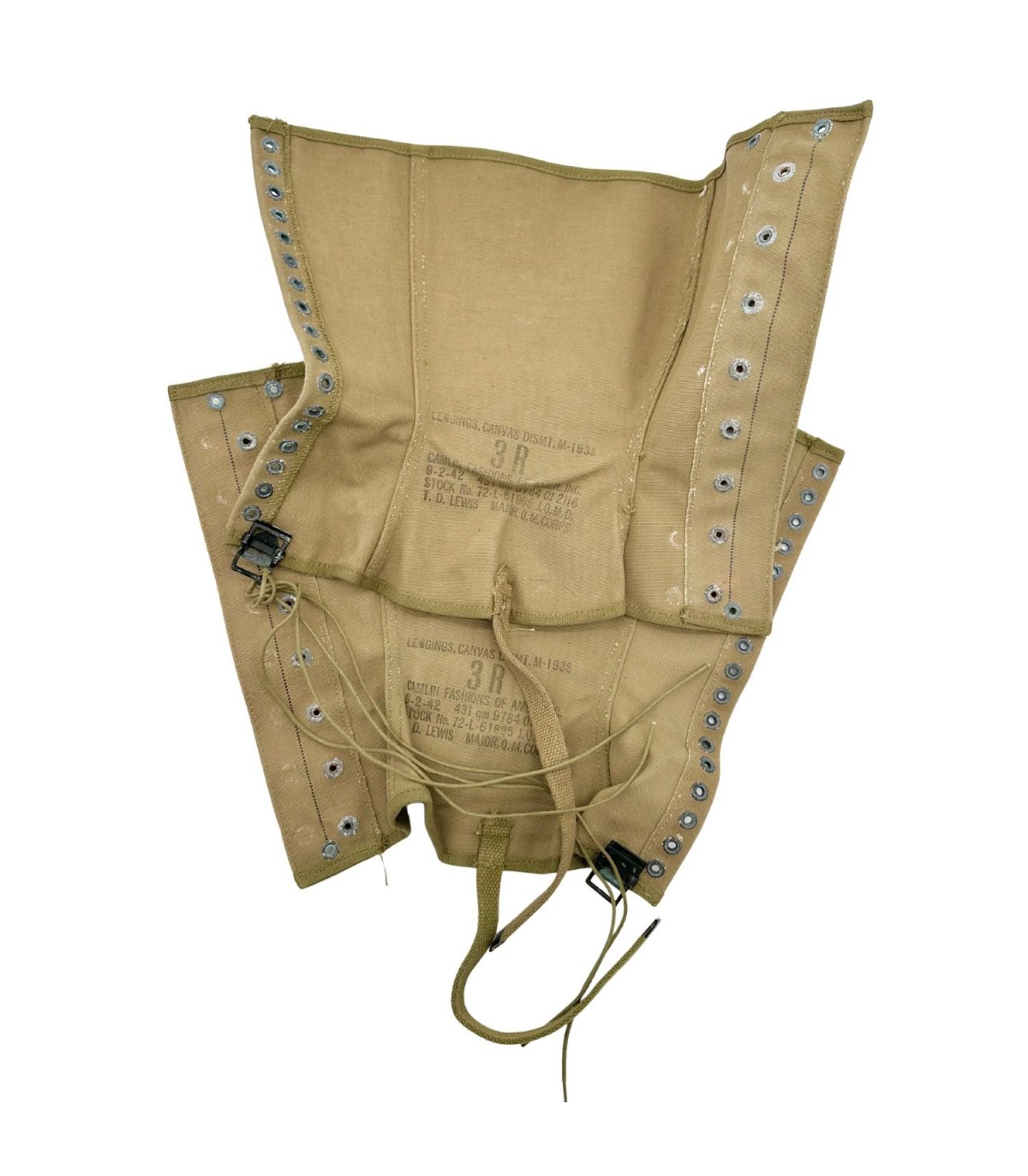 Découvrez cette paire de guêtres US 3R, d'origine deuxième guerre. Fabriquées en 1942, ces guêtres en toile modèle M1938 étaient essentielles pour les soldats américains, offrant protection et soutien lors des opérations sur le terrain.