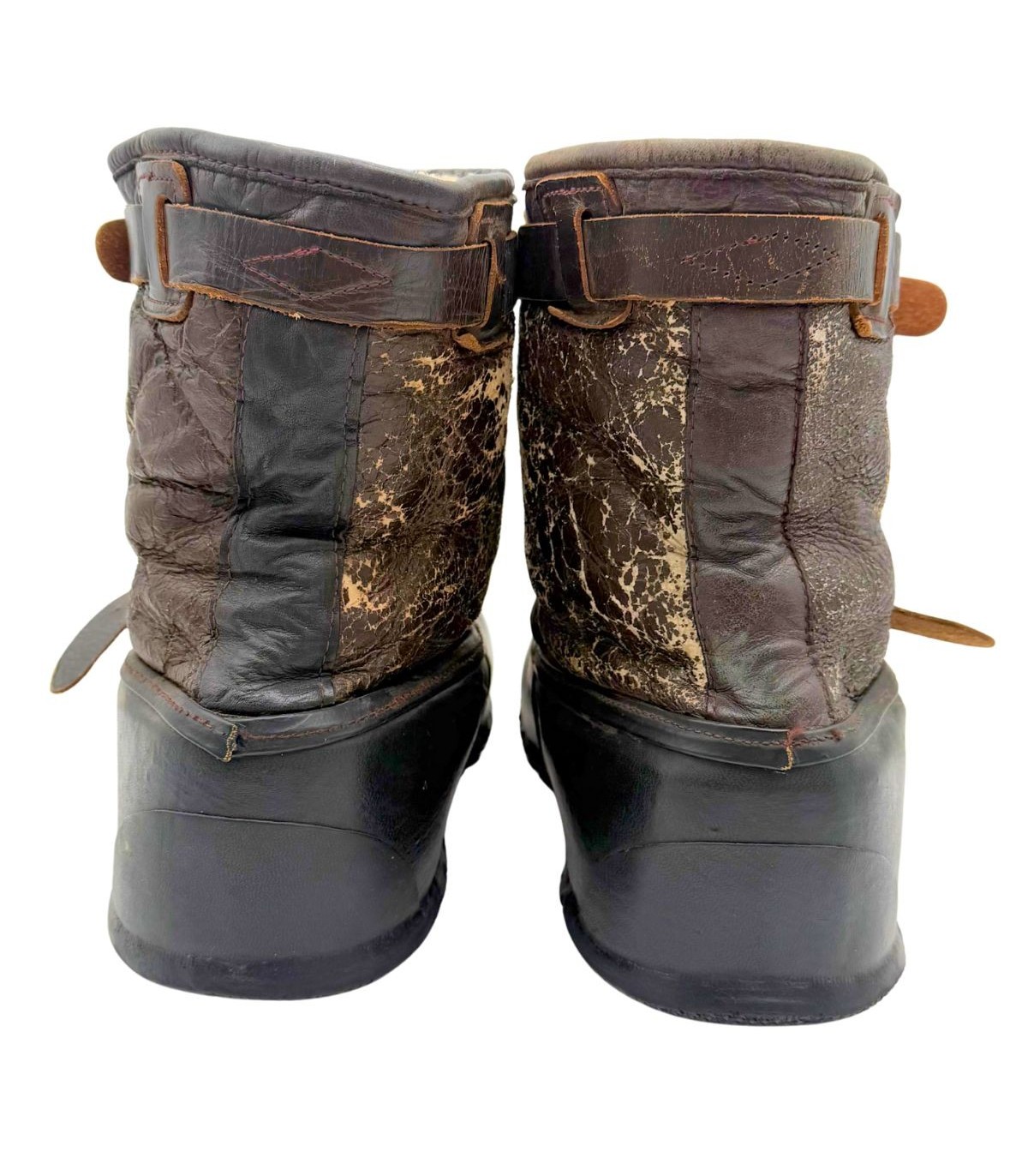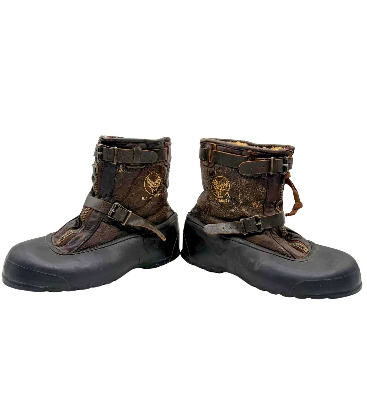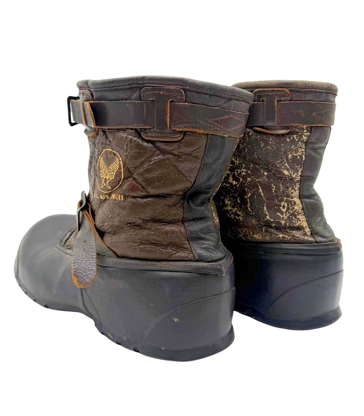 Paire de bottes de type A-1 en fourrure de mouton pour les équipages et pilotes de l'US Air Force. Elle fait partie des équipements de vol pour conditions froides, notamment pour les équipages de bombardiers, vols à haute altitude, ou autres vols exposés au froid.