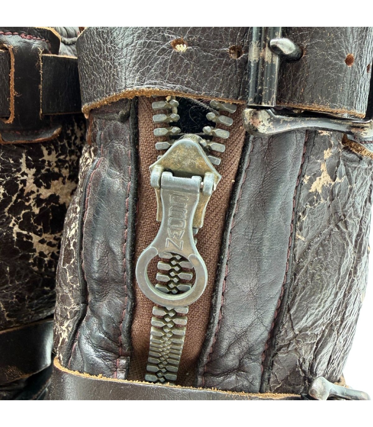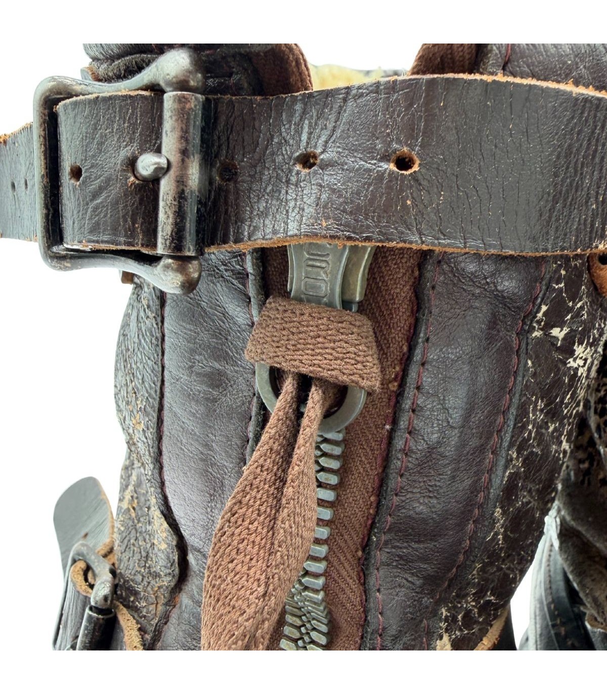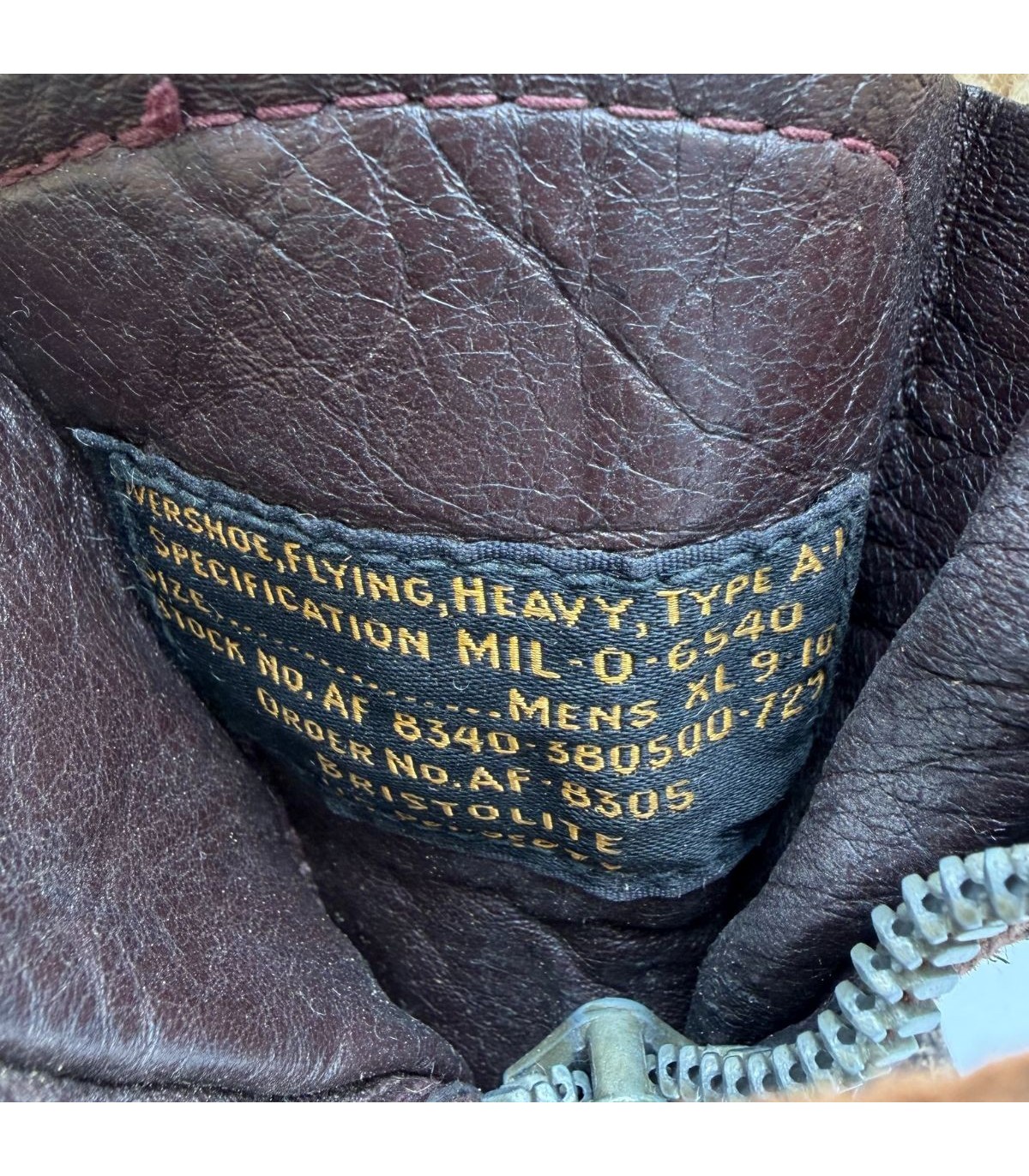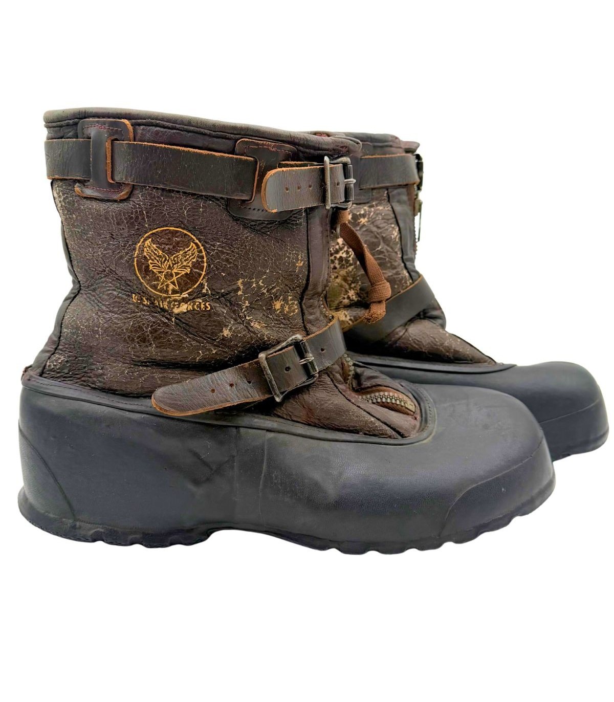 Paire de bottes de type A-1 en fourrure de mouton pour les équipages et pilotes de l'US Air Force. Elle fait partie des équipements de vol pour conditions froides, notamment pour les équipages de bombardiers, vols à haute altitude, ou autres vols exposés au froid.
