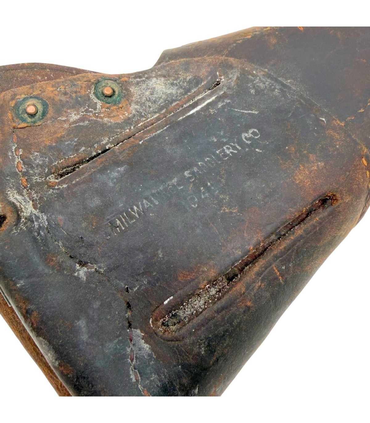 Témoin rare de l’entrée en guerre des États-Unis, ce holster pour Colt M1911A1 est une pièce de début de conflit (1941). Issu des premiers contrats, il bénéficie d'une qualité de tannage supérieure, typique de la Milwaukee Saddlery Co. avant la production de masse.
