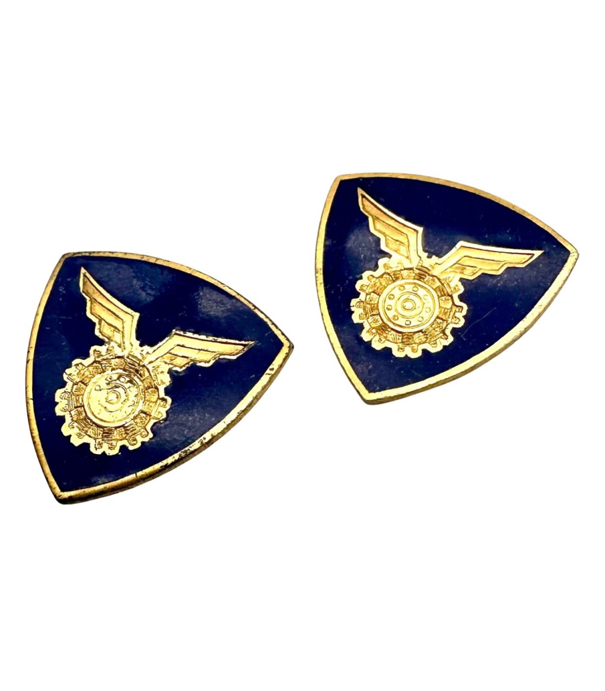 Paire d'insigne de Col pour personnel du commandement du matériel de l'armée de l'air. Exemplaire en parfait état et sans éclats sur l'émail. Marqué sterling sur le dos. Fermeture par épingle.