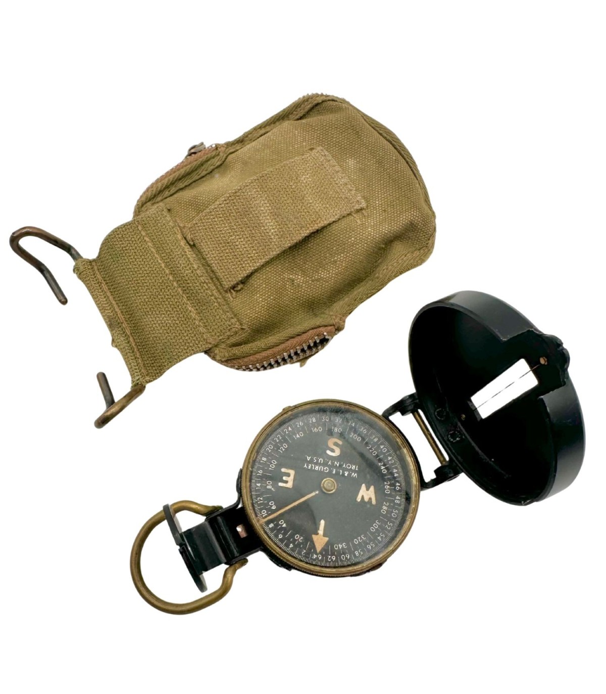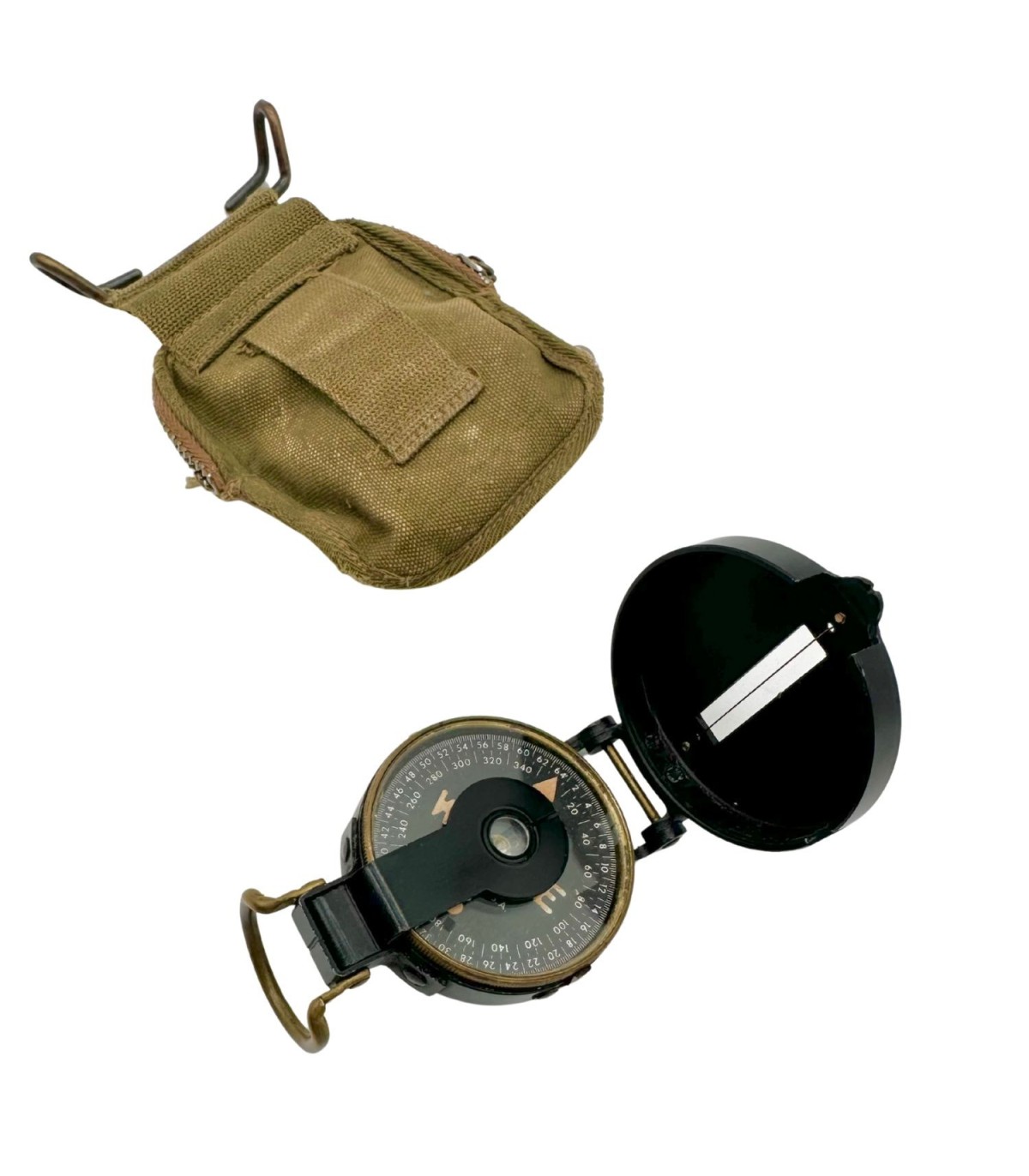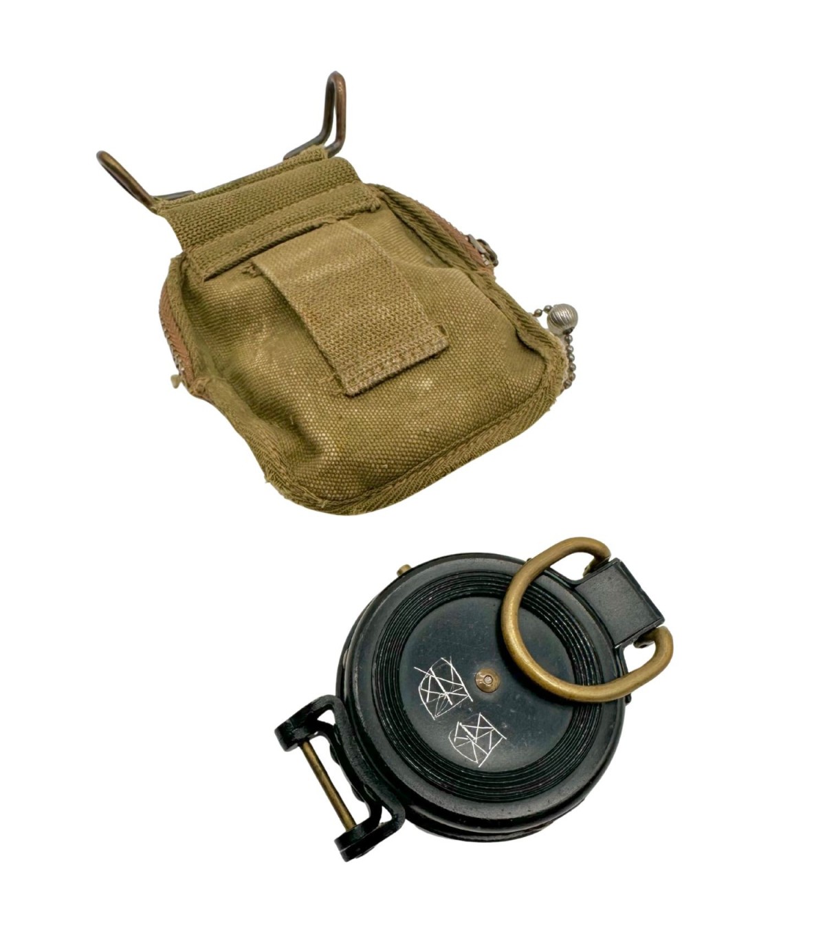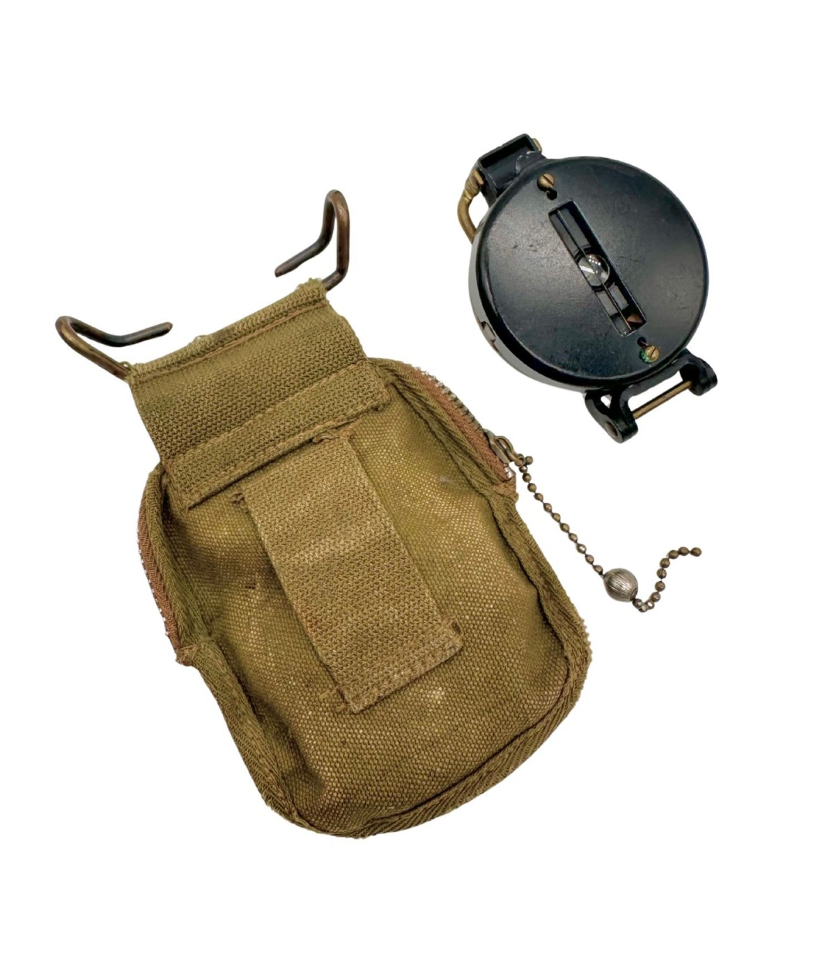 Description : Cette superbe boussole de marche était destinée aux troupes au sol et aux troupes aéroportées. Elle faisait partie des premières boussoles lensmatiques (à lentille) produites pour l’armée américaine. La pochette de boussole US de premier type est constituée d'une fermeture éclaire, puis les pochettes de deuxième type à pression. La fermeture éclaire a été remplacée par une fermeture Talon fonctionnelle. Légèrement décousue.