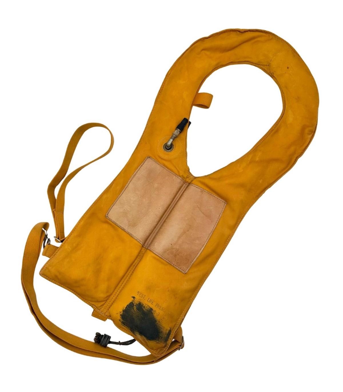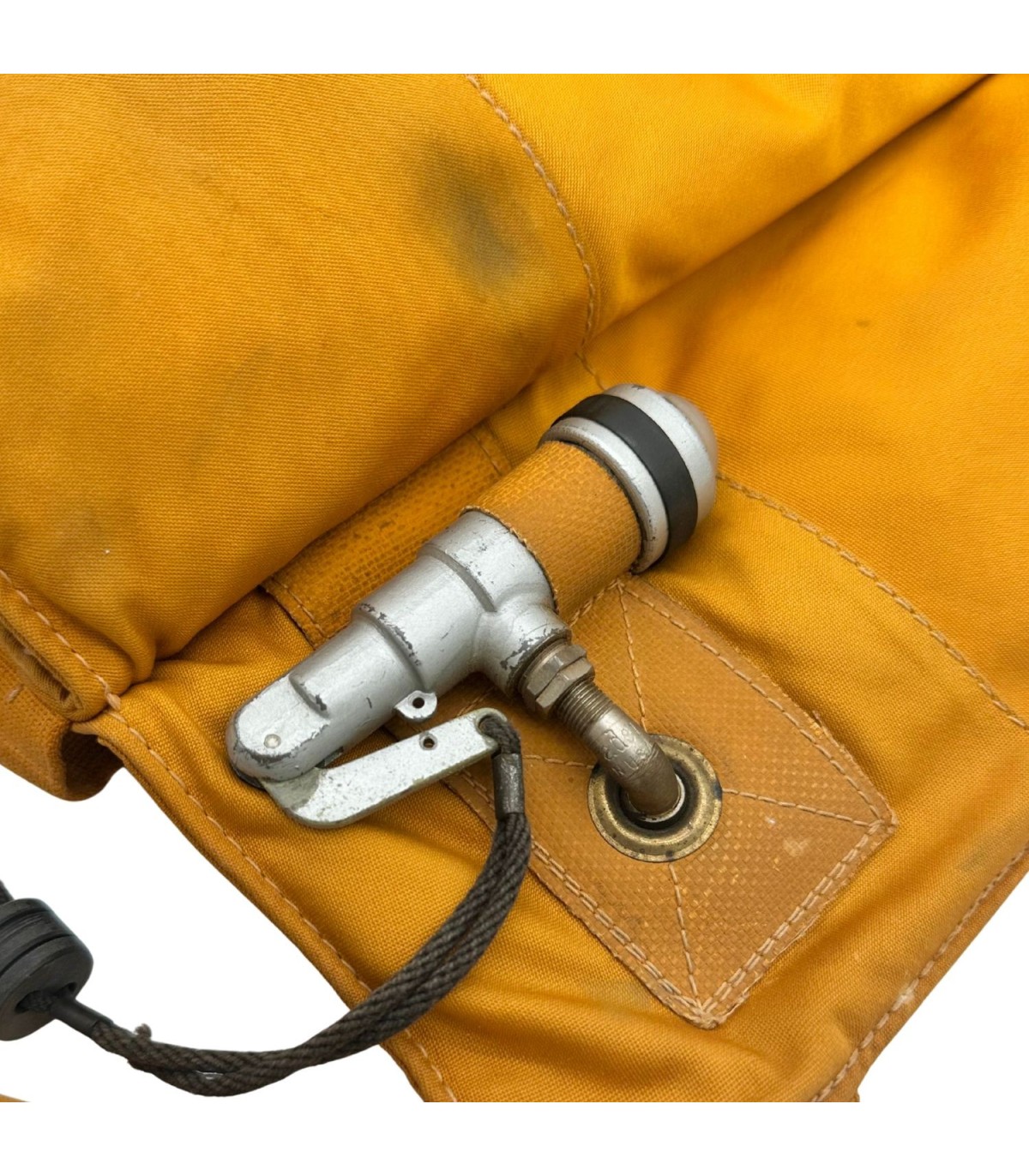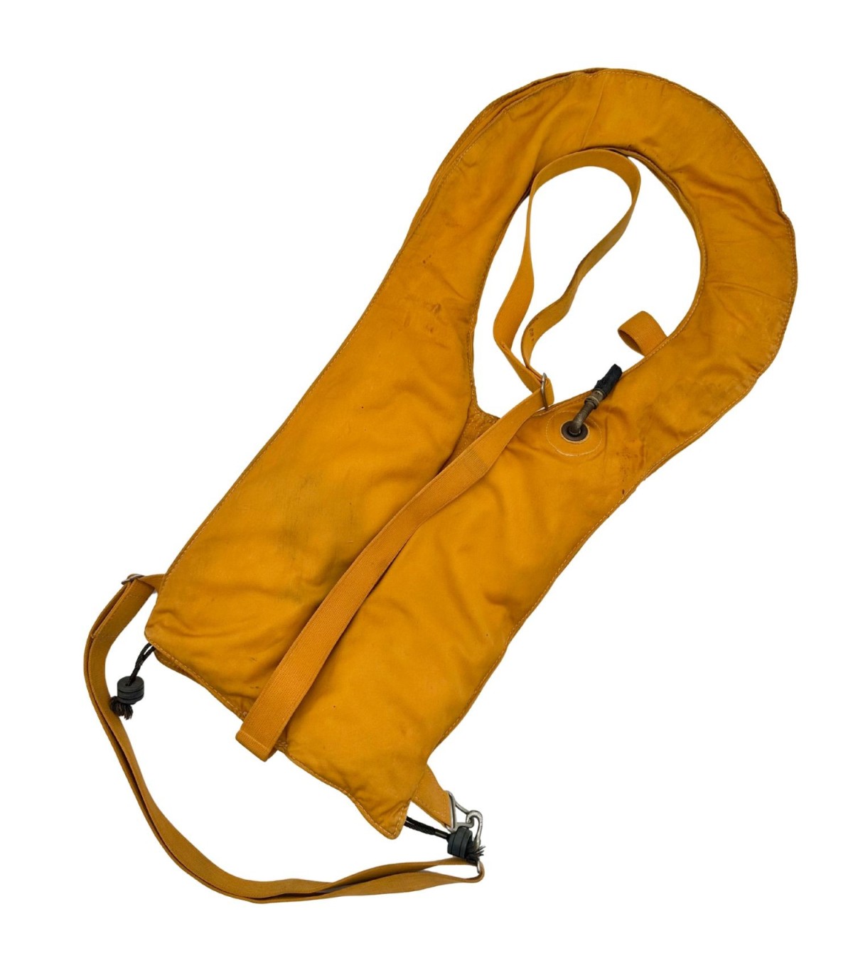 Rare gilet de sauvetage aussi appelé "Mae West" en référence à la célèbre actrice américaine d'origine deuxième guerre. Ce gilet est complet, avec ses 2 sangles de fixations, ses 2 mécanismes de gonflage avec leur cordelette. Le bandeau en cuir est en excellent état (il permettait de protéger les vessies de la boucle de parachute). Les vessies à l'intérieur sont défectueuses et en miette et le marquage n'est plus lisible ce qui n'altère en rien sa présentation et sa couleur vive ! Les tuyaux sont coupés.