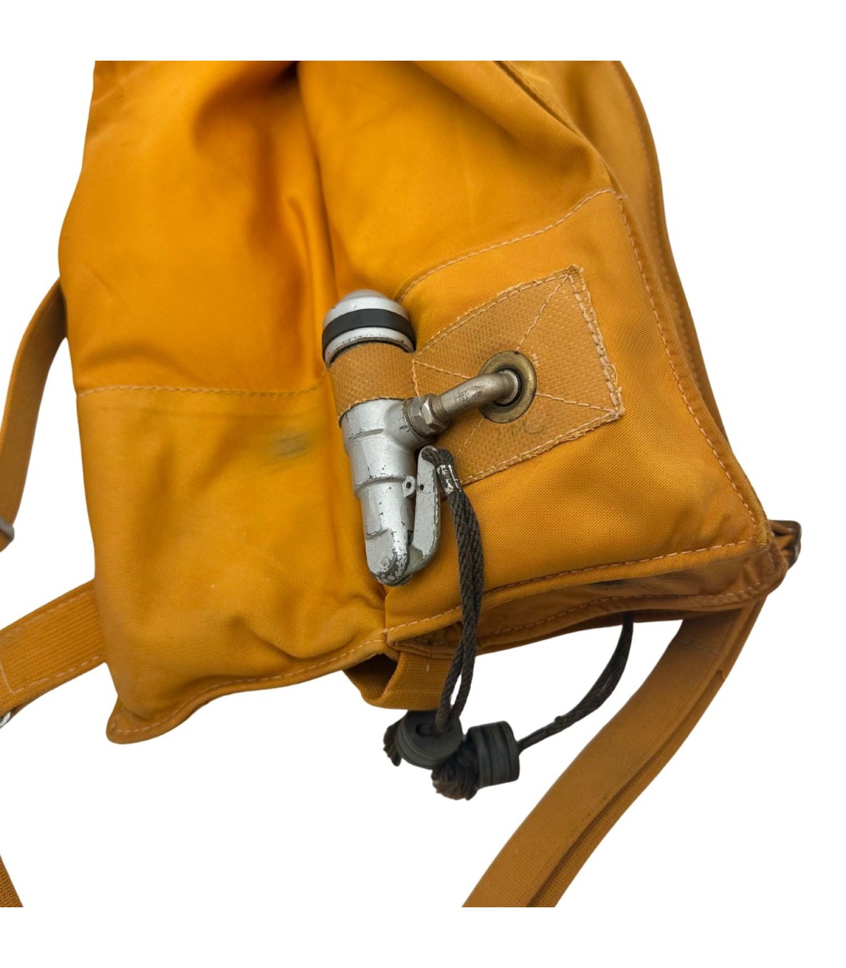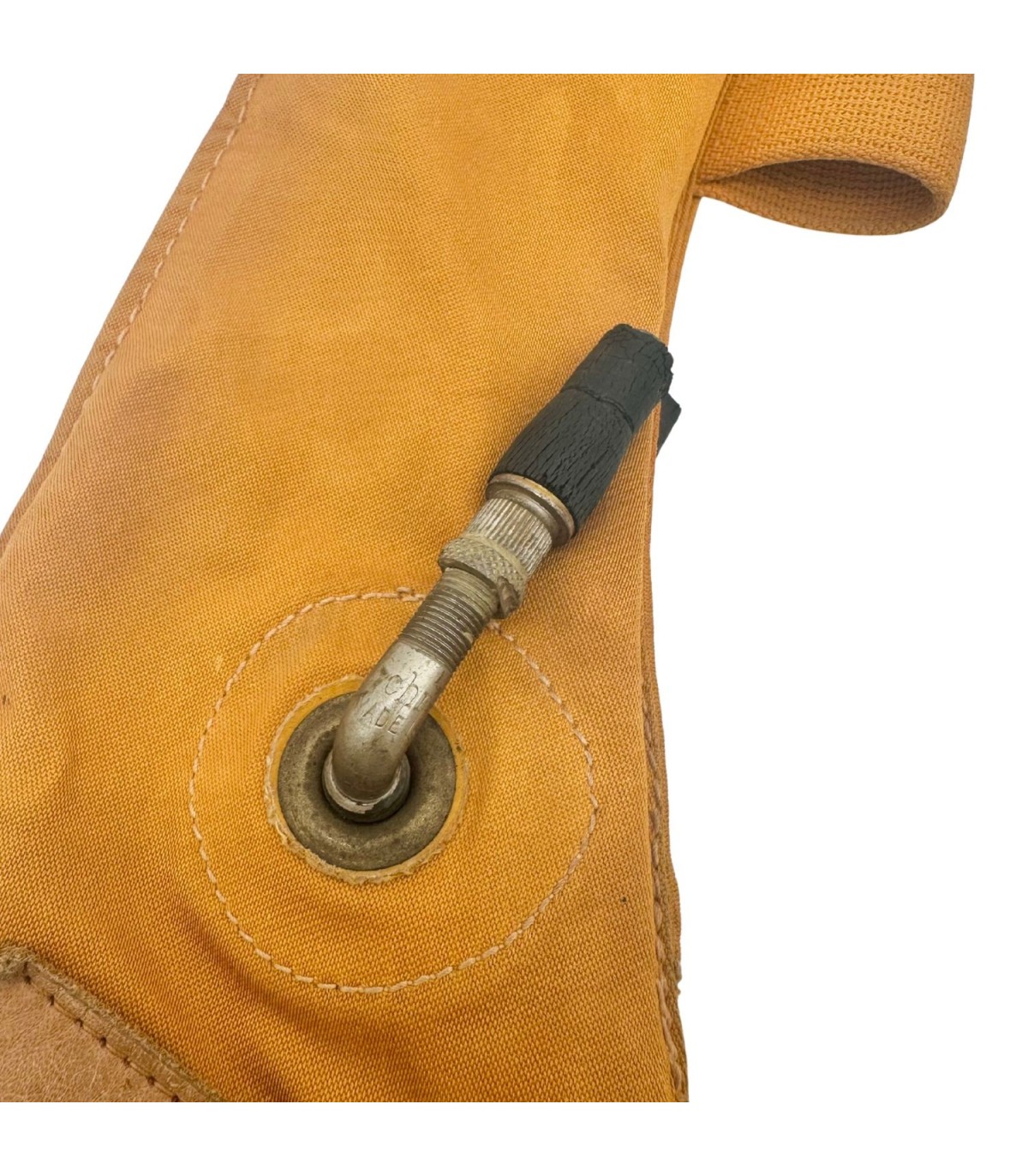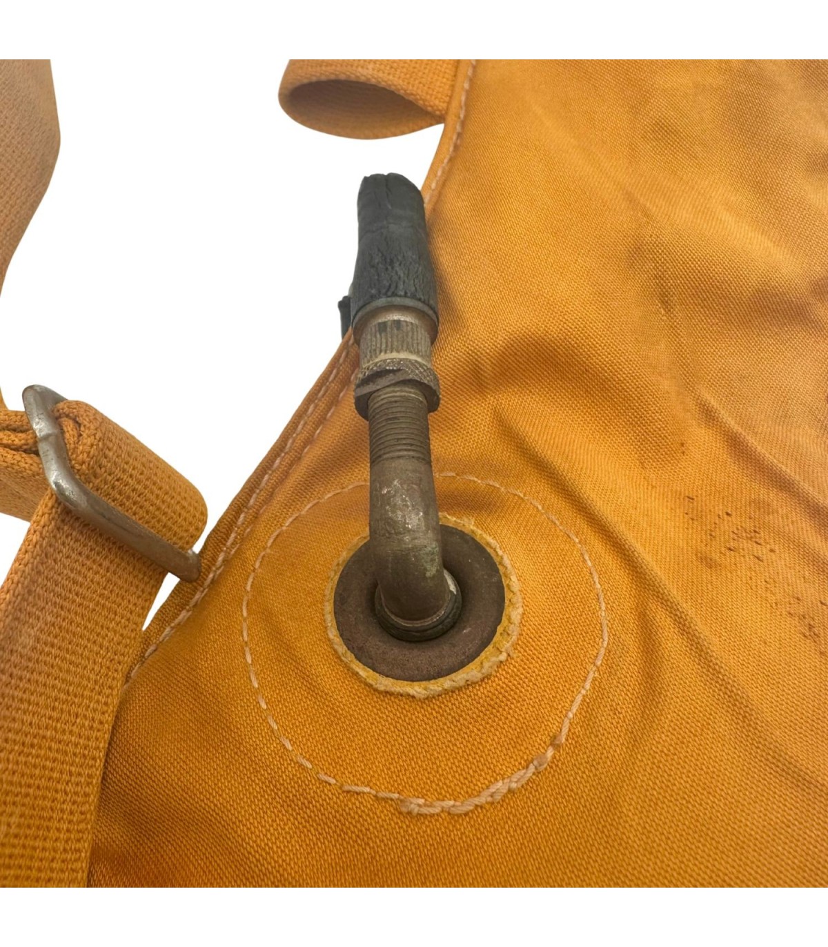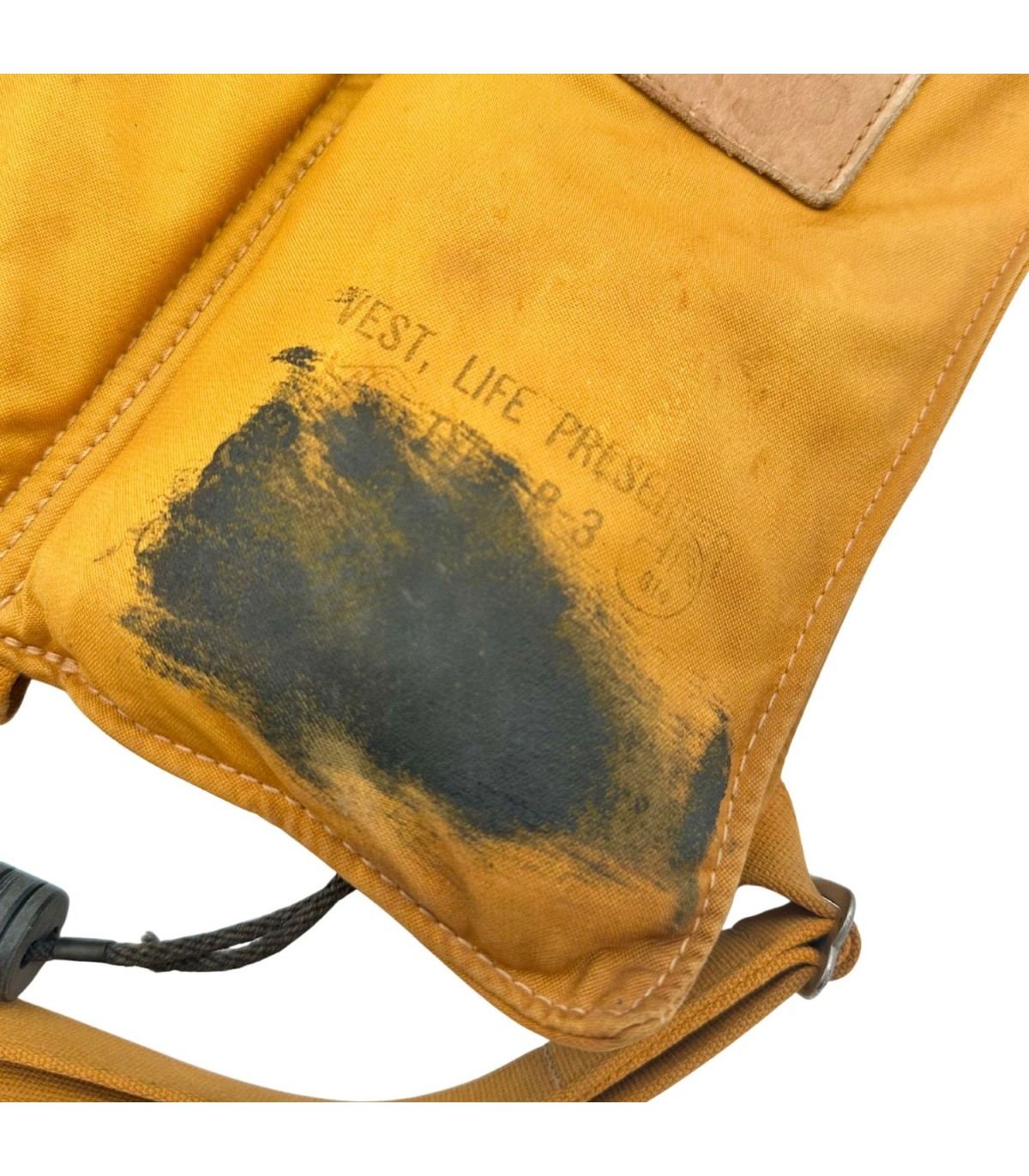 Rare gilet de sauvetage aussi appelé "Mae West" en référence à la célèbre actrice américaine d'origine deuxième guerre. Ce gilet est complet, avec ses 2 sangles de fixations, ses 2 mécanismes de gonflage avec leur cordelette. Le bandeau en cuir est en excellent état (il permettait de protéger les vessies de la boucle de parachute). Les vessies à l'intérieur sont défectueuses et en miette et le marquage n'est plus lisible ce qui n'altère en rien sa présentation et sa couleur vive ! Les tuyaux sont coupés.