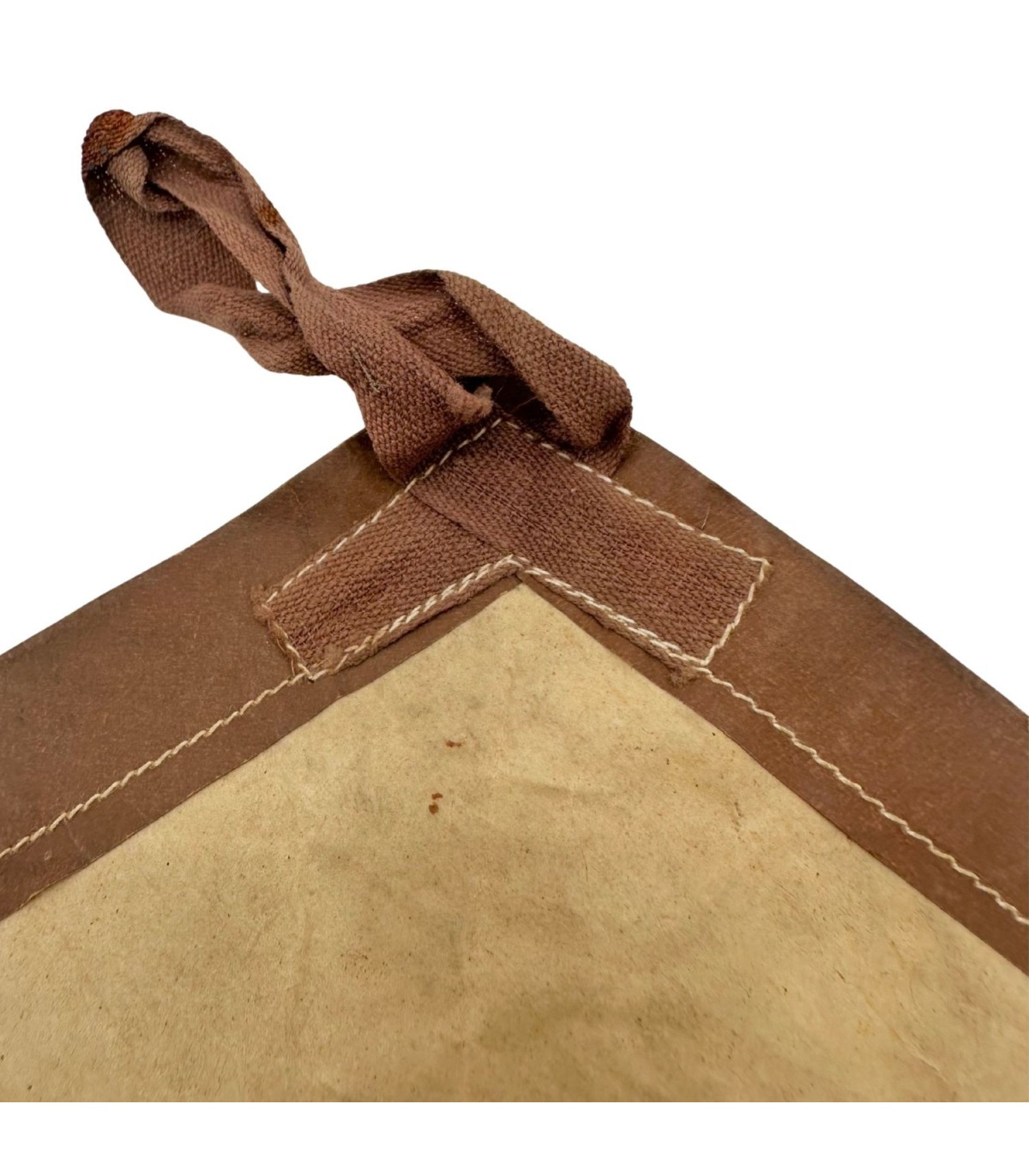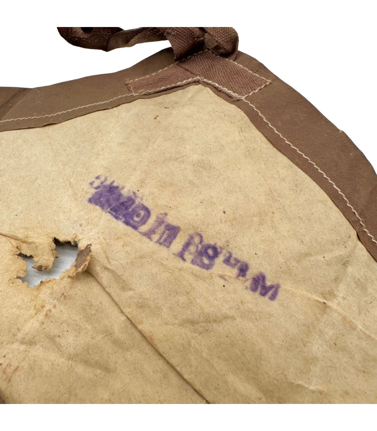Fabriqué en papier réactif traité chimiquement, il changeait de couleur en présence de gaz toxiques, permettant au soldat d’enfiler immédiatement son masque. Cet exemplaire est un modèle britannique marqué S Ltd M, daté mars 1940, utilisé ensuite par l’US Army pour les opérations majeures.