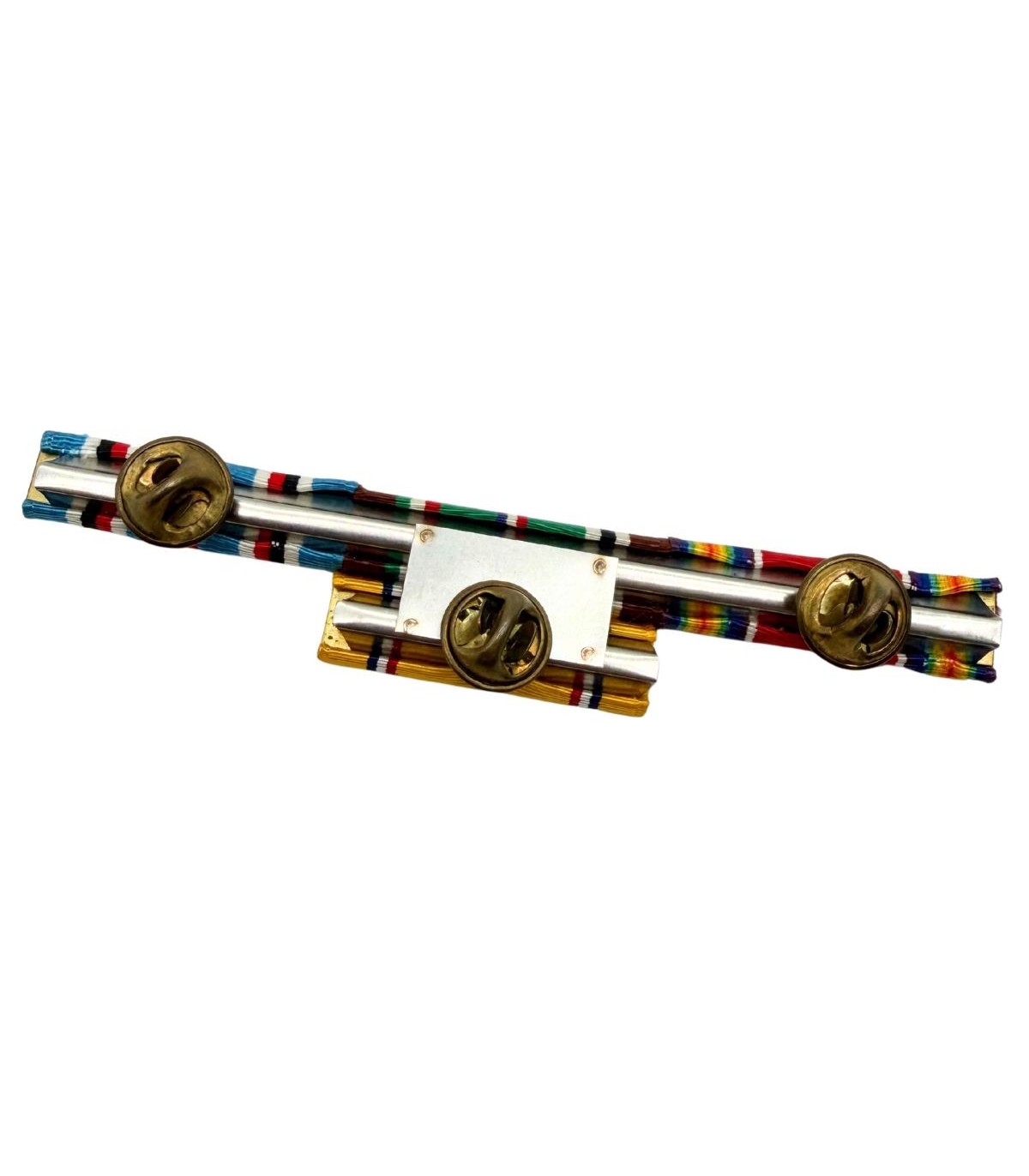 Barrette de rappel regroupant quatre décorations majeures : American Defense Medal, American Campaign Medal, European-African-Middle Eastern Campaign Medal et WWII Victory Medal. Ensemble cohérent d’un vétéran engagé avant Pearl Harbor et présent sur le théâtre européen.