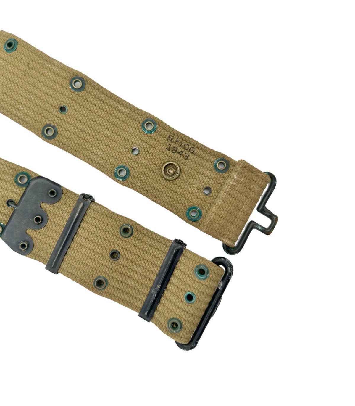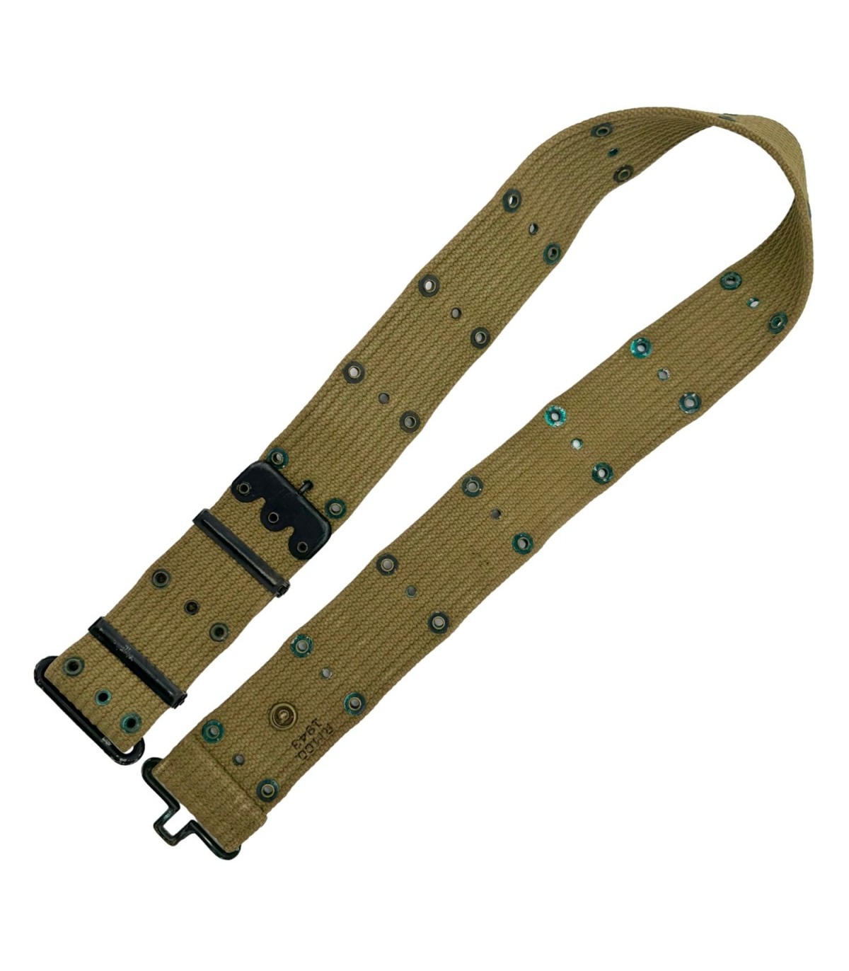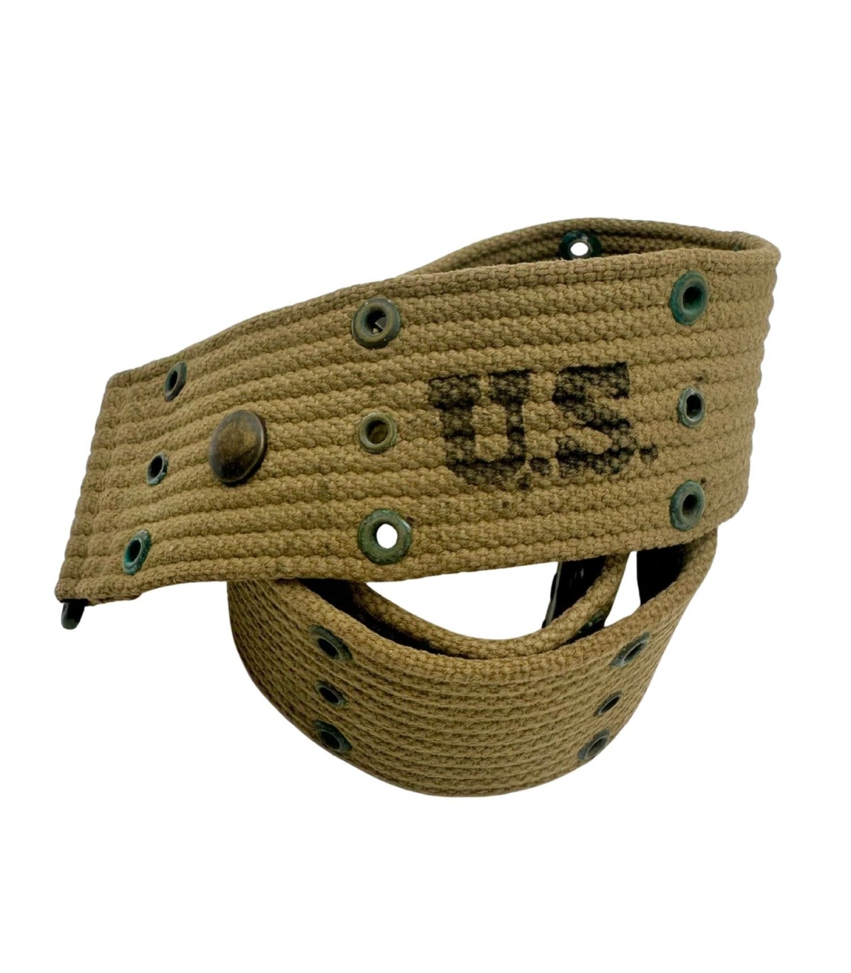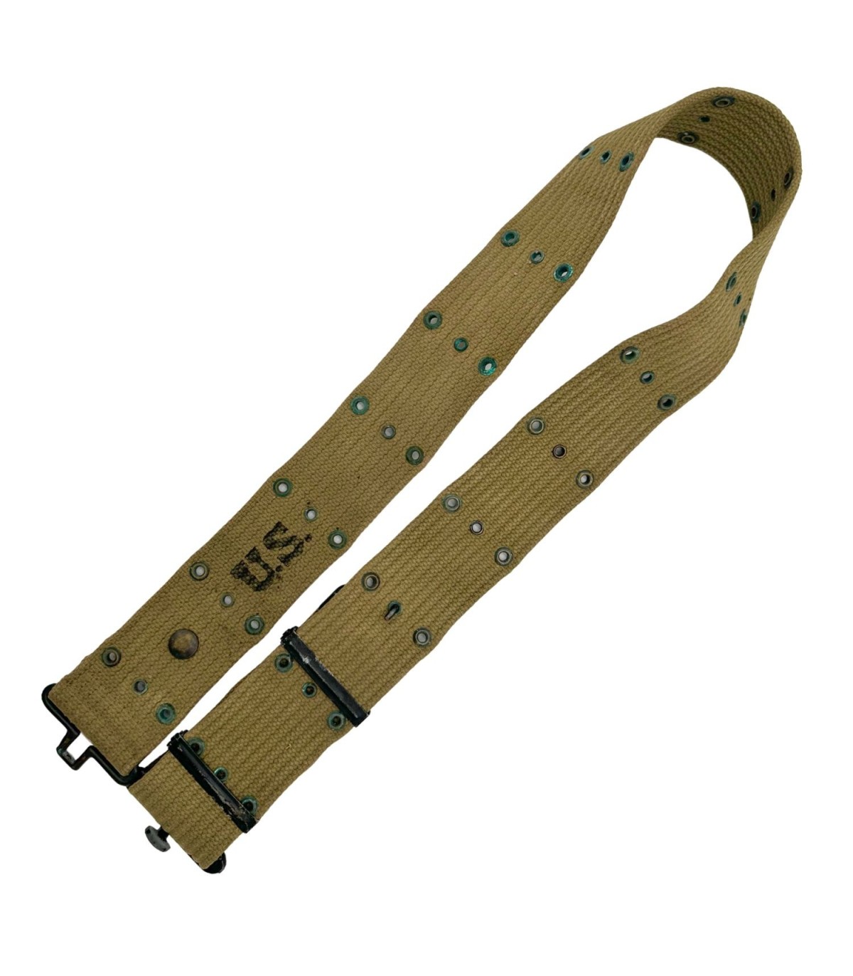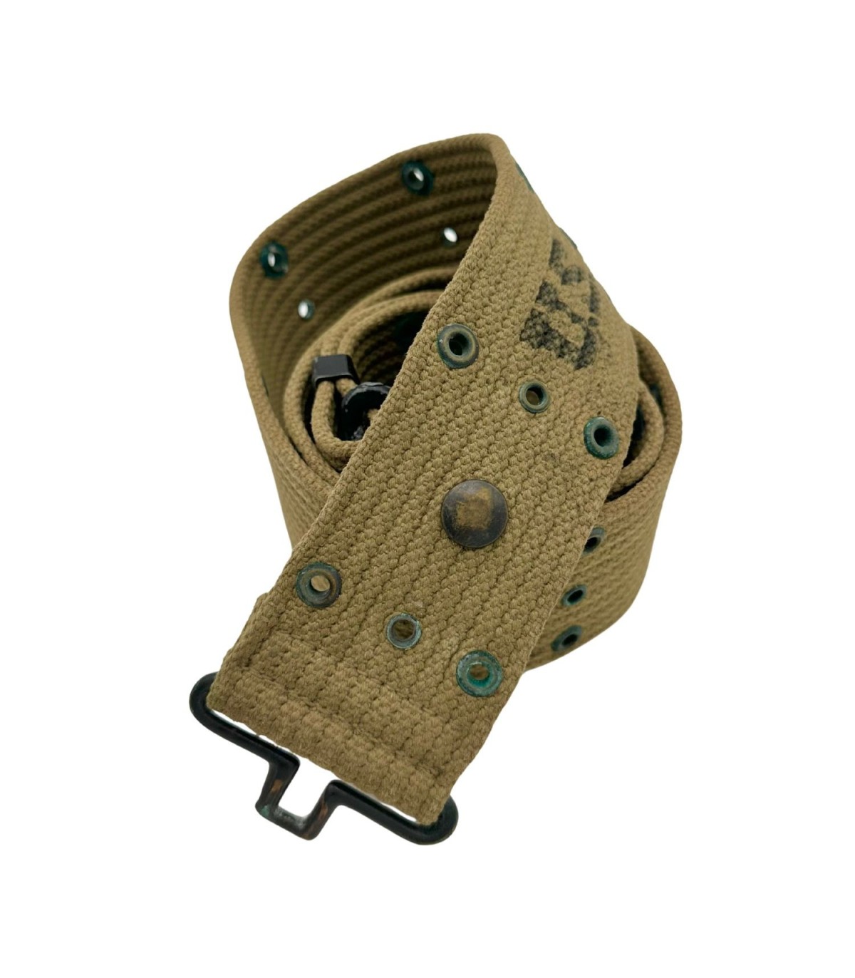 Ceinturon M-1936 en toile d'origine pour les soldats de l'armée américaine. Ce ceinturon permettait au soldat d'accrocher sa gourde, sa pochette a pansement, sa baïonnette etc... Il est en très bon état avec ses œillets et crochets.