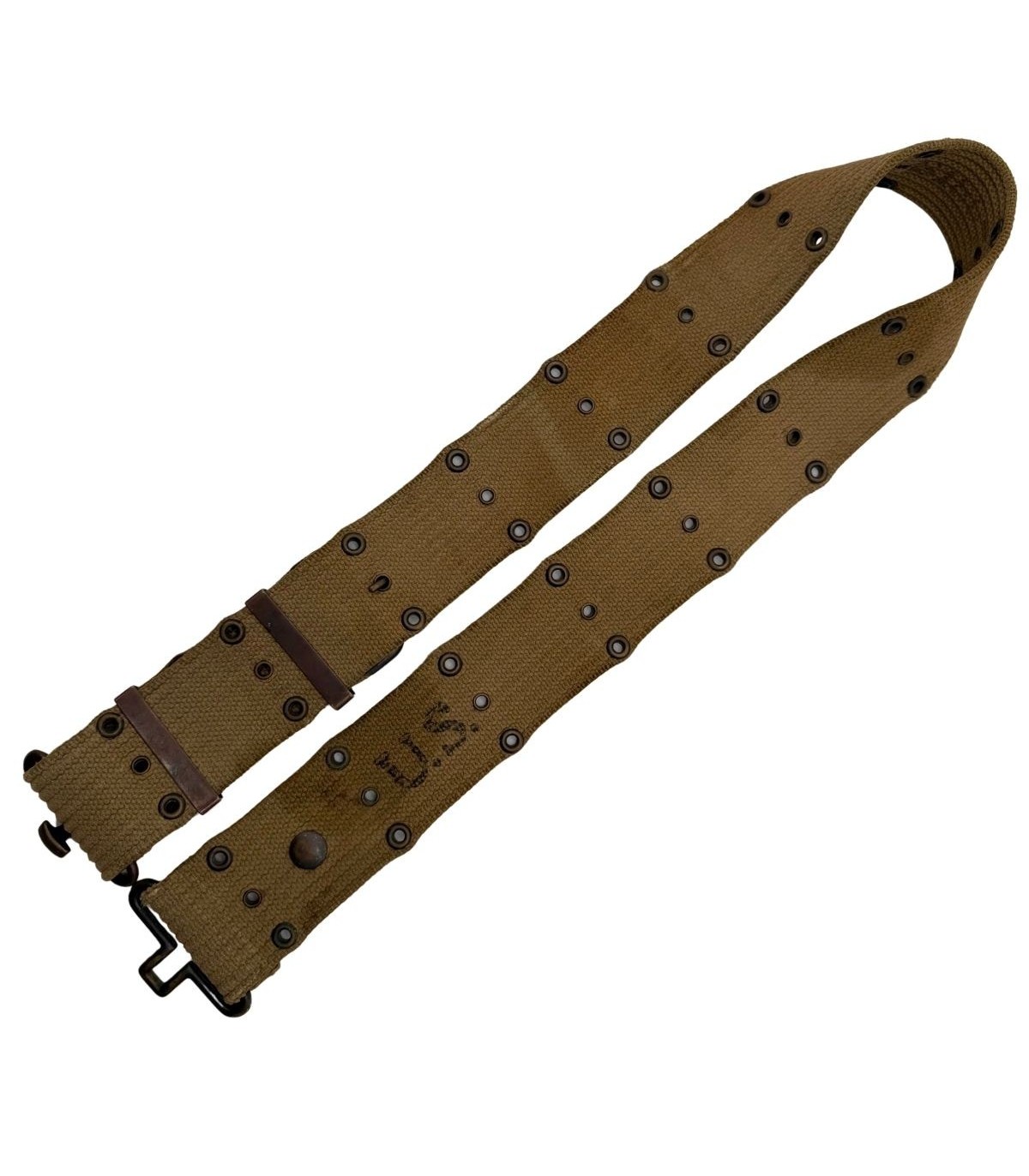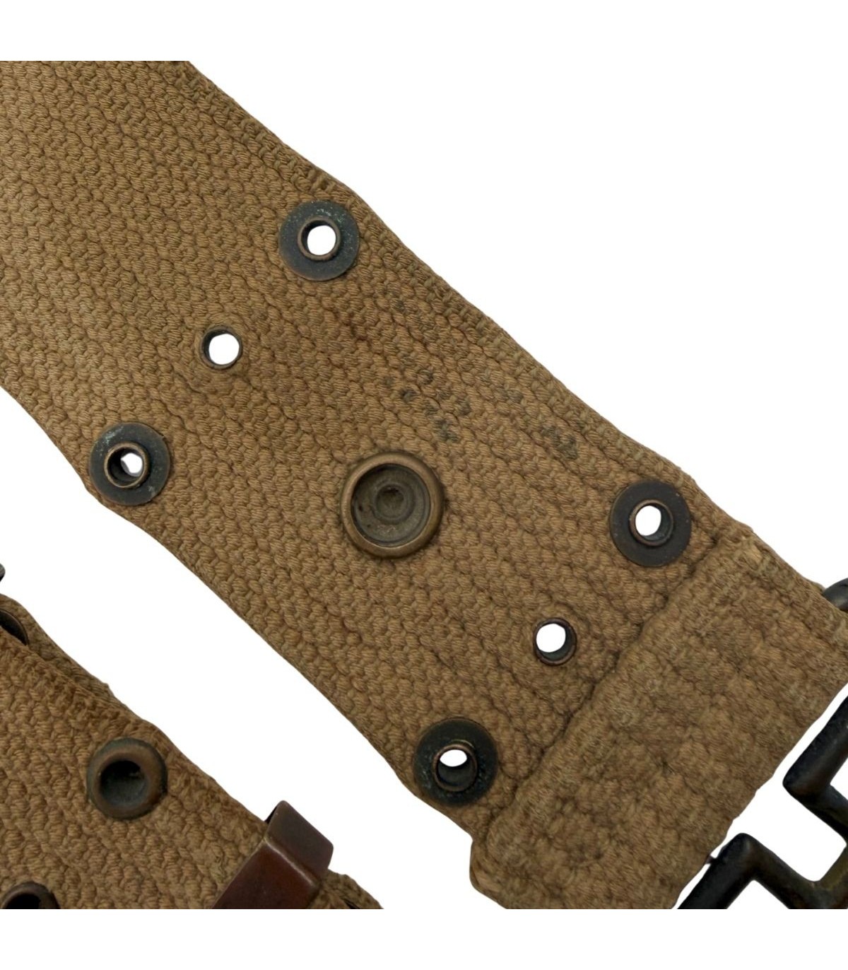 Ce qui distingue ce ceinturon d'une pièce de stock anonyme, c'est la présence d'un Laundry Number (B-1887) soigneusement marqué à l'intérieur. Ce code, composé de l'initiale du nom de famille du soldat et des quatre derniers chiffres de son matricule (Army Serial Number), est la signature personnelle de son propriétaire d'origine. C'est une porte ouverte sur l'histoire : avec ce numéro, il est possible d'effectuer des recherches dans les bases de données militaires pour tenter d'identifier le soldat "B" et son unité.
