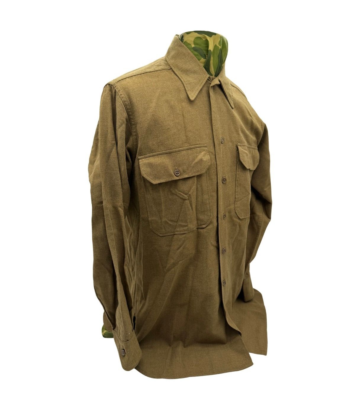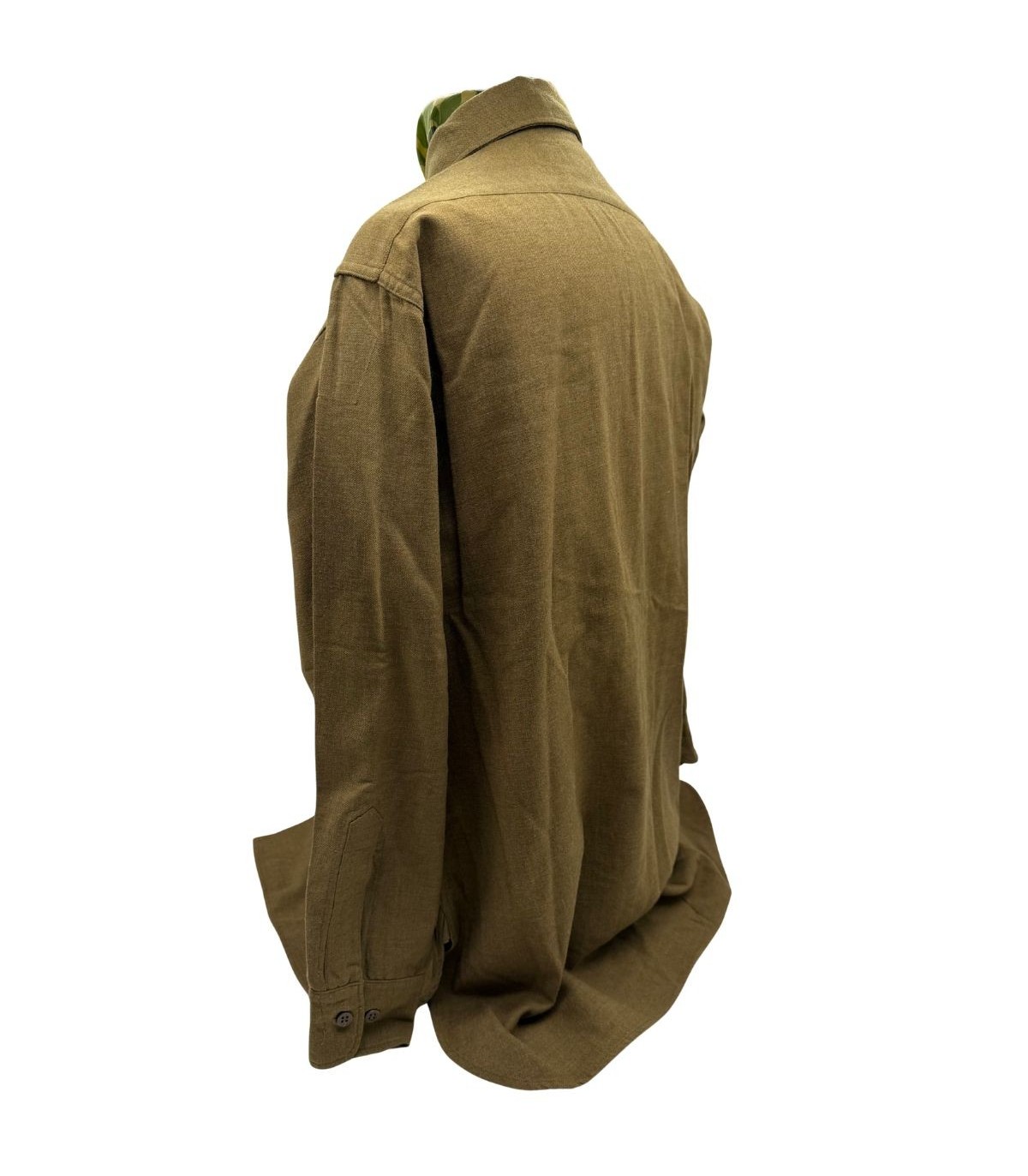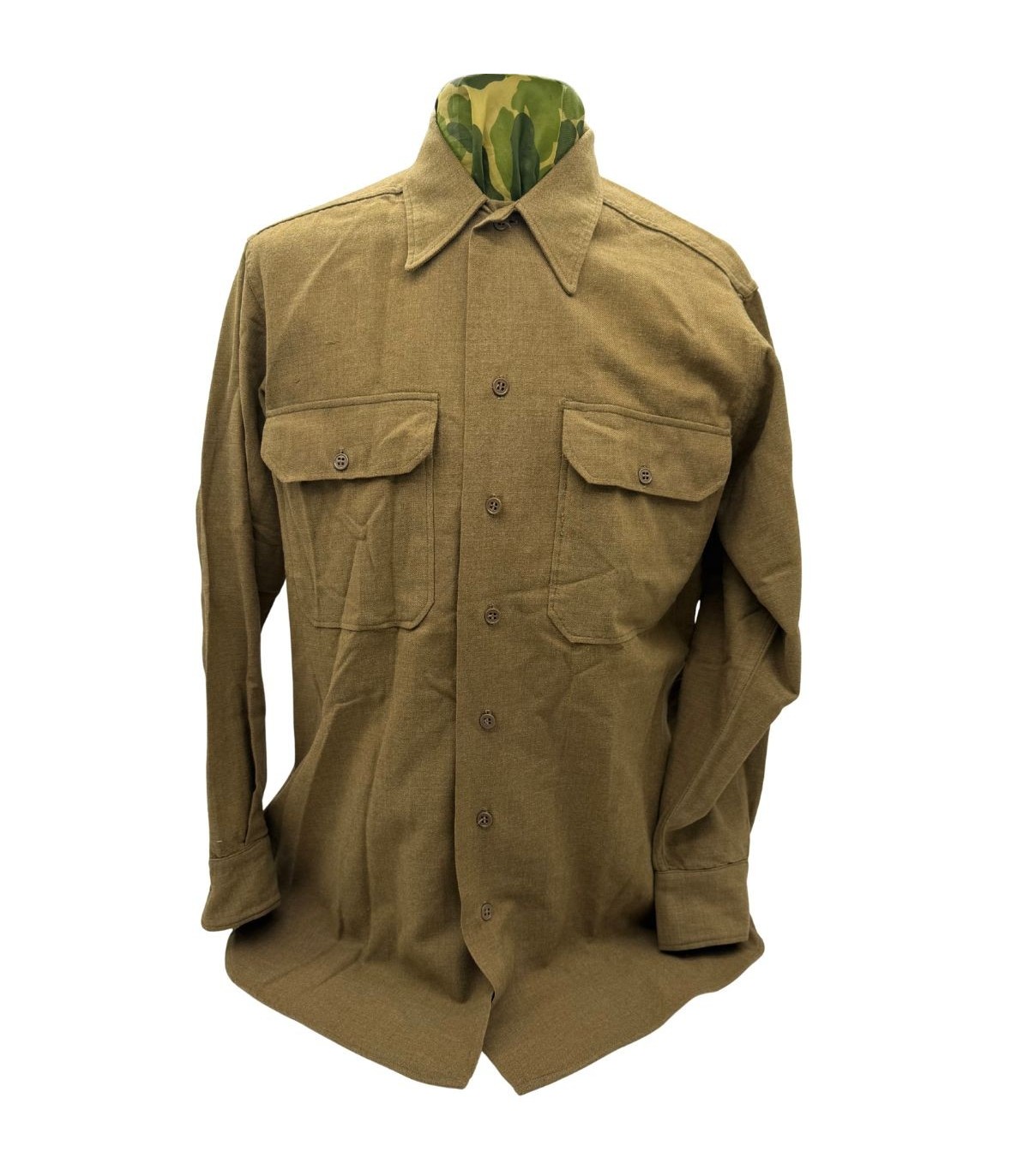 Chemise réglementaire US Army originale – Enlisted Man (troupe) en flanelle de laine légère Olive Drab Shade 33, portée par l’ensemble des soldats américains durant la Seconde Guerre mondiale. Indispensable sous une veste M-41, M-43 ou portée seule en tenue de service.