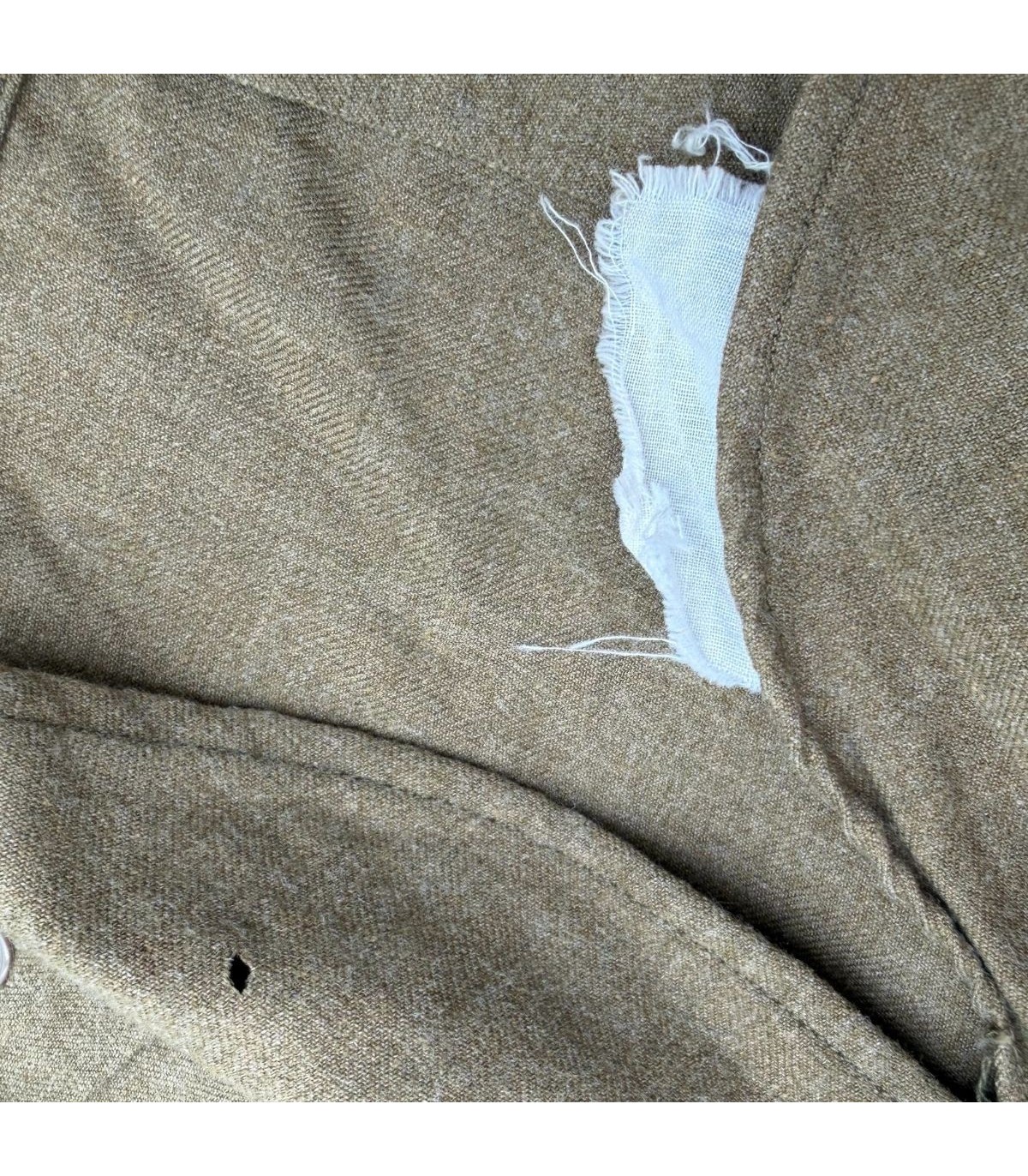 Détails d'usage : On note la présence de deux petits trous d'épingle, stigmates classiques du port d'insignes (D.I. ou rubans de médailles) ou de pin's de l'époque. Ces marques sont très discrètes et n'altèrent pas l'esthétique générale.
