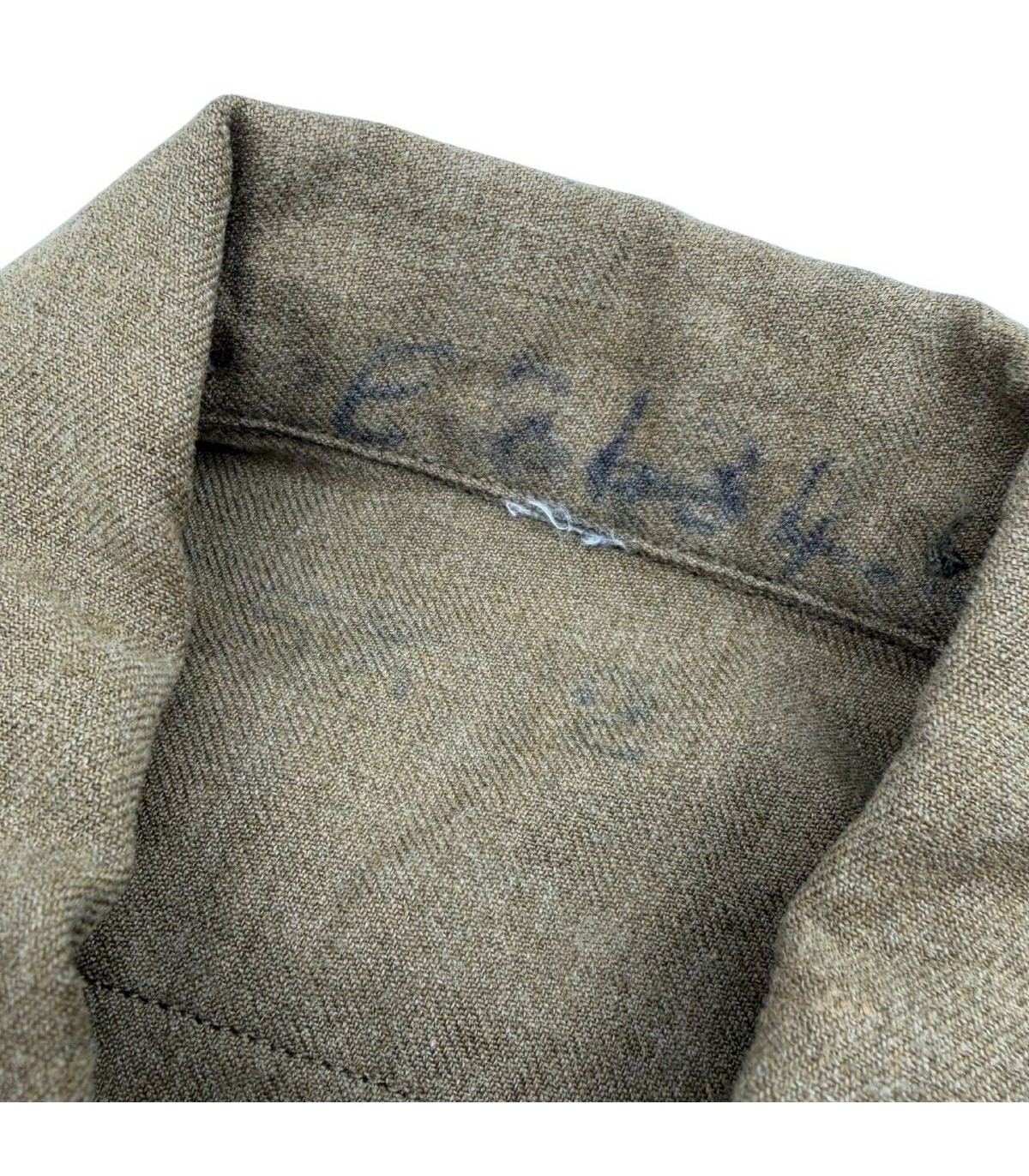 Étiquette Fabricant : Bien que délavée par le temps et les lavages en campagne, l'étiquette de contrat en tissu est toujours présente dans le bas de la chemise, garantissant son origine militaire officielle.