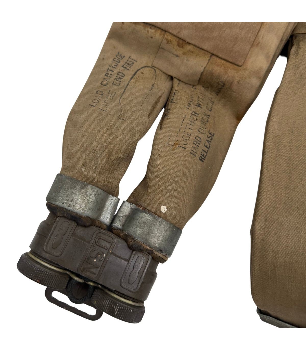 Cet exemplaire original présente un état de conservation exceptionnel. Le matériau est resté souple, sans craquelures ni durcissement. Il s’agit d’un modèle précoce à trois pressions, avec marquages de contrat parfaitement lisibles. Fabriquée par US Rubber Co et datée du 20 septembre 1943, idéale pour une vitrine ou un mannequin de GI du Débarquement.