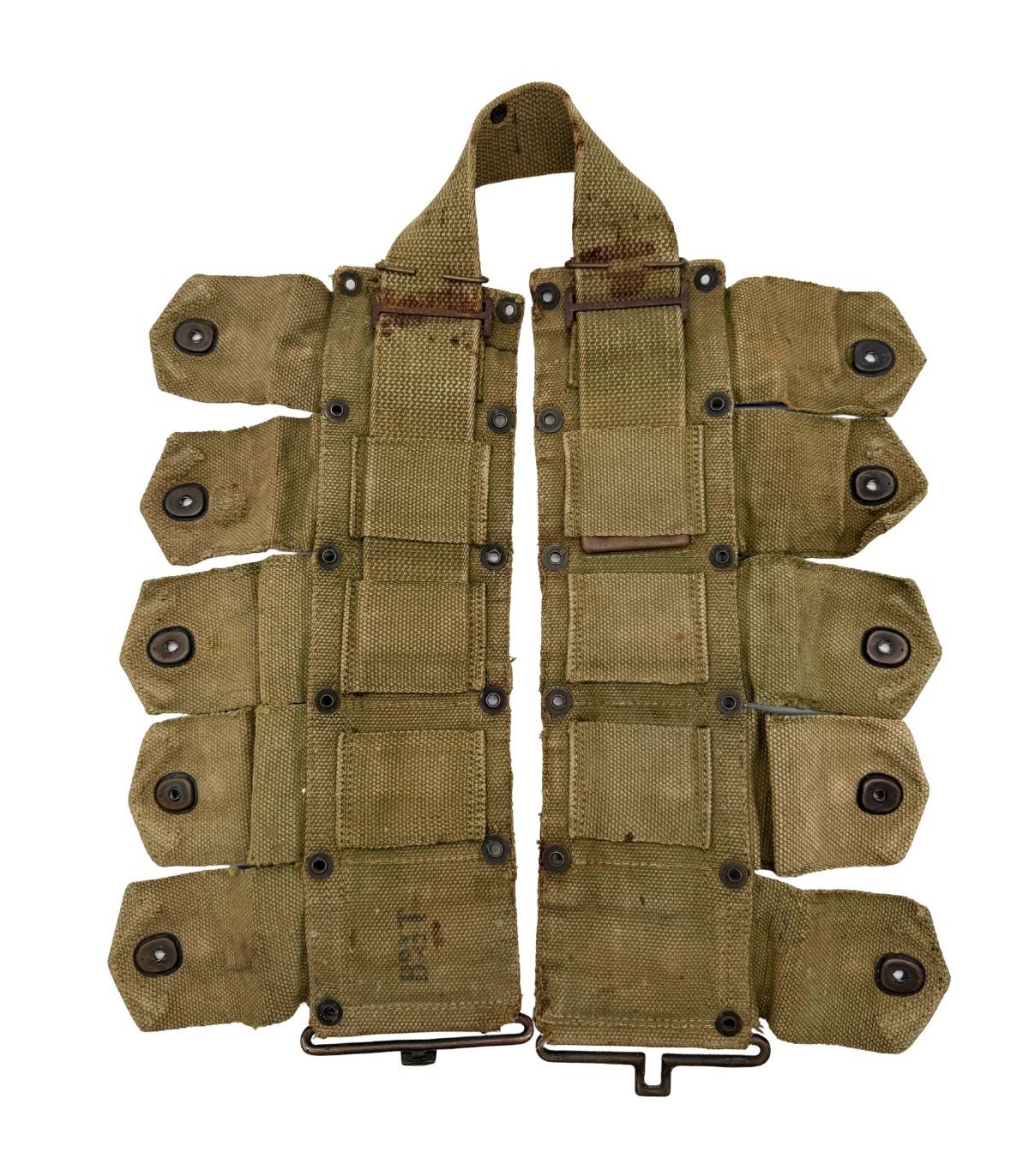 Équipement central du fantassin US WWII, le M-1923 permet d’emporter 10 clips de 8 cartouches pour le M1 Garand (80 coups). Base du brelage, il reçoit gourde, pelle et pochette pansement.