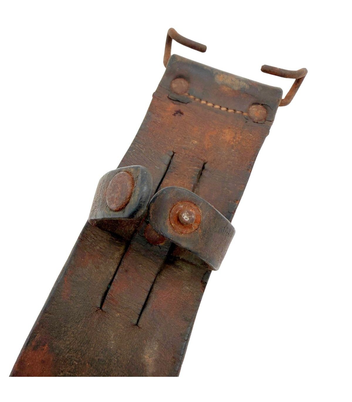 Détail technique : Un rivet est passé à travers le cuir mais il est toujours présent sur la pièce, préservant ainsi l'intégrité des composants d'origine.
