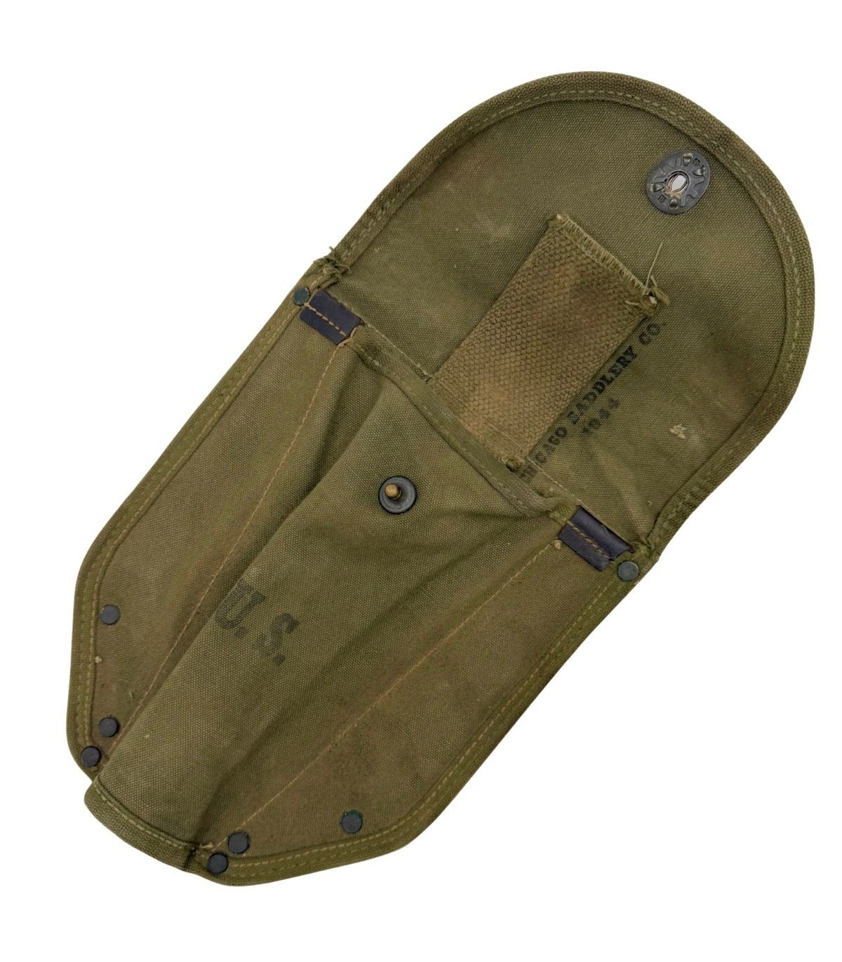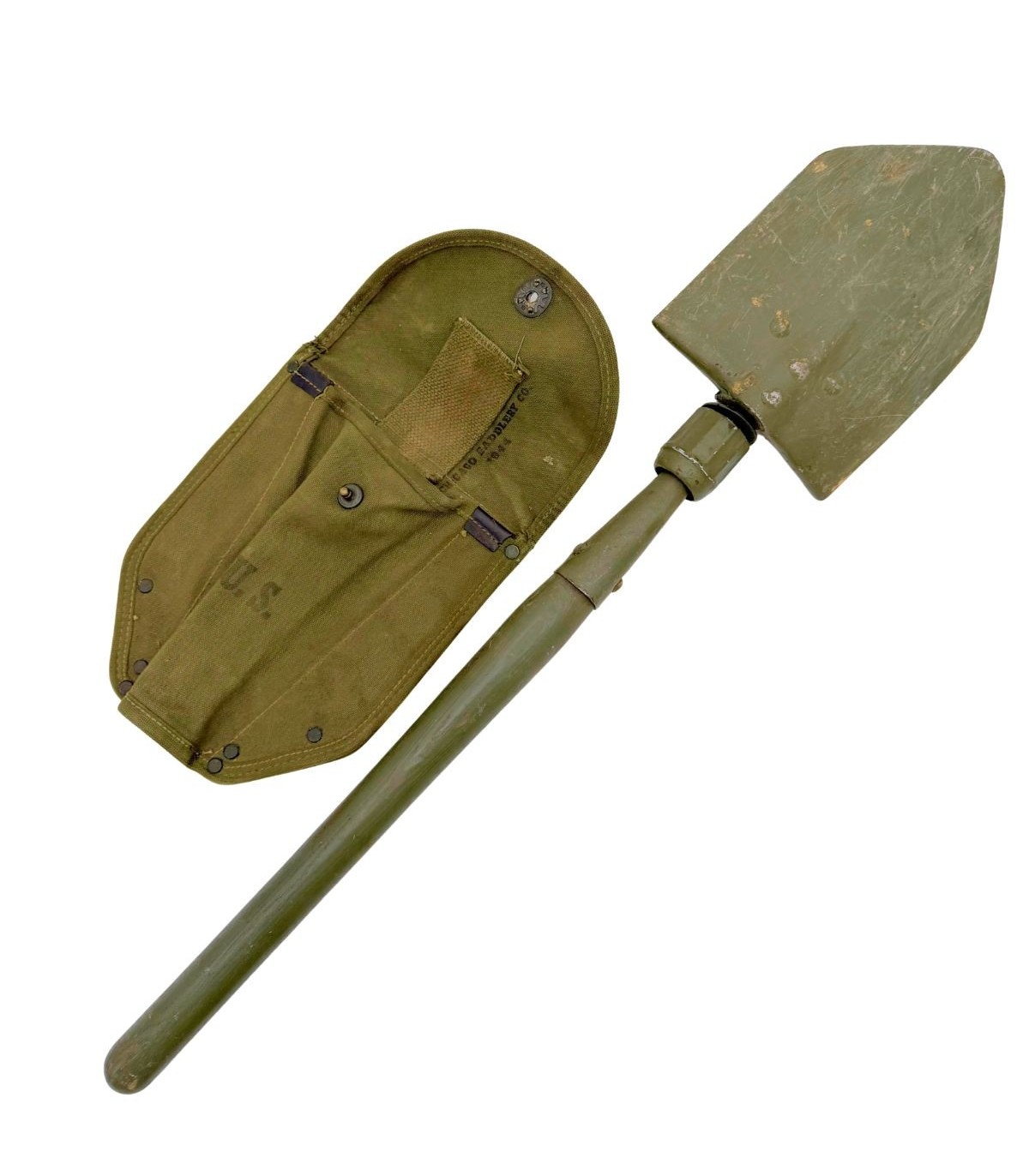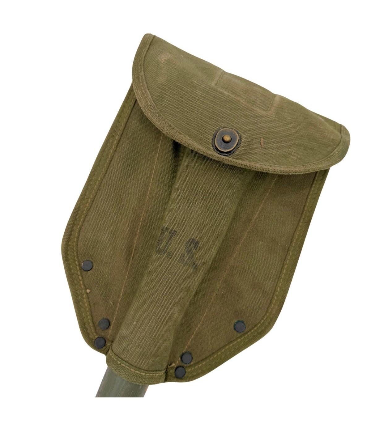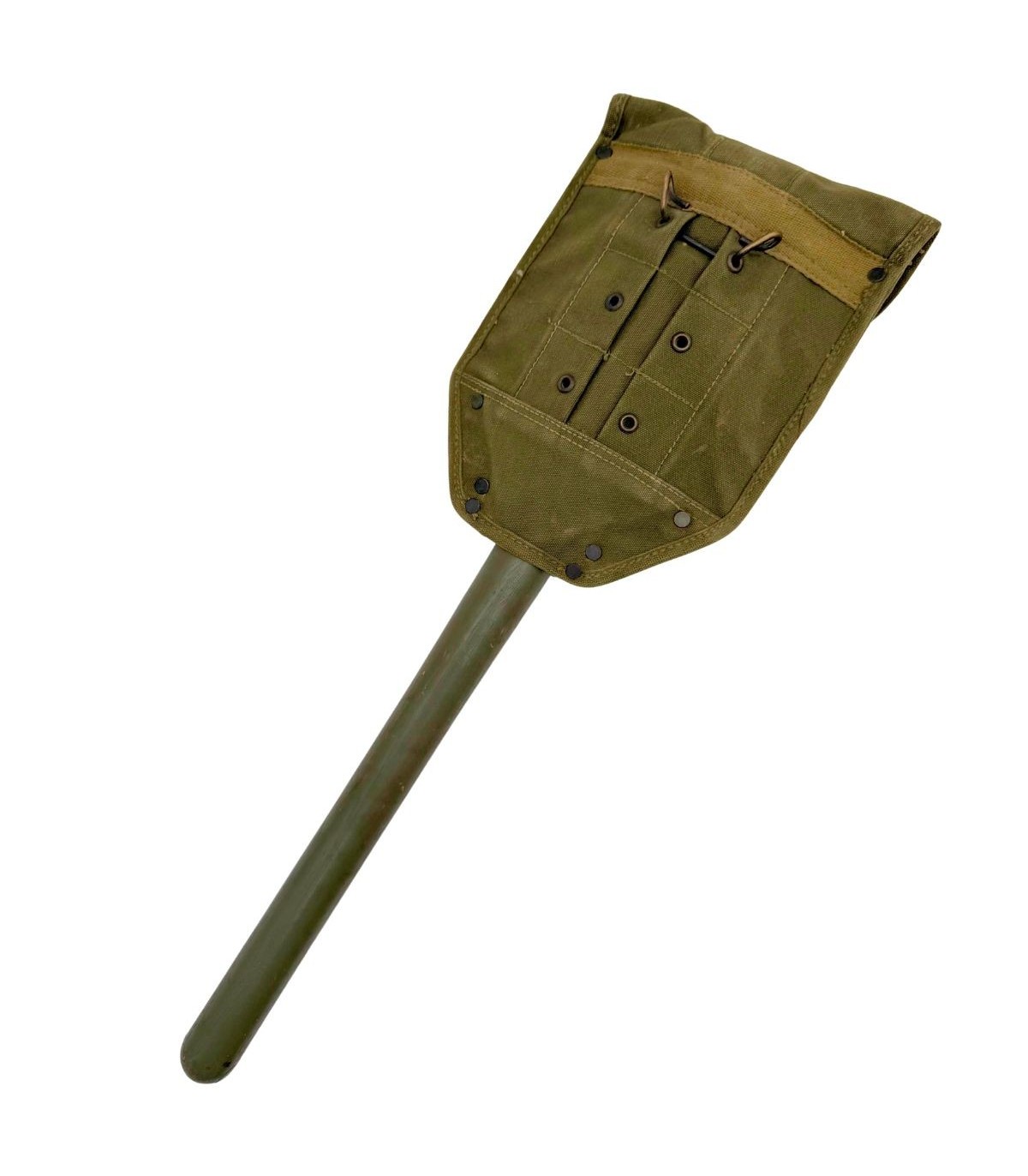 Général : Excellent état général. La toile de la housse est saine, de couleur OD#7 (vert olive foncé), et le fer de la pelle conserve une grande partie de sa peinture d'origine.
