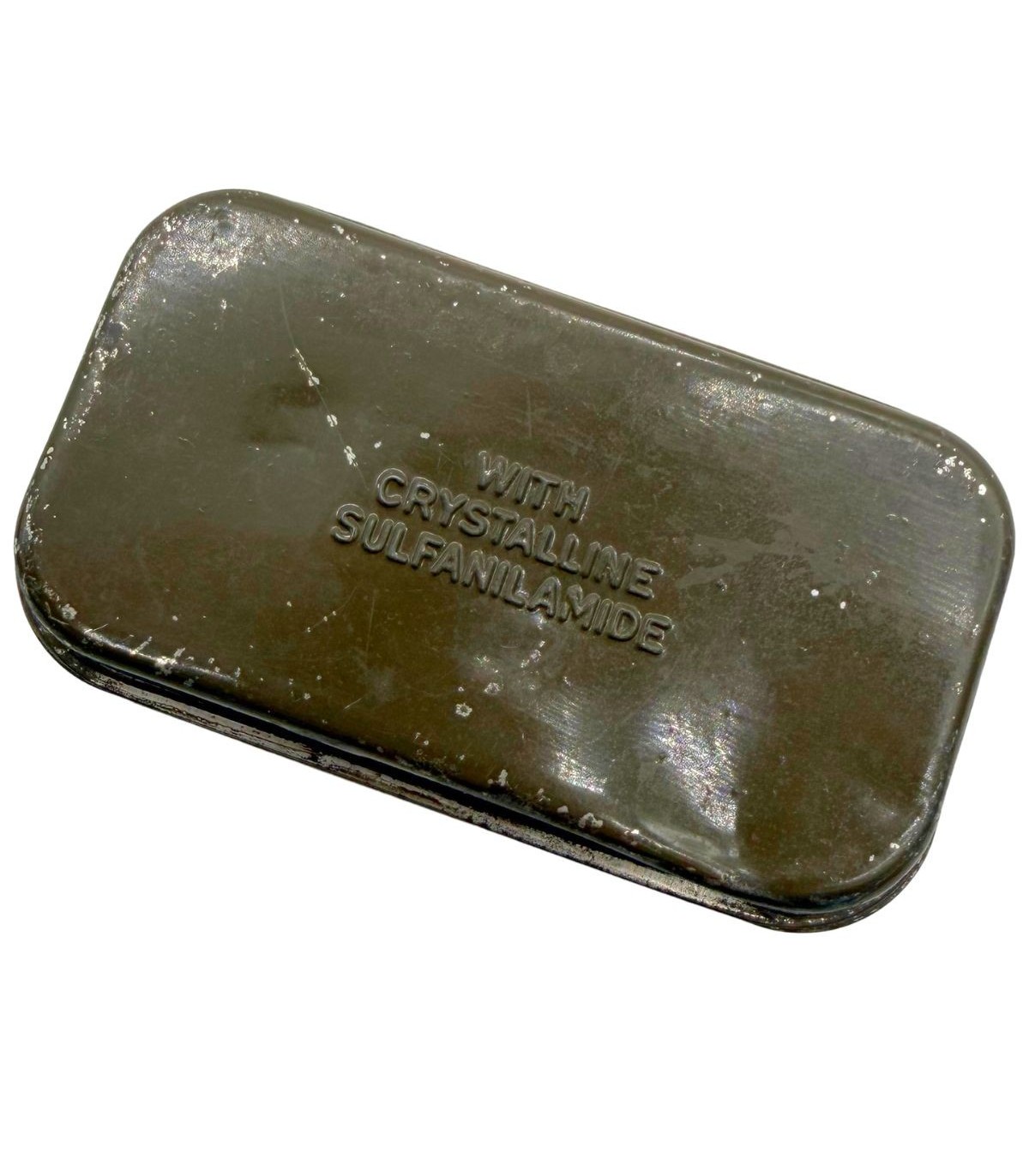 Cet exemplaire spécifique porte l'inscription emboutie directement sur le métal : "With crystalline sulfanilamide".