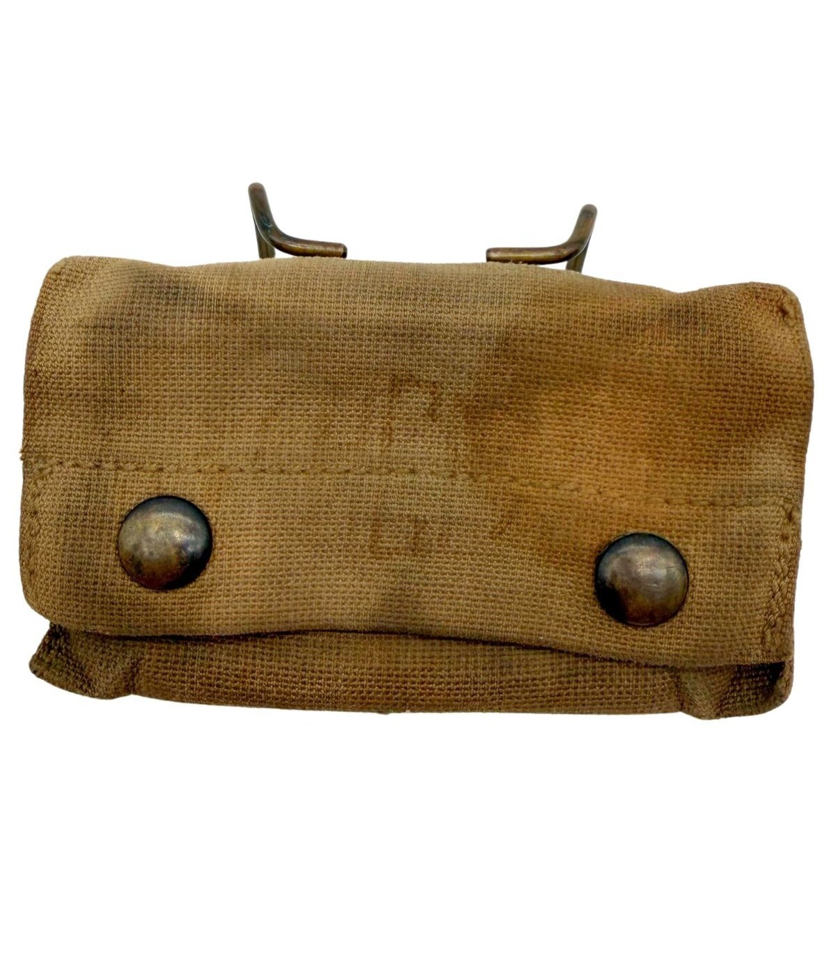 Cette pochette à pansement (First Aid Pouch) modèle M-1910 est une véritable pièce d'histoire. Fabriquée par le contractant JPS en 1917, elle nous plonge au cœur de l'entrée en guerre des États-Unis lors du premier conflit mondial. Conçue pour être fixée aux œillets du ceinturon cartouchière ou du "Pistol Belt", elle était l'accessoire de survie indispensable de chaque soldat de l'American Expeditionary Forces (AEF). Sa longévité est telle qu'elle a souvent repris du service au début de la Seconde Guerre mondiale au sein de l'US Army.
