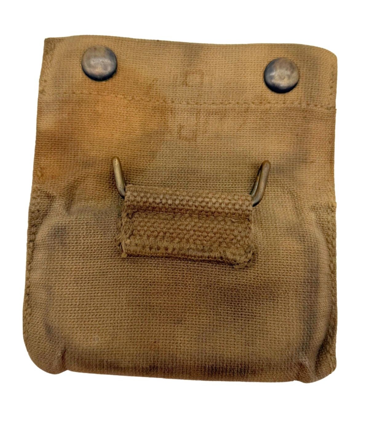 Cet exemplaire se présente dans un bel état terrain, offrant cette patine unique que seule une pièce ayant traversé les décennies peut posséder. Point essentiel pour le collectionneur : malgré son âge et son utilisation, la toile ne présente ni déchirure ni trou. La structure en coton épais (Webbing) est restée solide et intègre. Les pressions sont parfaitement fonctionnelles, permettant d'ouvrir et de fermer le rabat sans risque, un détail important pour une pièce centenaire souvent fragilisée par le temps.