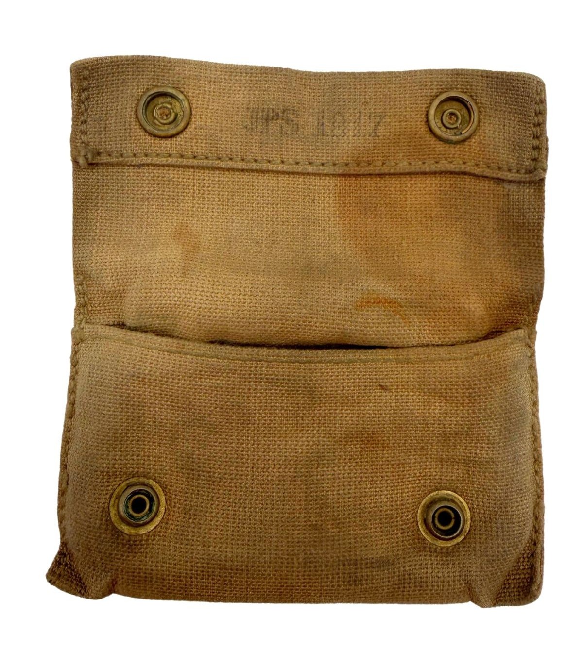 À l'intérieur de la pochette, le marquage du fabricant JPS ainsi que la date 1917 sont encore bien identifiables, garantissant l'origine de l'objet. Ce modèle M-1910 est la base de tout paquetage américain du XXe siècle. Que vous souhaitiez compléter une silhouette de "Doughboy" de 1918 ou illustrer l'équipement d'un GI en 1941, cette pochette apporte une touche de réalisme et d'histoire qu'aucune copie ne peut égaler.