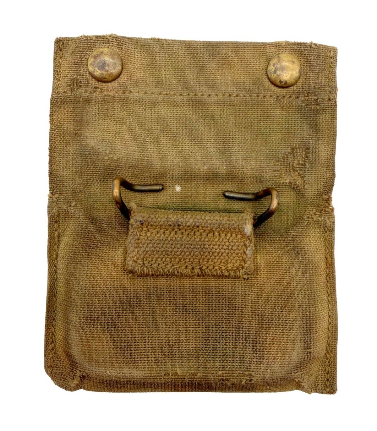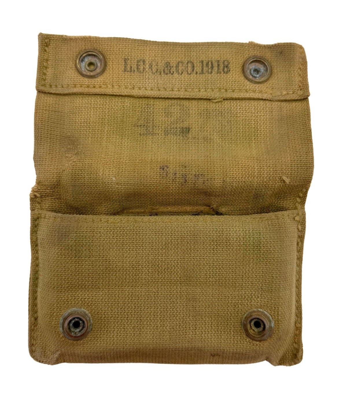 Malgré son aspect de terrain, cette pochette est restée parfaitement fonctionnelle. Les pressions sont opérationnelles, permettant une ouverture et une fermeture sans accroc. Le marquage du fabricant L. C. C. & Co. ainsi que la date 1918 sont bien identifiables à l'intérieur du rabat. Cette pièce est idéale pour compléter un ceinturon cartouchière ou un mannequin de combat, apportant cette touche de réalisme historique que seule une pièce ayant "vécu" peut offrir.