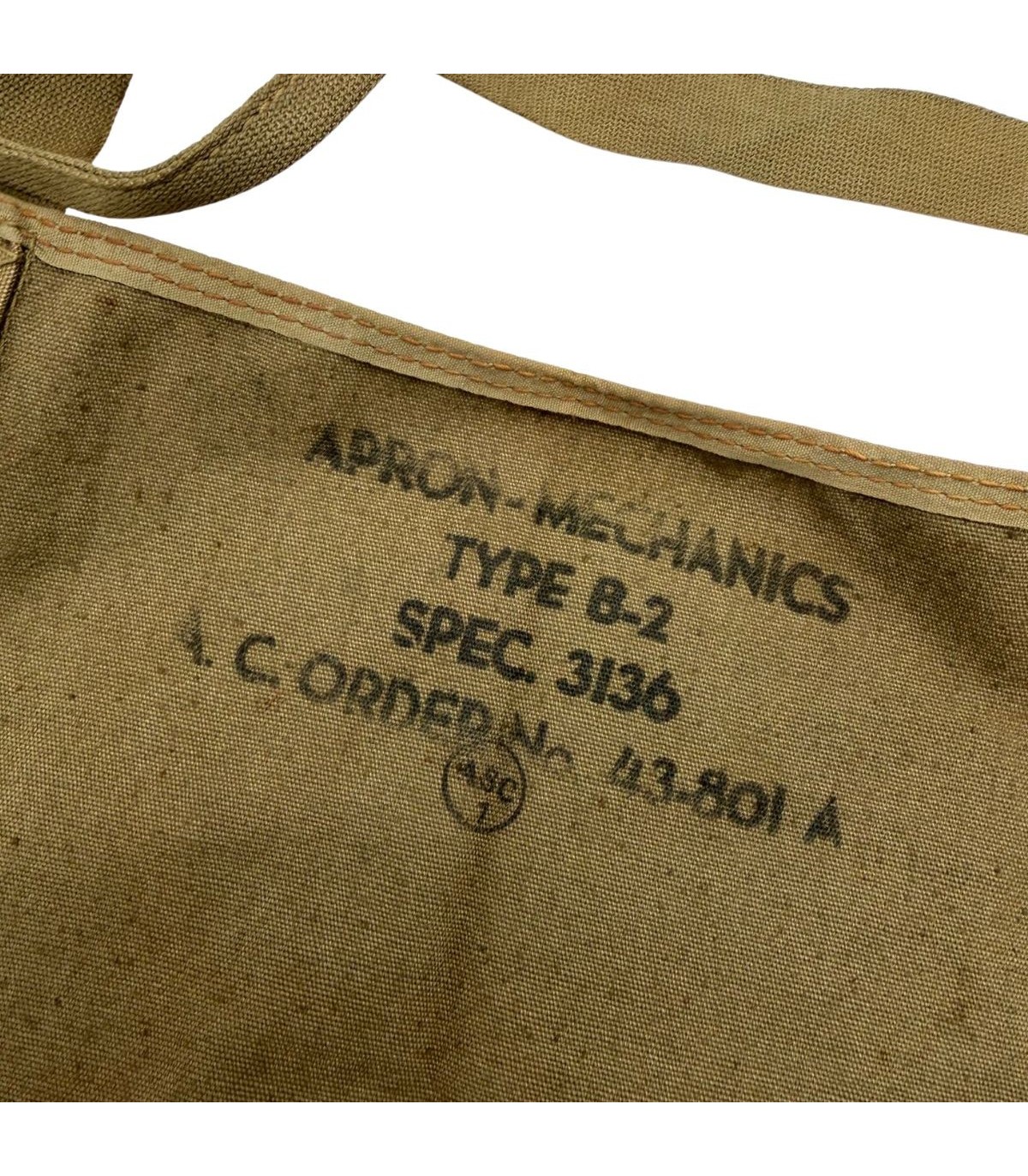Marquages : Le tampon de nomenclature "Apron-Mechanics Type B-2" ainsi que le contrat (Order No.) sont généralement imprimés sur le revers ou sur le haut de la bavette.