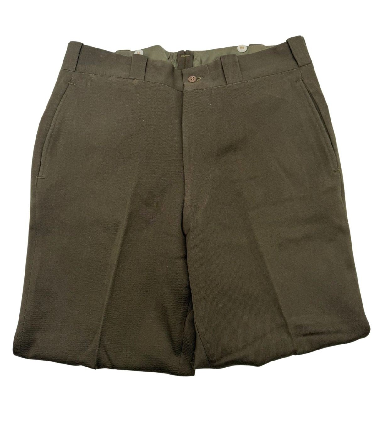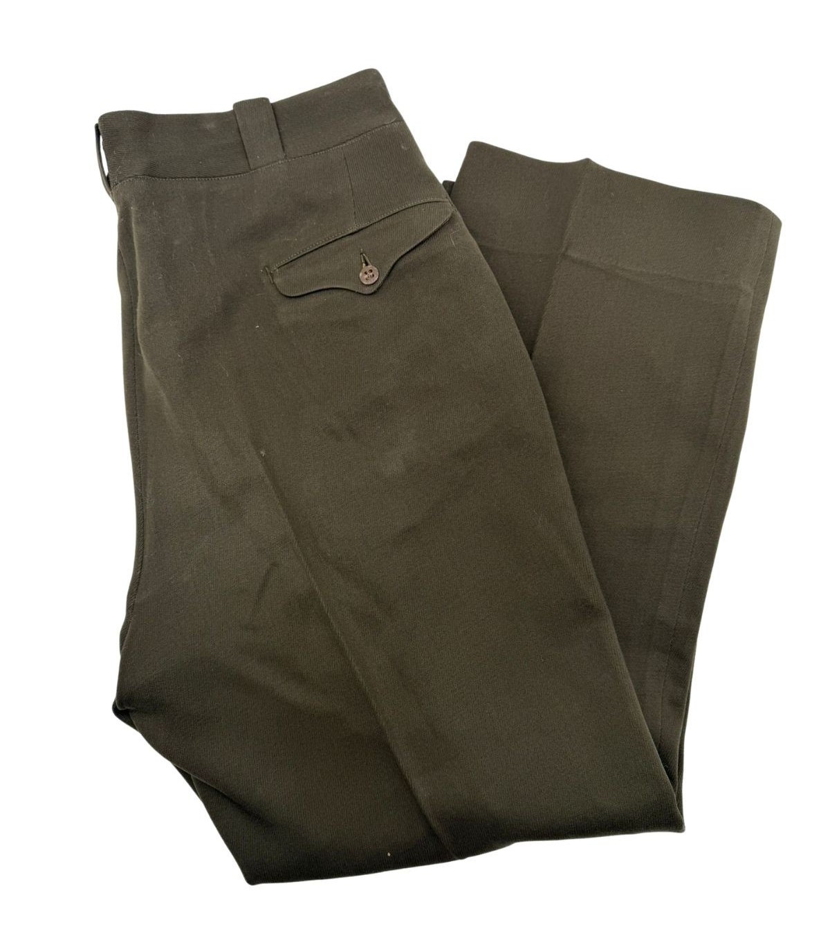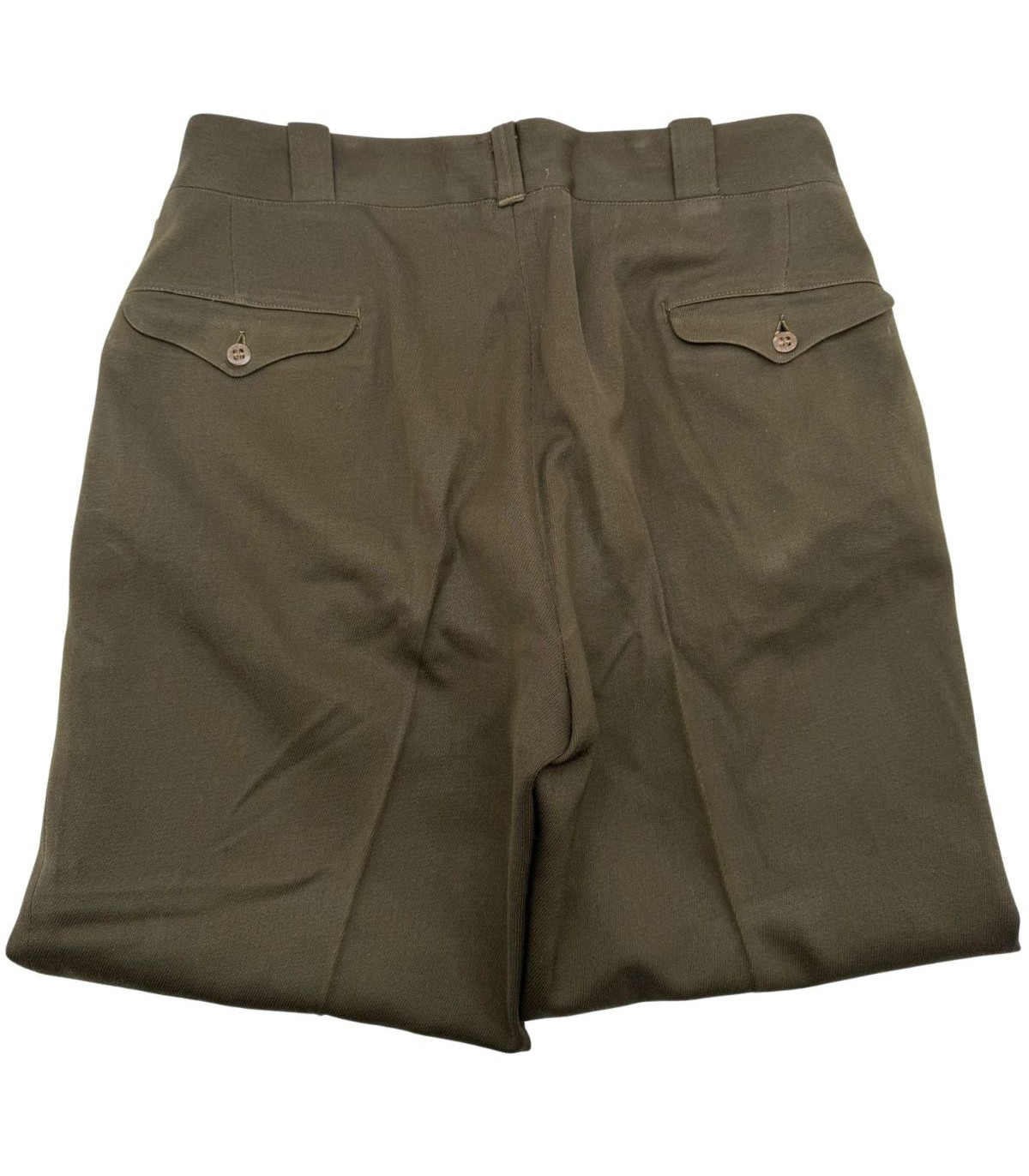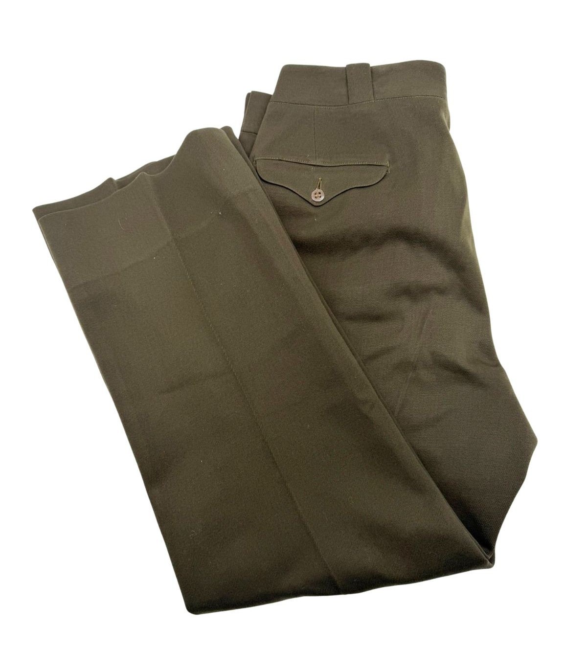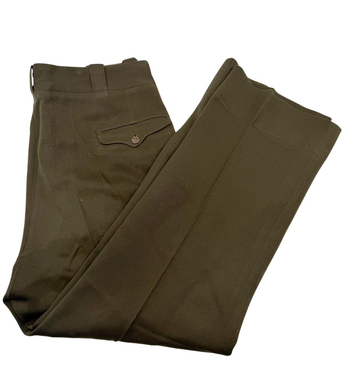 Ce pantalon est confectionné dans la célèbre nuance OD51 (Olive Drab n°51), dont la teinte chocolat profond servait de contraste élégant avec la chemise "Pink" ou la veste de sortie. C'est l'une des pièces les plus esthétiques de l'uniforme américain de la Seconde Guerre mondiale.