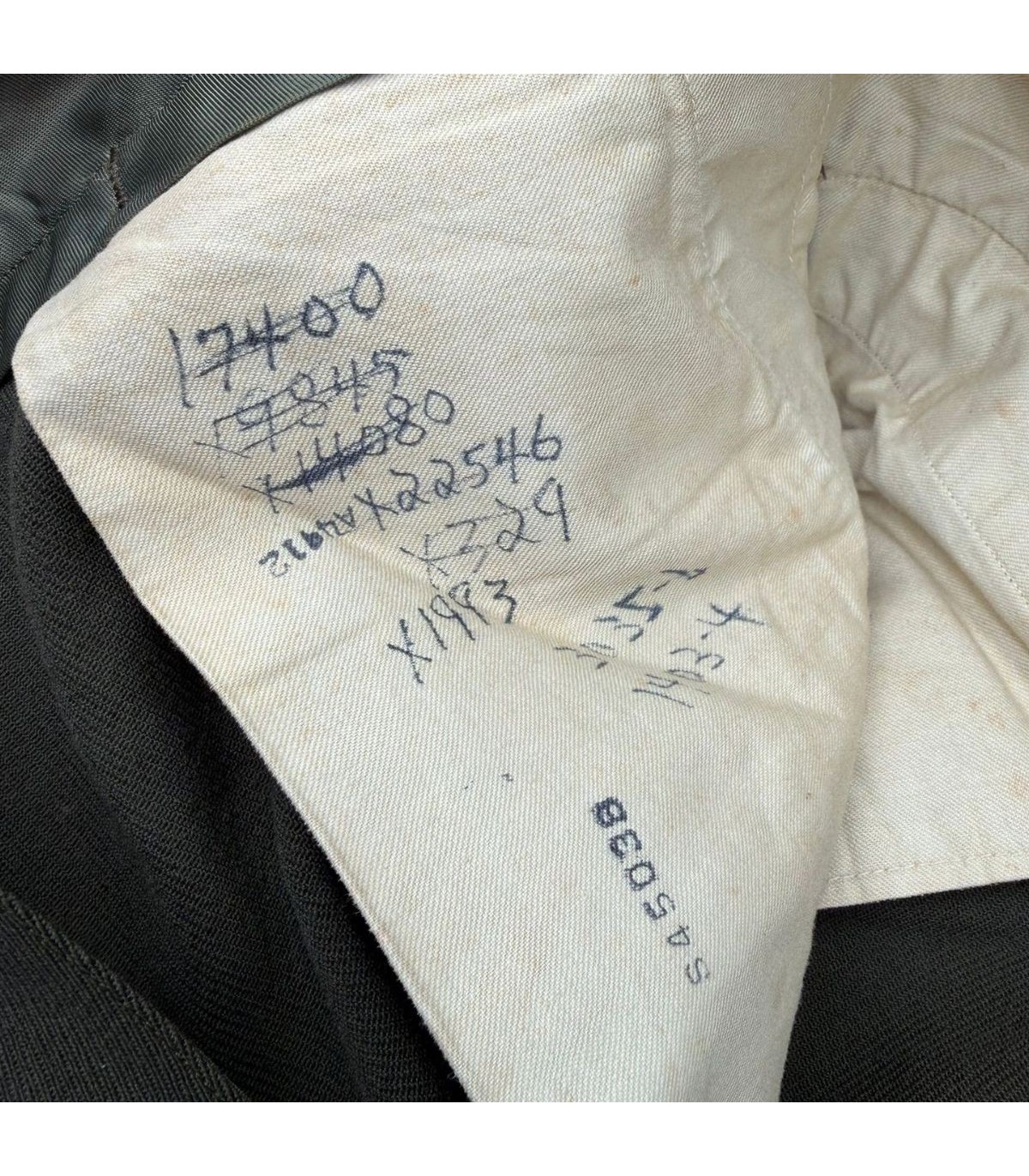Coupe années 40 : taille haute, jambes droites, poches latérales et arrière boutonnées. Présence d’un matricule manuscrit en poche, véritable atout historique.