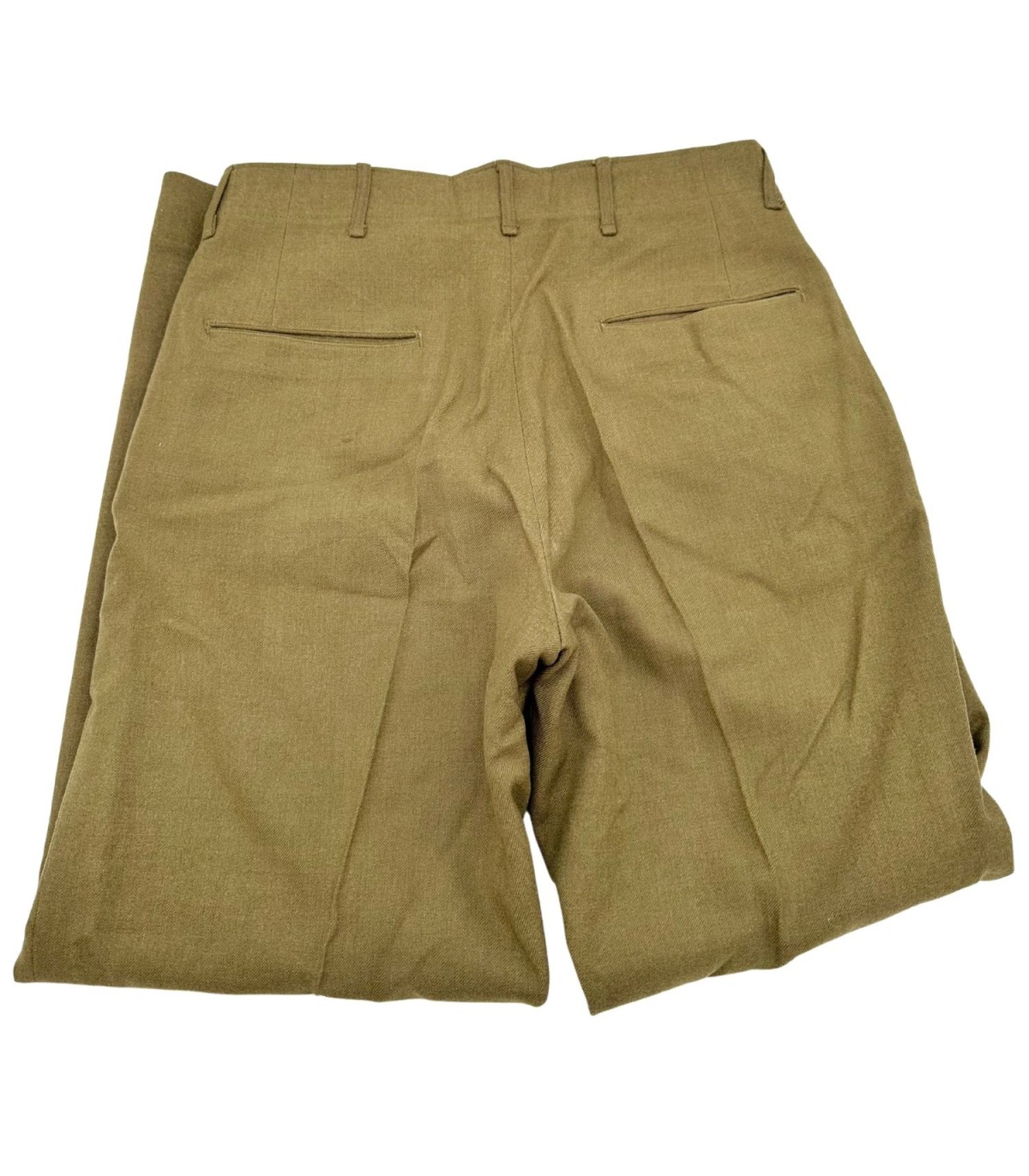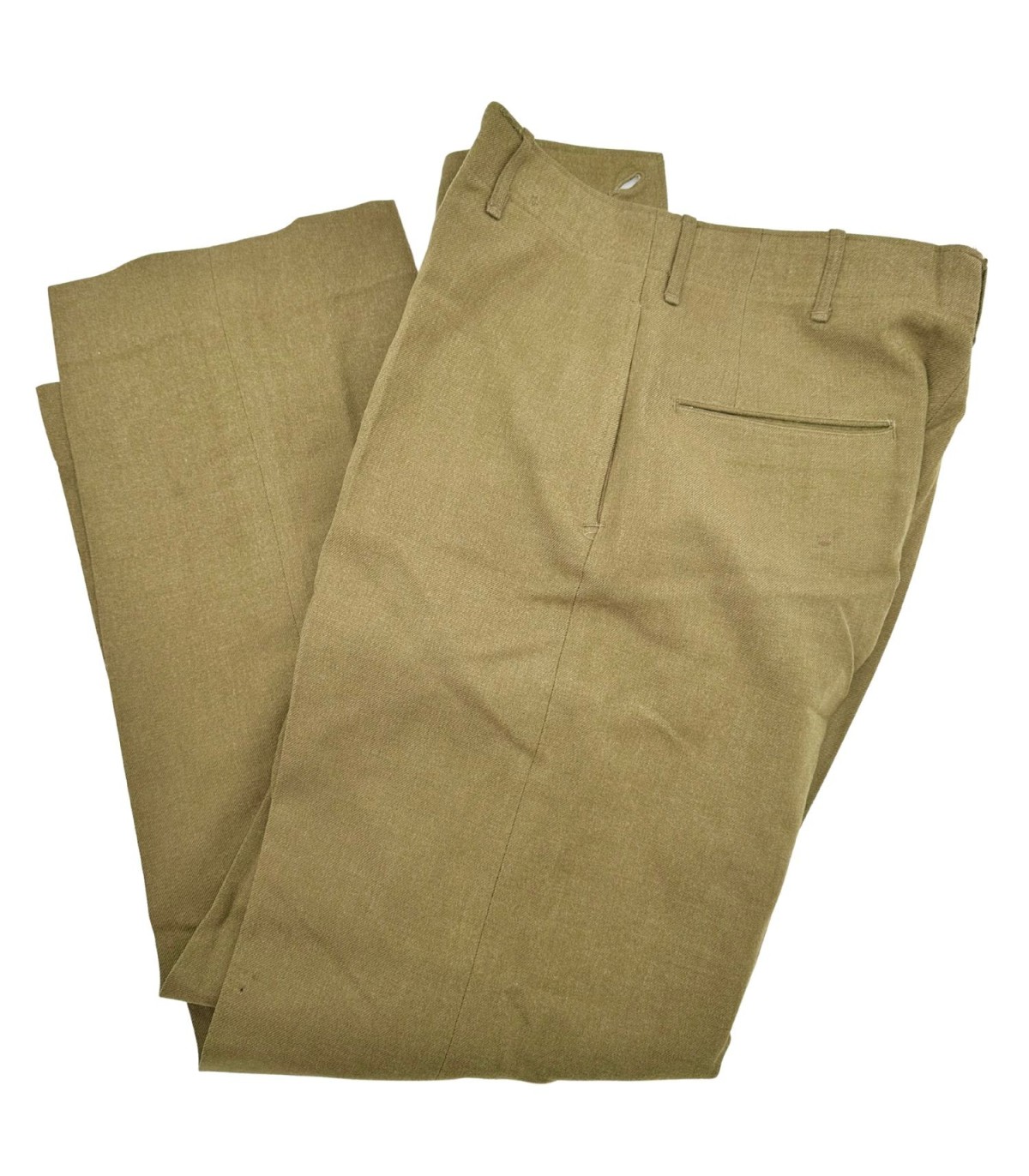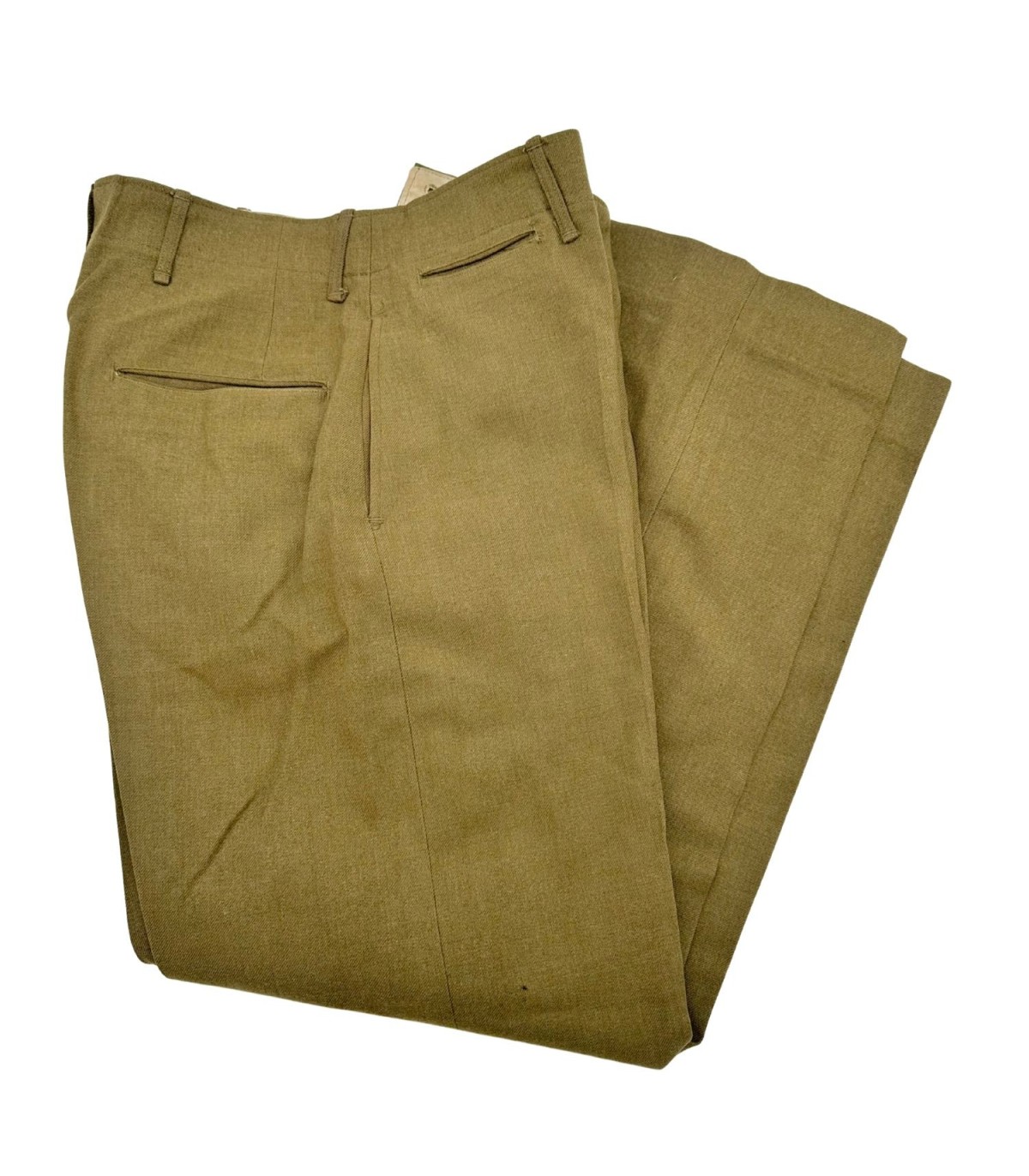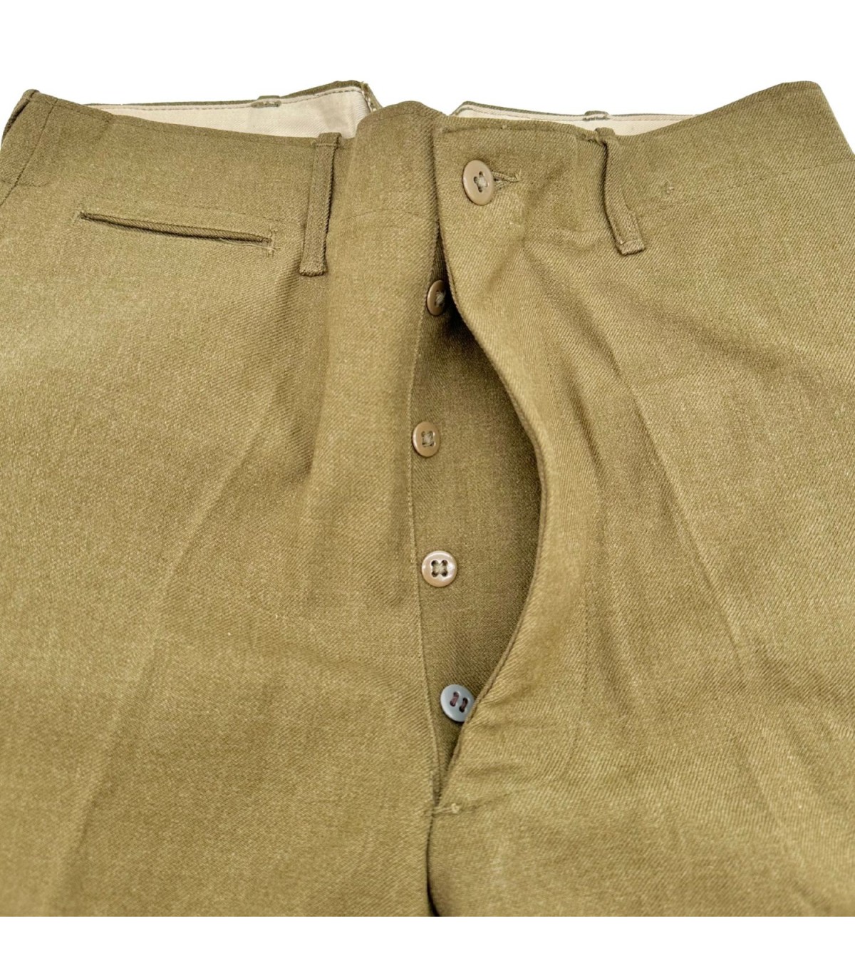 Confectionné dans une gabardine de coton robuste, il affiche une taille 34x33, un gabarit courant chez les soldats américains de l’époque. Le tissu présente une usure légère, parfaitement cohérente avec son âge, ce qui renforce son authenticité sans compromettre sa solidité. Les coutures sont d'origine, tout comme les boutons métalliques estampillés "U.S. Army", encore bien fixés.